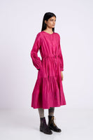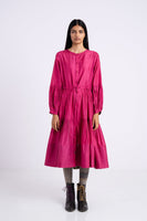 Round neckline front open button down tier dress with gathers, full puff sleeve, tye up detail on the waist line. Constructed in solid 100% silk fabric with quilting detail on hem. Finished with contrast handblock print facing detail.