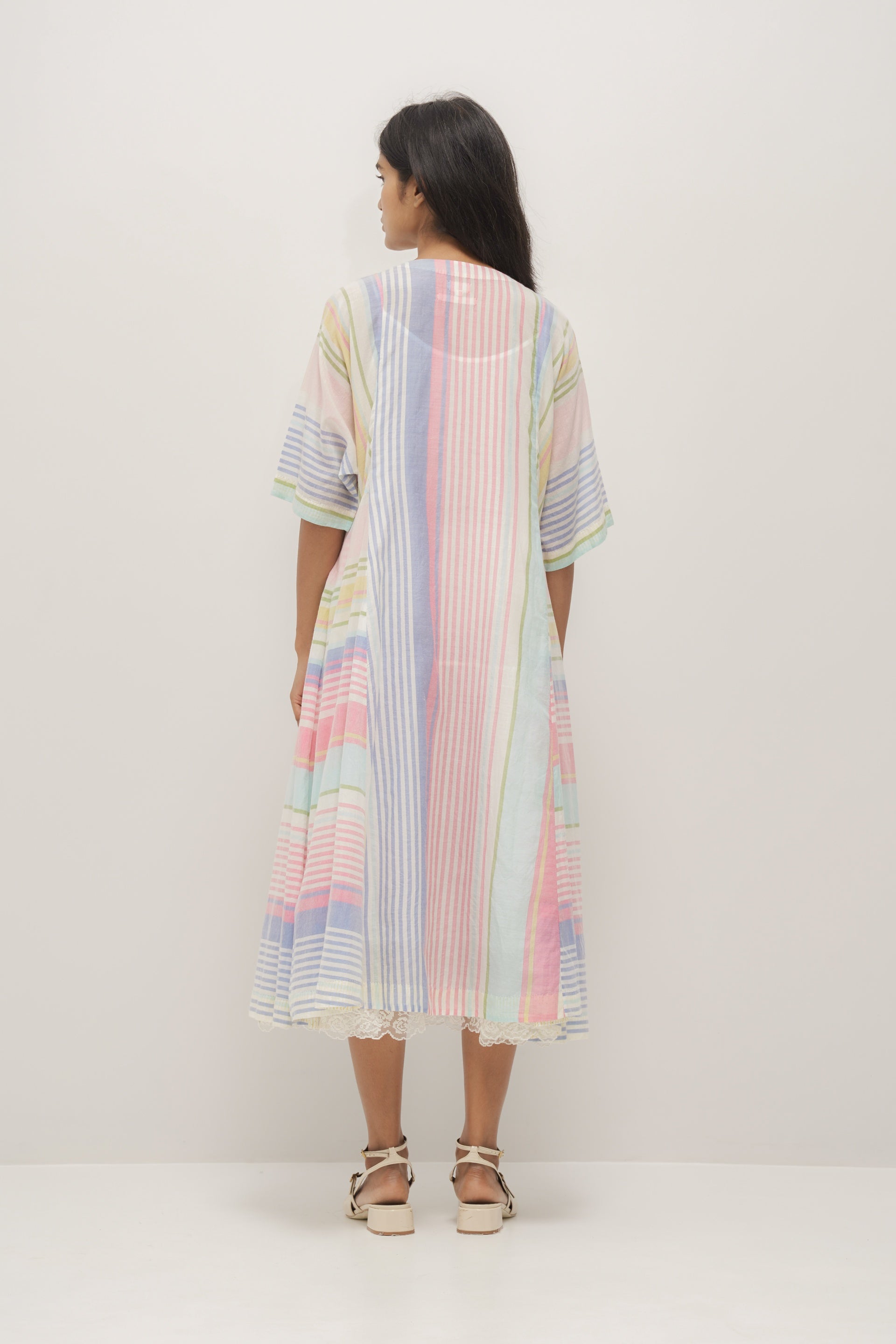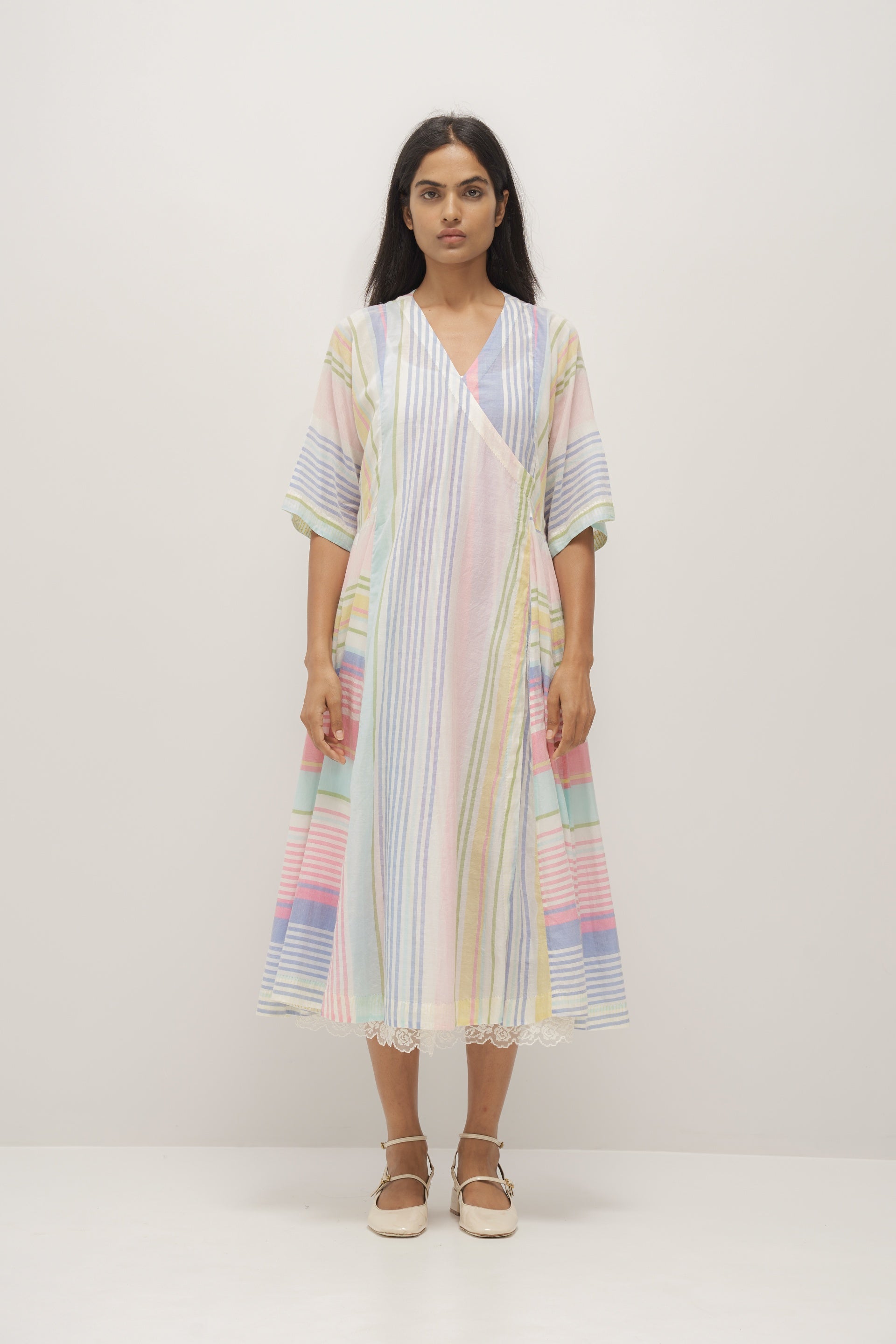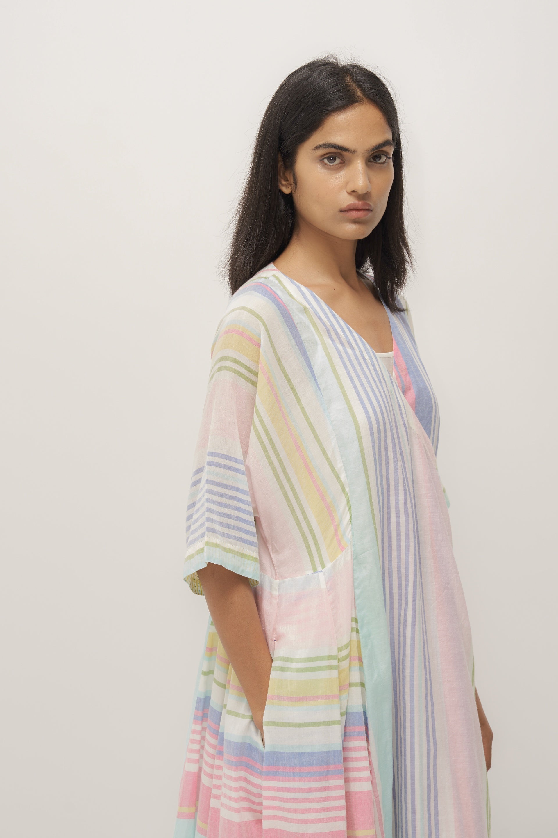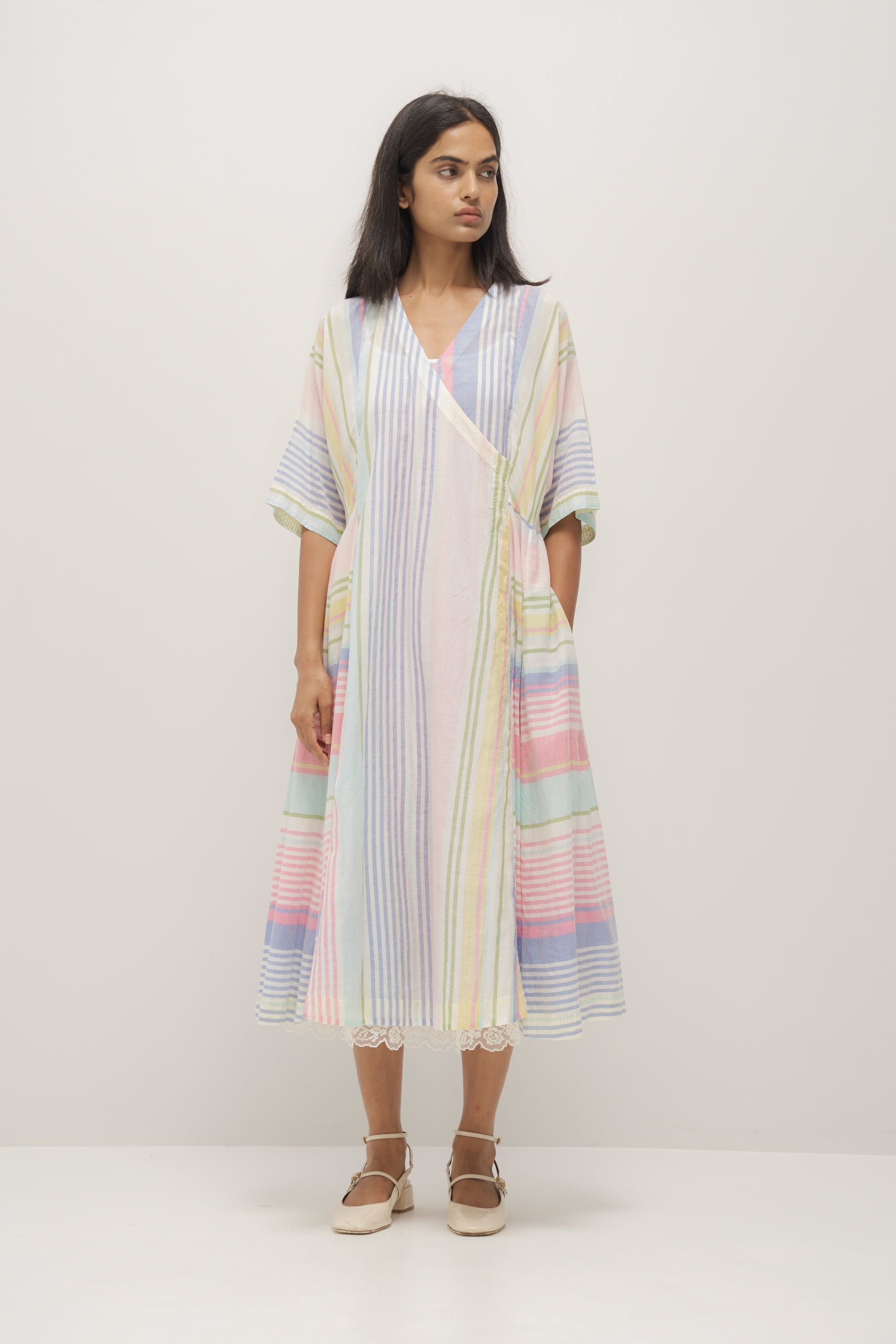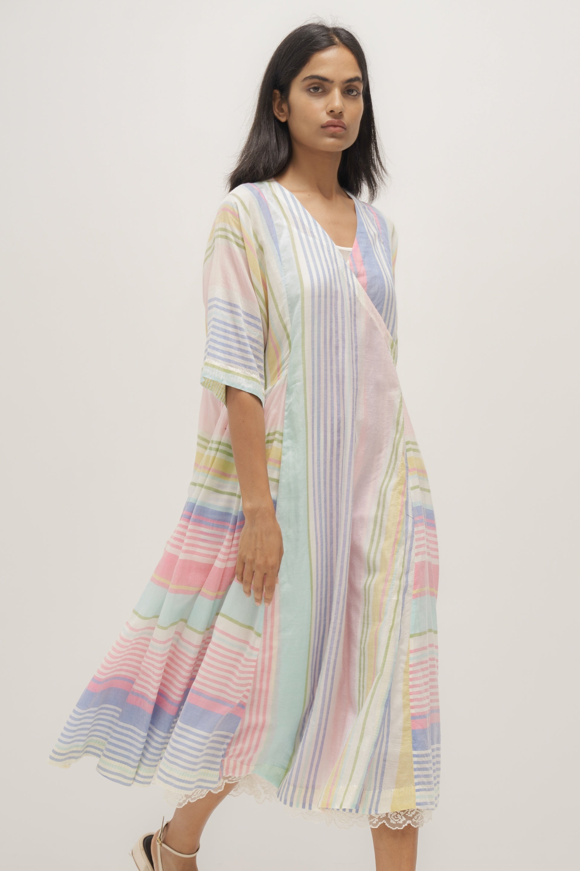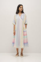Multistriper wrap cotton silk dress. Comes with a plain white cotton silk lining