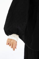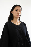 Round neck button-down quilted top in black 100% merino wool with voluminous sleeves and gathered waist, lined with handwoven silk.