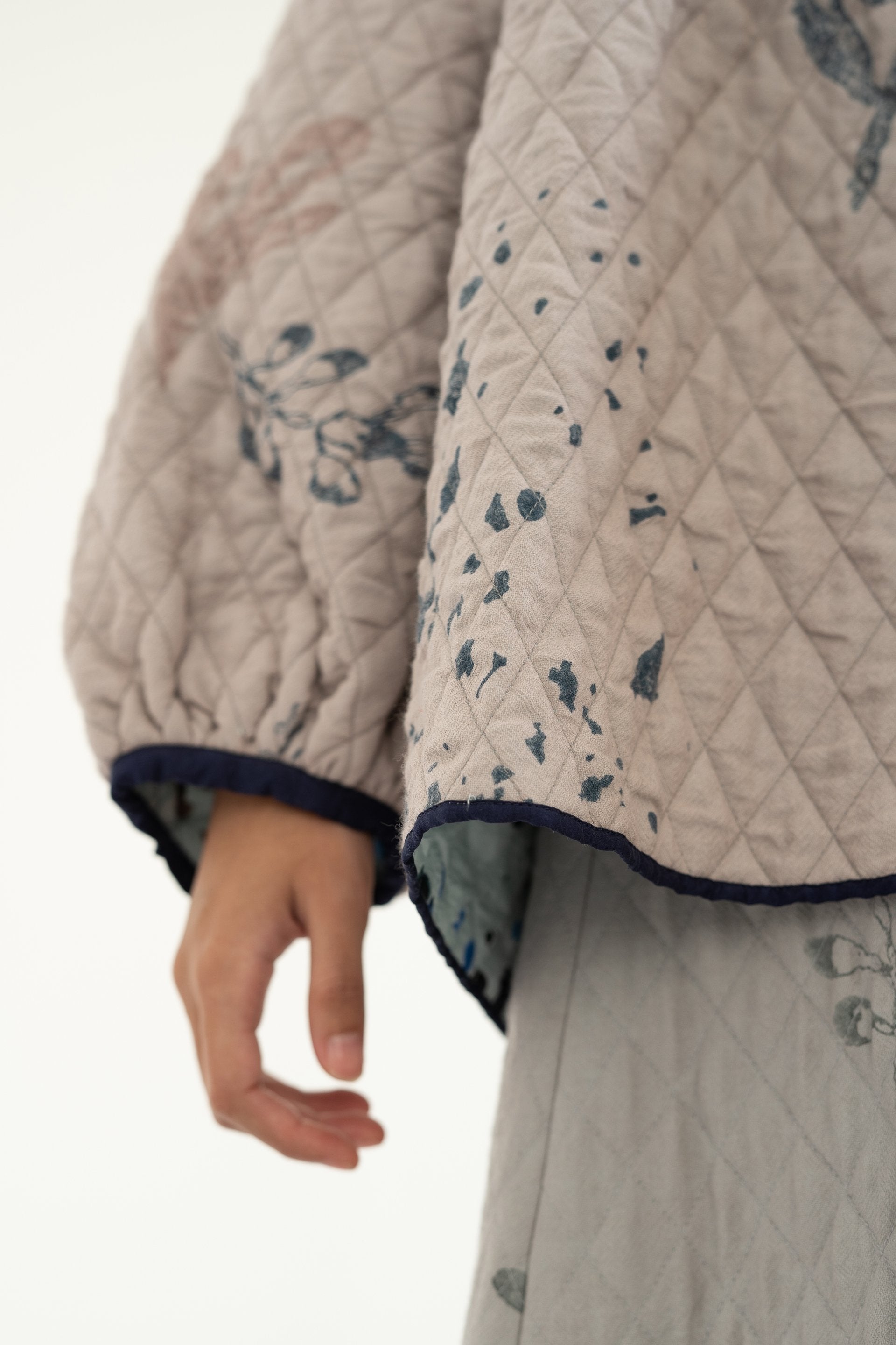 Round neck button-down quilted top in grey 100% merino wool featuring hand block-printed florals with voluminous sleeves and gathered waist, and lined with splatter printed handwoven silk.