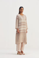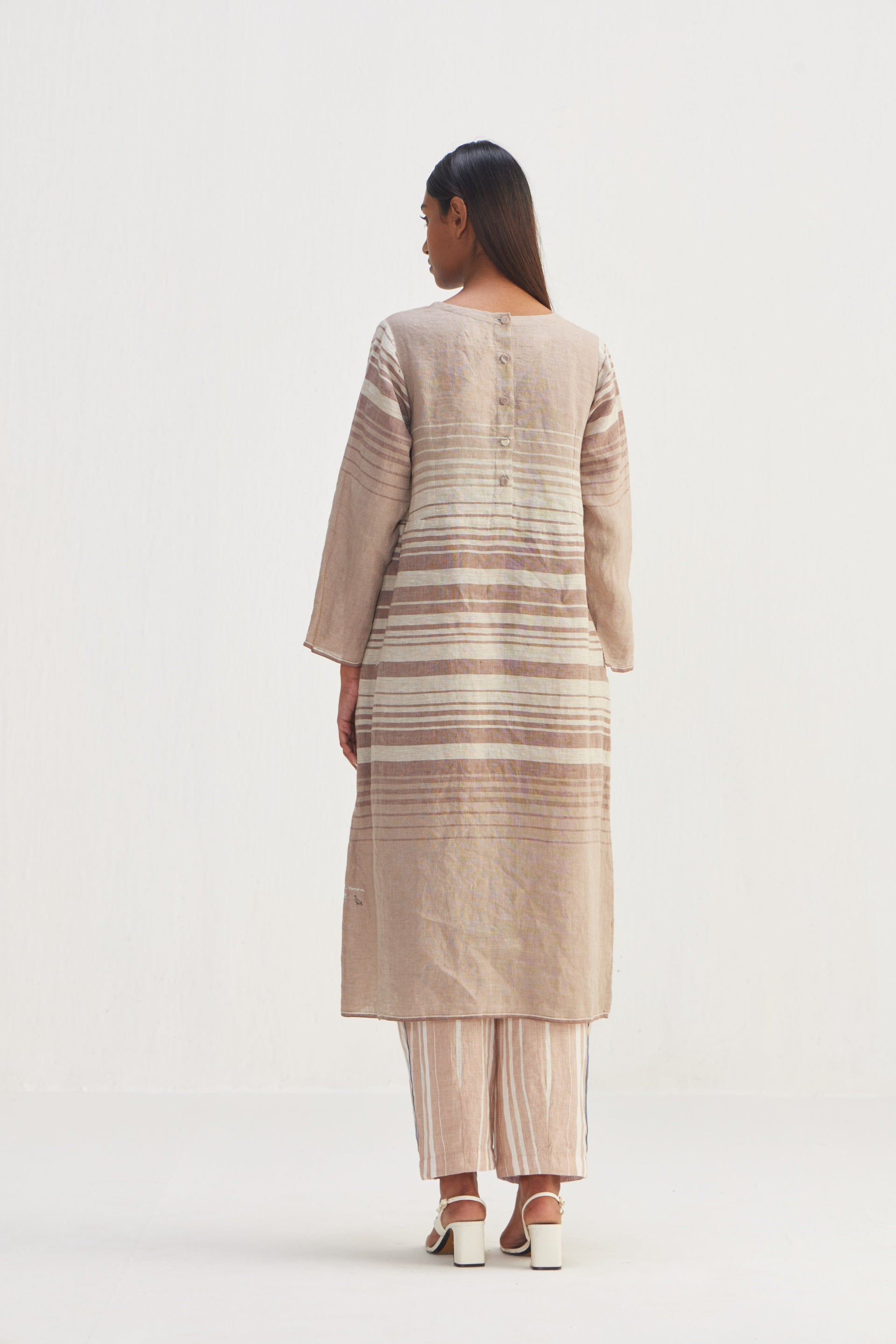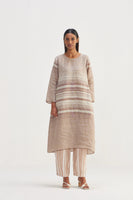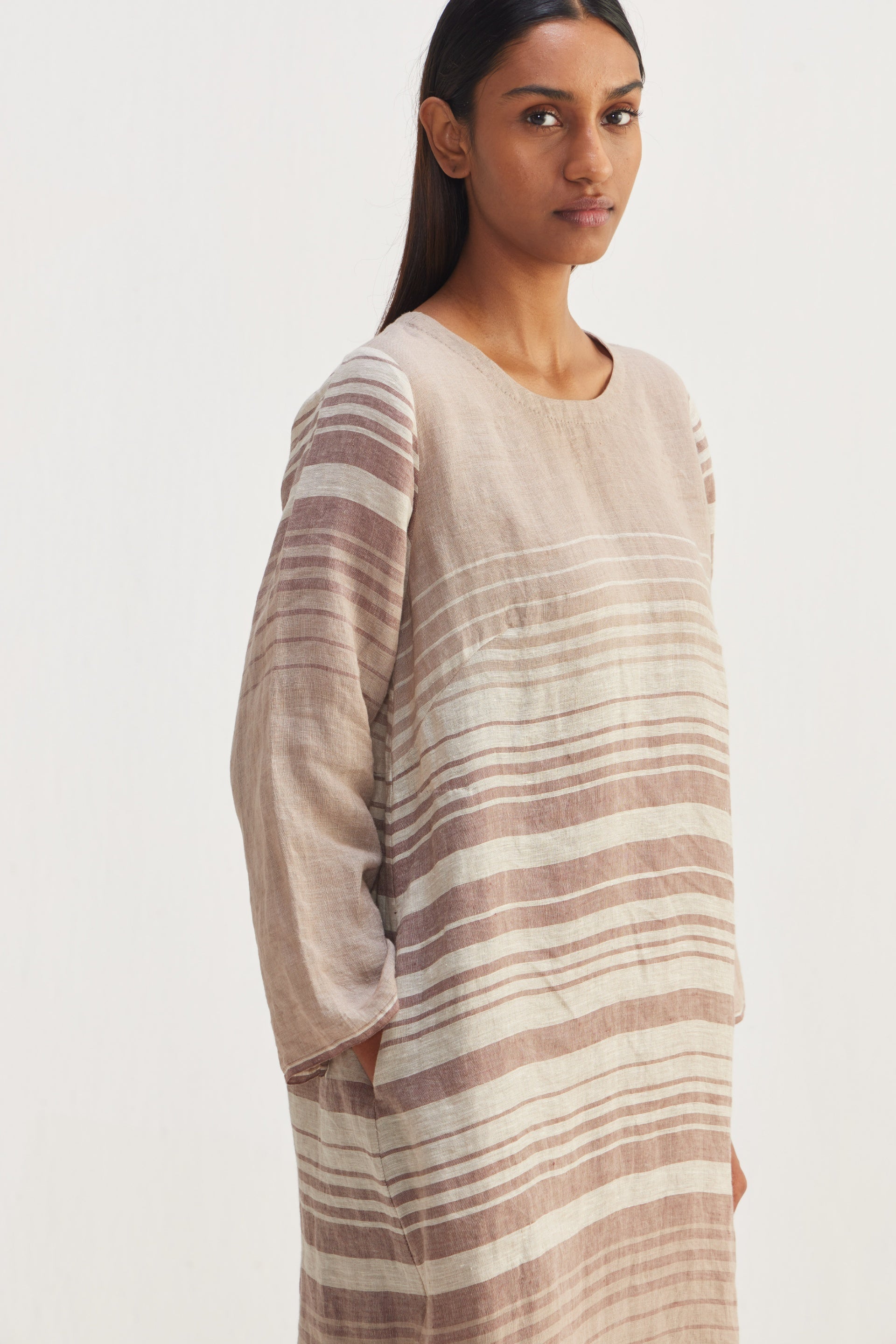 This A-line fit tunic dress in handwoven gradation striper linen offers a chic silhouette, the subtle gradation of the stripes adds a dynamic visual effect, enhancing the natural texture of the linen fabric. The full sleeves that are adorned with selvedge details at the cuffs, adding a refined finish. The hem also features the same selvedge detail, the back of the dress showcases a series of delicate buttons, each carefully placed to maintain the dress's clean lines while adding a hint of elegance .Comes with trouser.