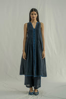 A sleeveless midi dress with a front-button down and collar, featuring pintuck detailing on the bodice and contrast selvedge accents on the placket and hem. Crafted from solid 100% linen.