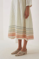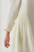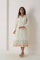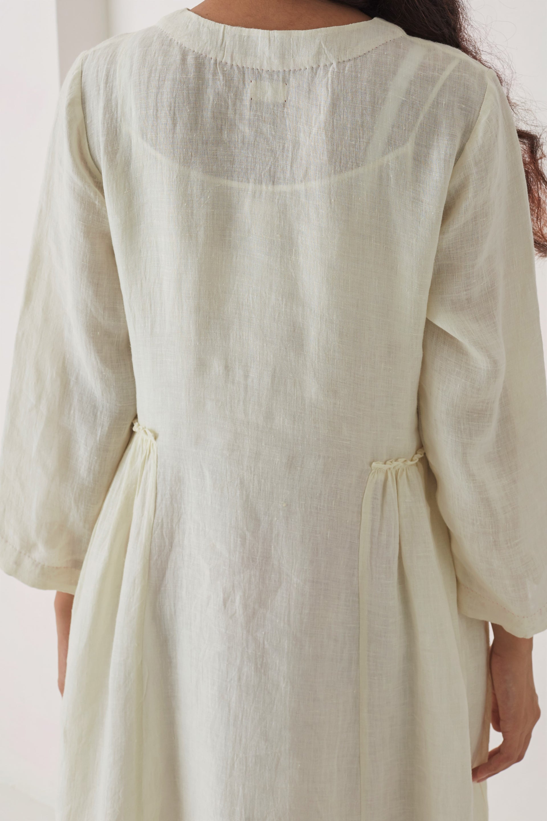Ecru dress in handwoven linen with a v-neck and gathers on the side along with a hand block-printed border on the hem.