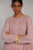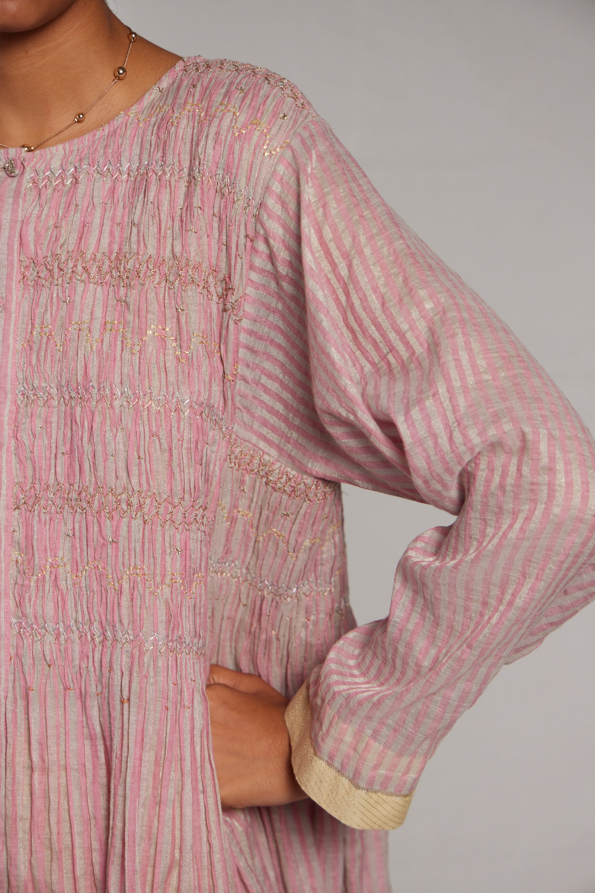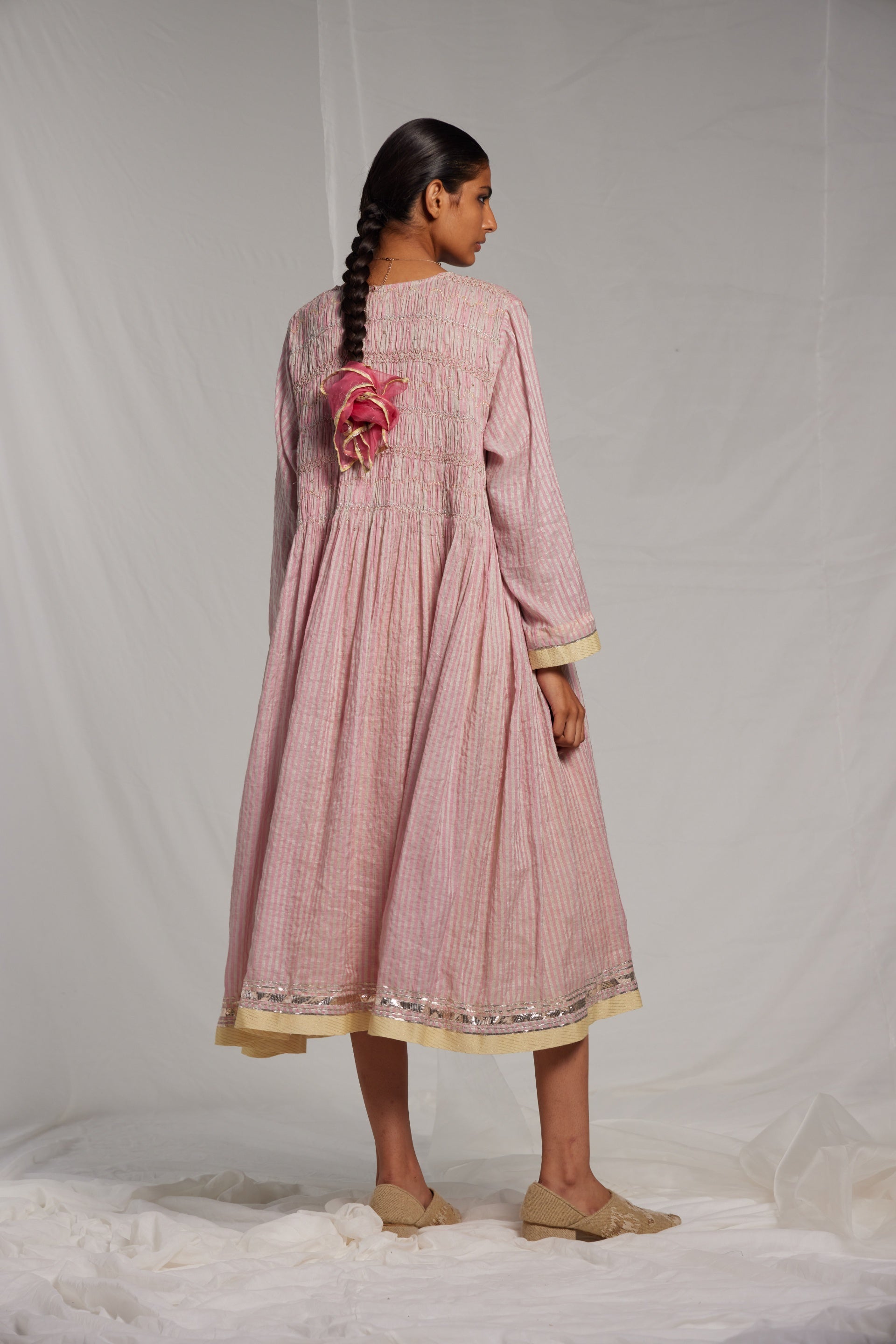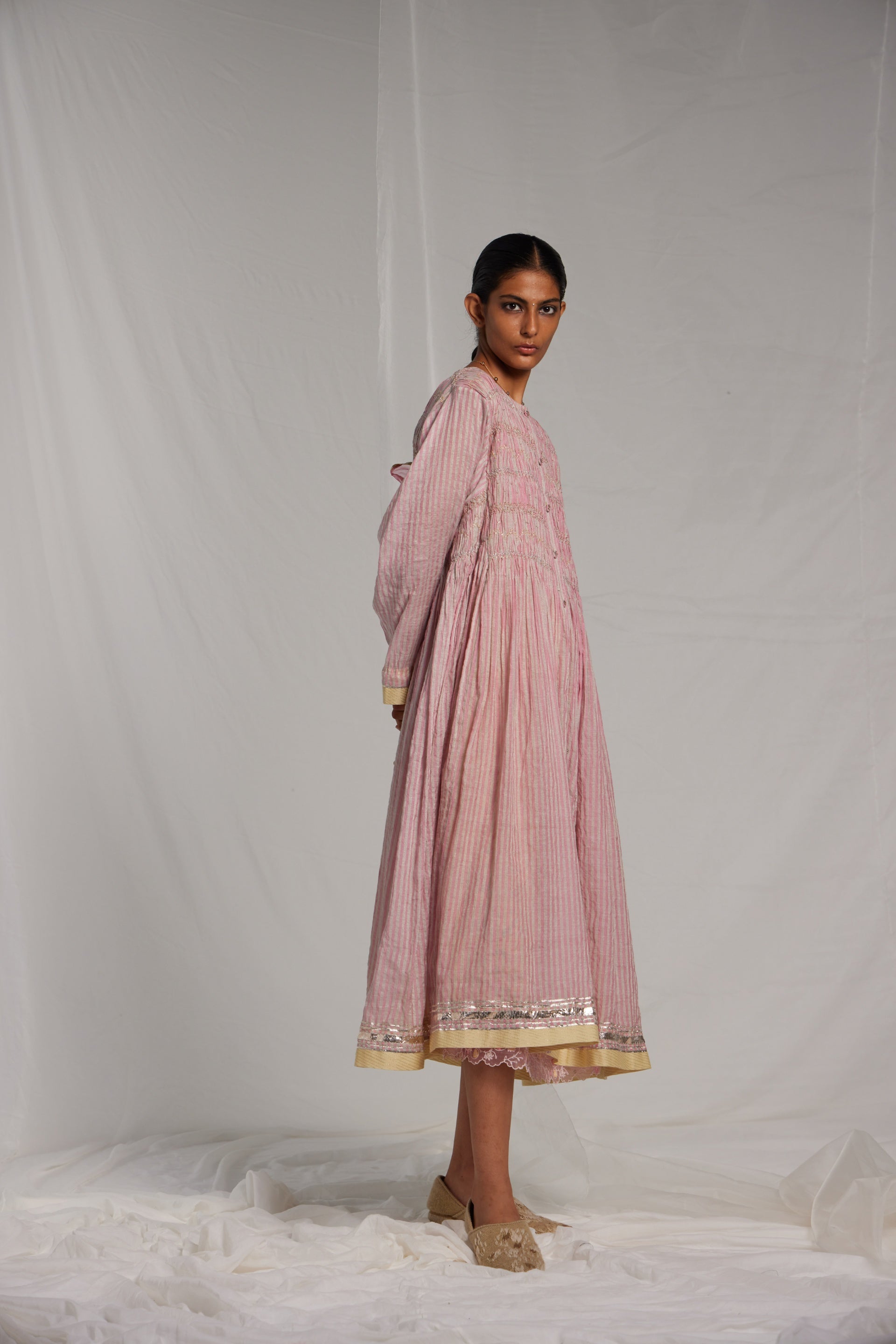 Front open button down dress in handloom cotton silk and zari stripes with contrast zari quilted border detail on hem and sleeves. Finished with exquisite hand smocking at the front and metallic gota seams. Comes along with an attached printed kota doriya lining. Semi fitted flare midi length dress. 3 cm length border and 3 cm in arm sleeves.