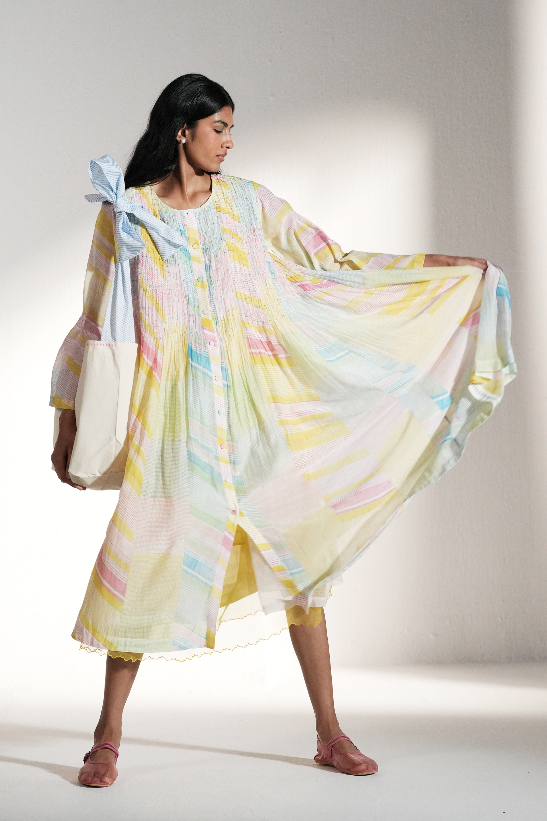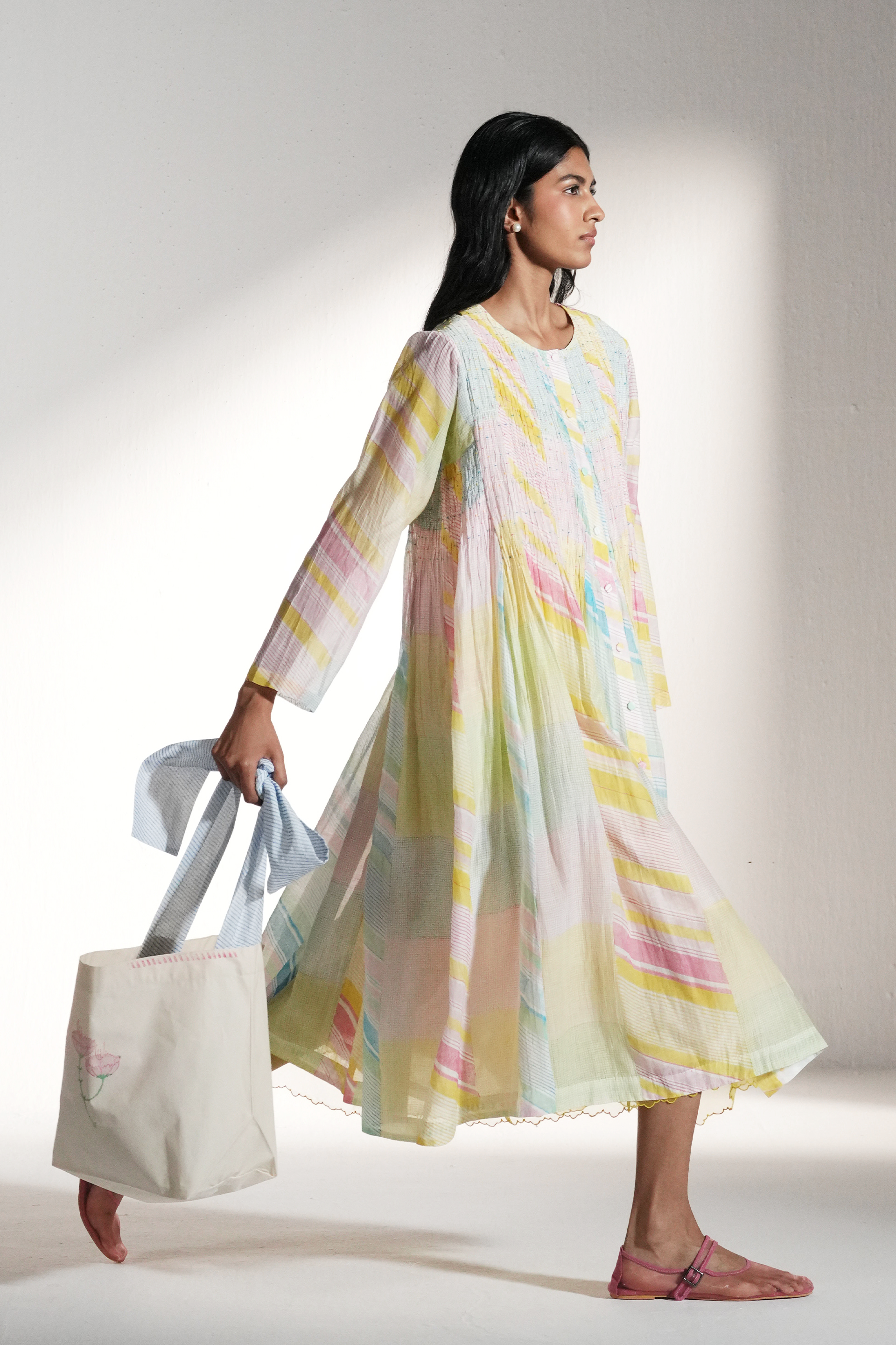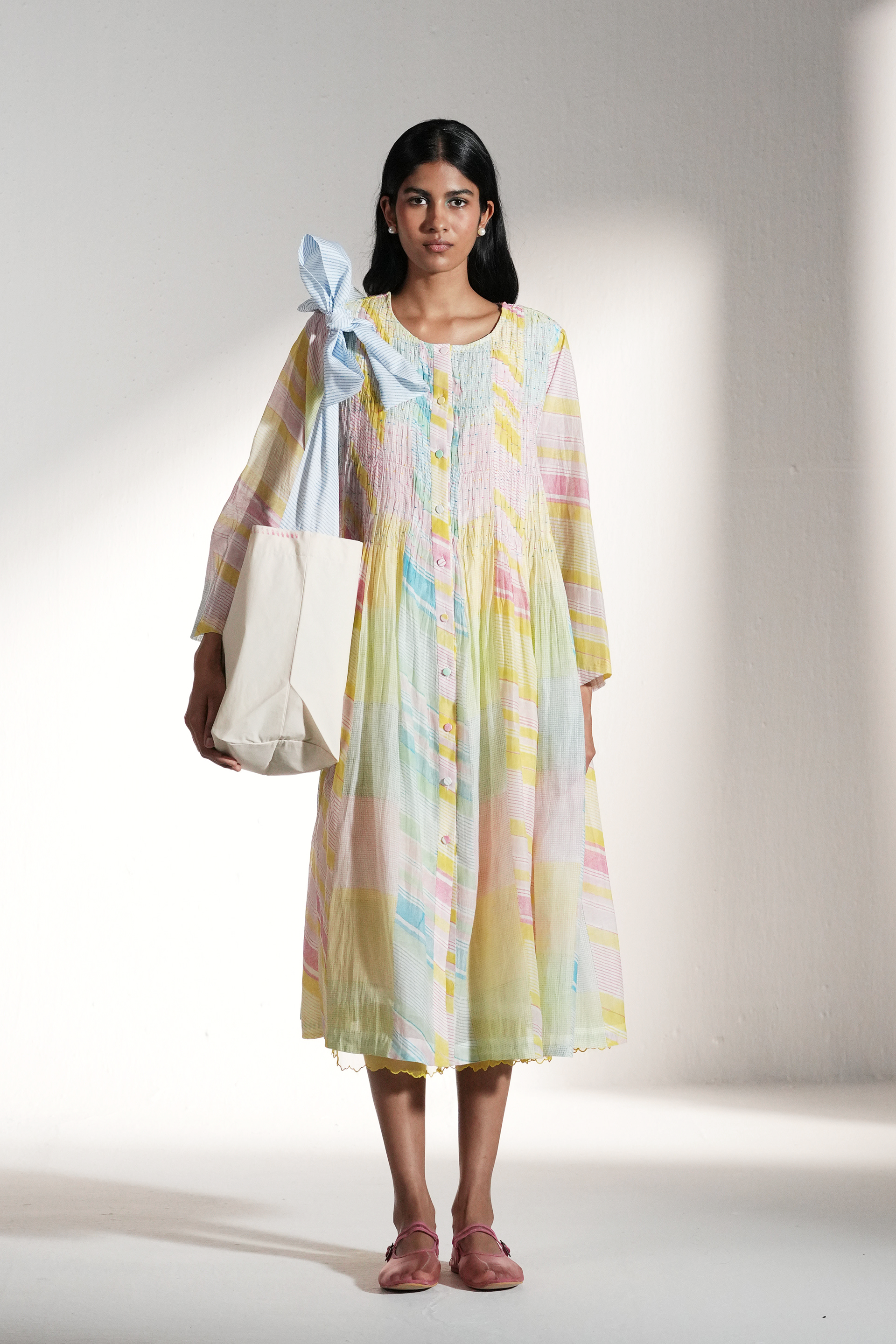 Front open button down dress, hand smocking detail in bodice. ,Multicolor handblock printed graph check and diagonal stripes.