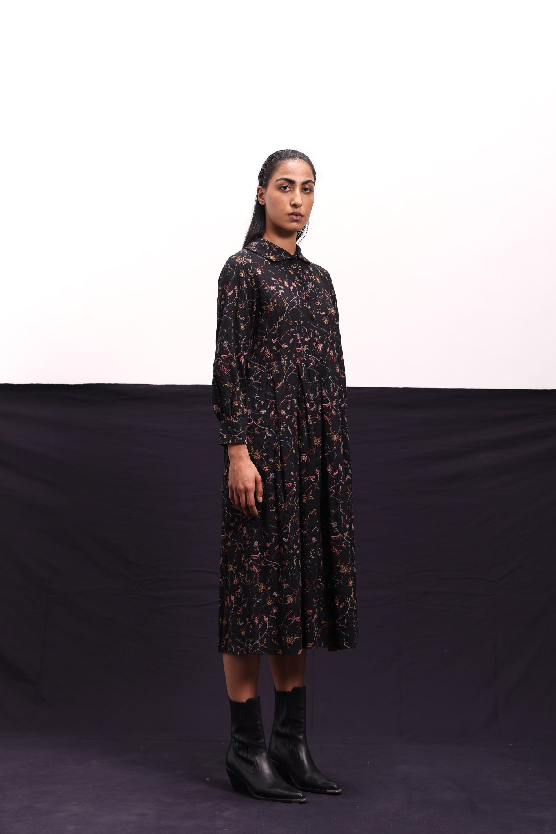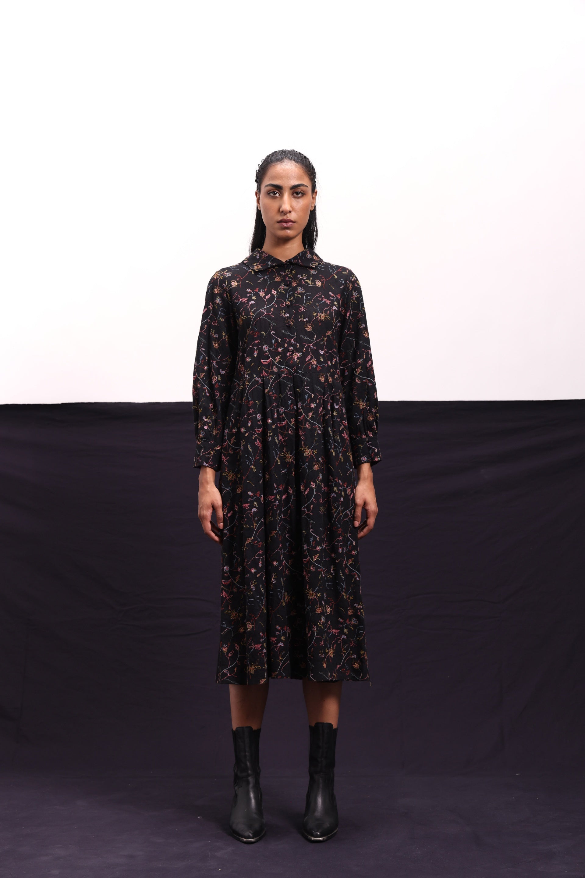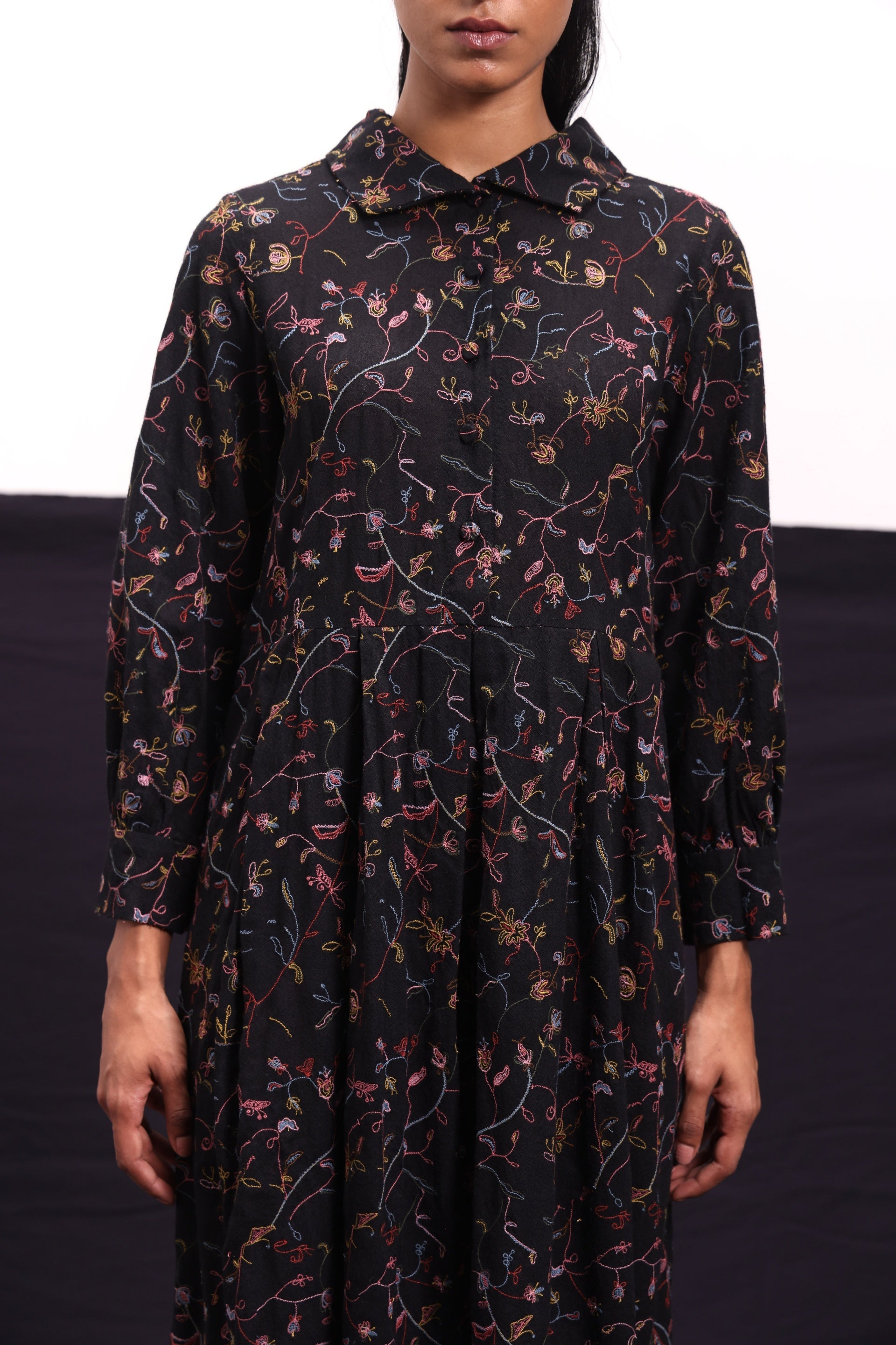 Midi dress with inverted box pleats constructed in all over floral embroidered wool.