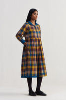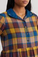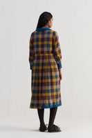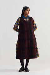 Relaxed fit front open button down collar midi dress with inverted box pleat on the waist and cuff on the sleeves. Constructed in checkered 100% wool fabric with hand embroidery on collar and cuffs quilted silk patch. Finished collage handblock print 100% silk fabric facing detail.