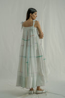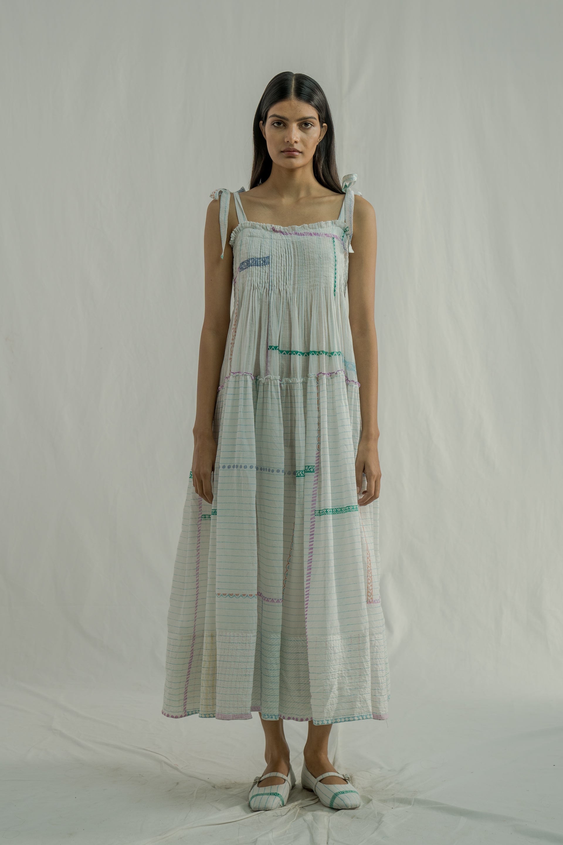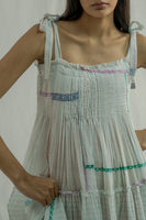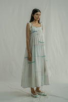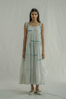 The dress features all-over pintuck detailing with tie-up straps and a low-waist tier adorned with gathers and quilting at the hem. It is finished with a striped hand-block printed facing at the bottom. Crafted from a cotton-silk blend, the fabric combines blue pinstripes with a multi-grid hand-block print.