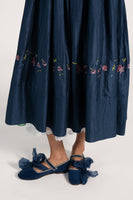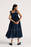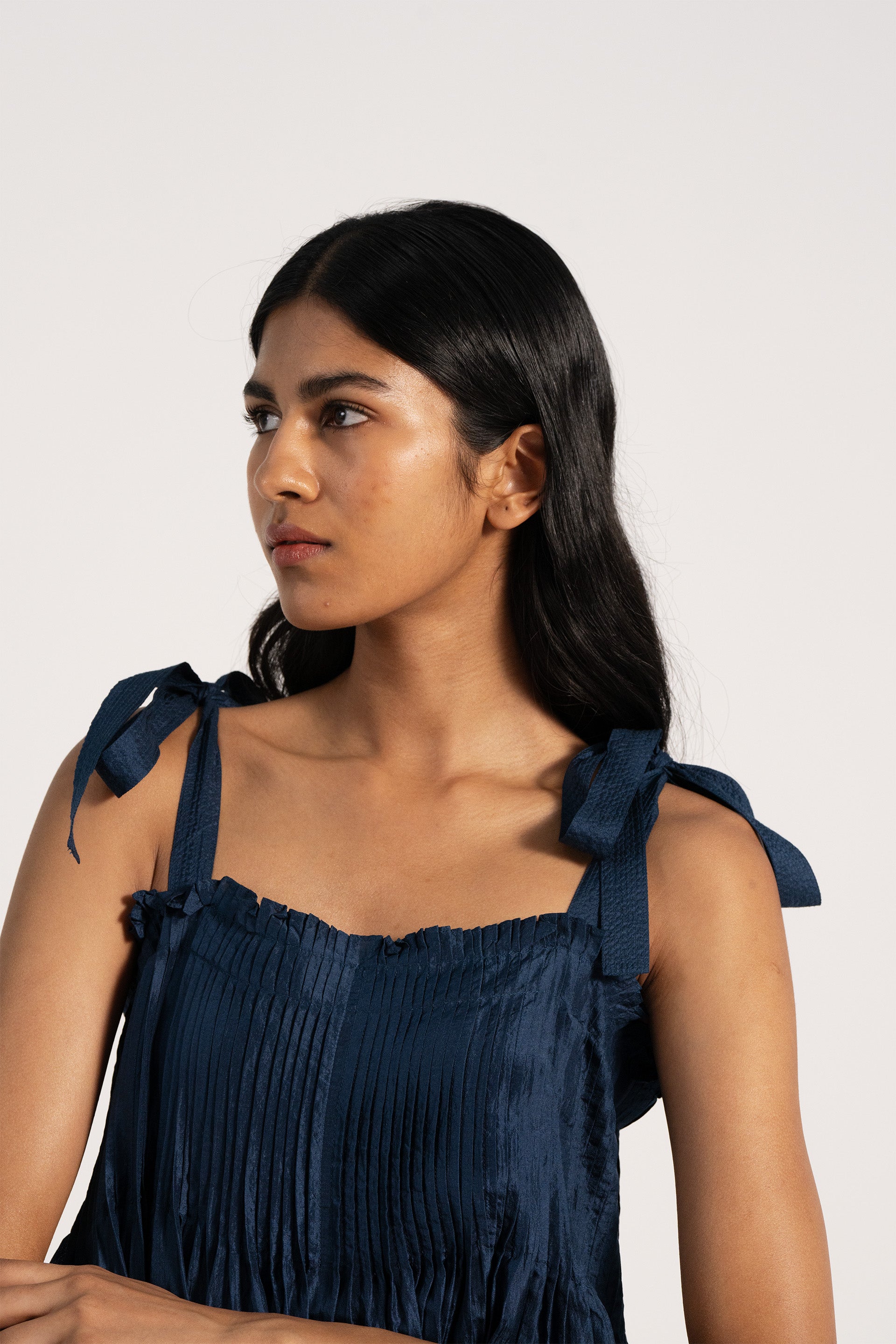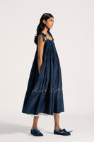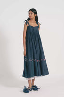All over pintuck detail dress with tye-up straps in cotton silk blend and scatter multicolor floral embroidery.
