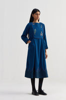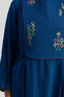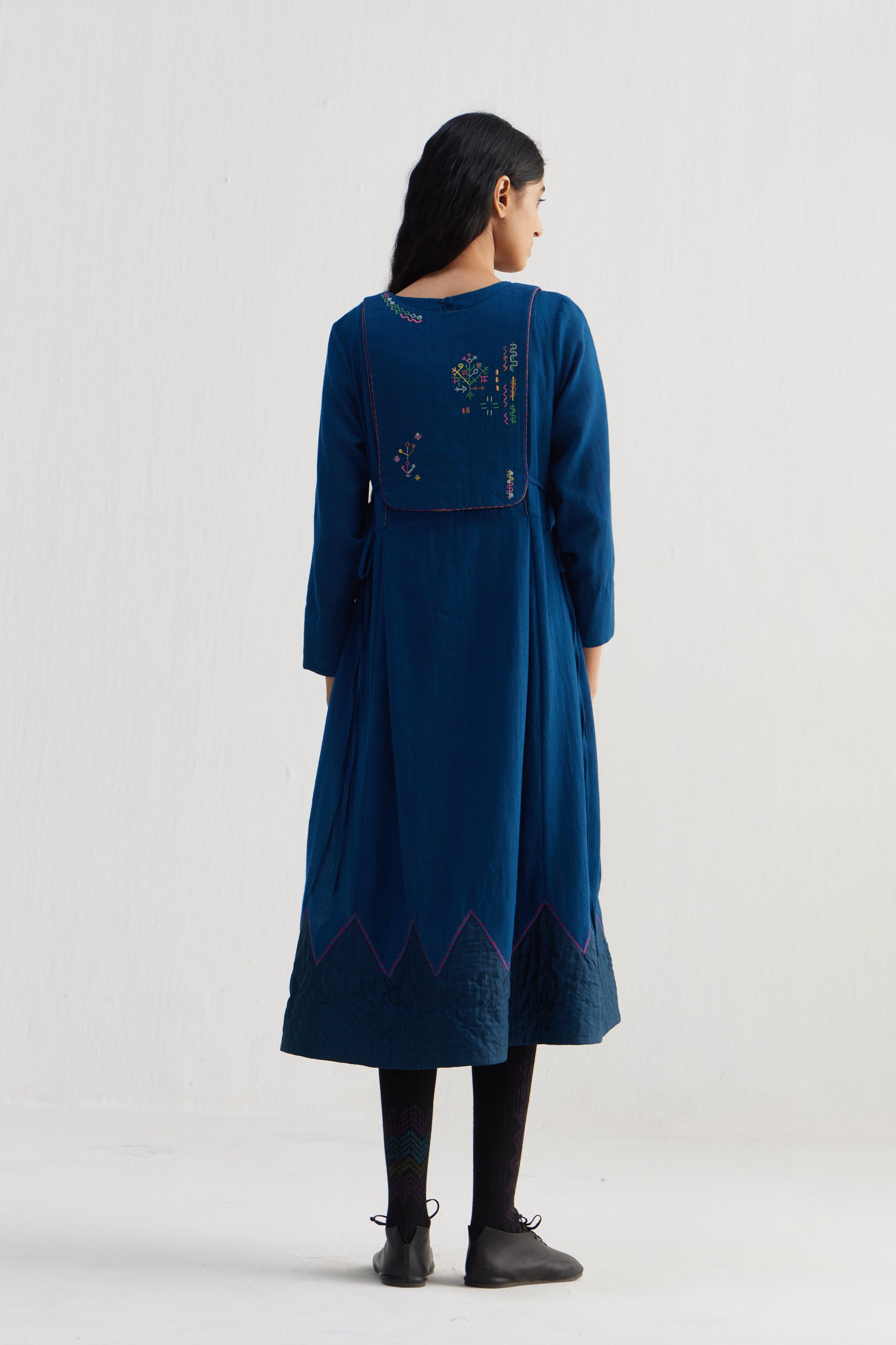 Round neckline midi dress with silk patch of chevron at hem, quilted yoke and inseam pockets.Constructed in solid 100% merino wool. Finished with contrast handblock print piping detail and collage handblock print 100% silk fabric facing detail.