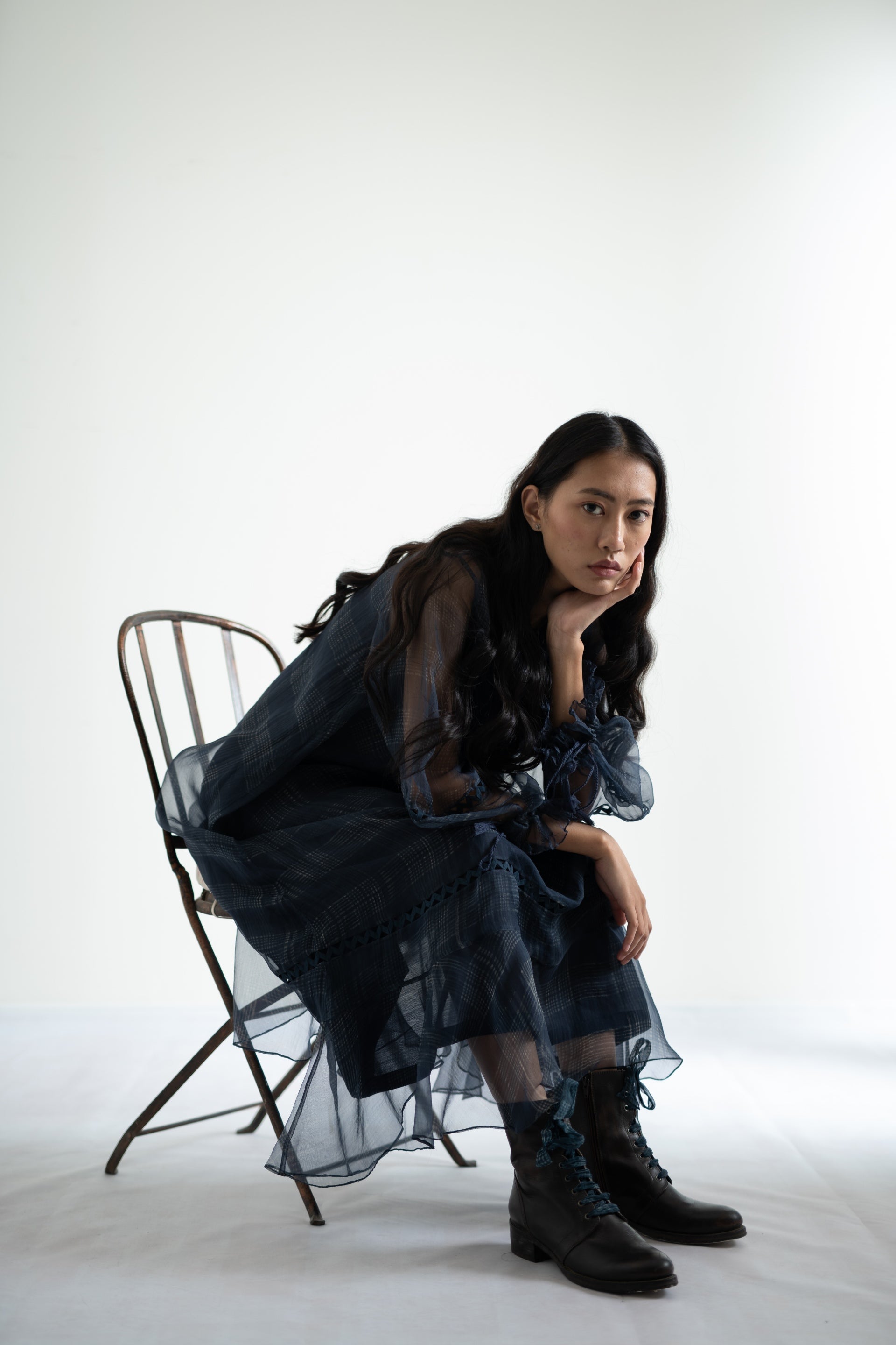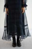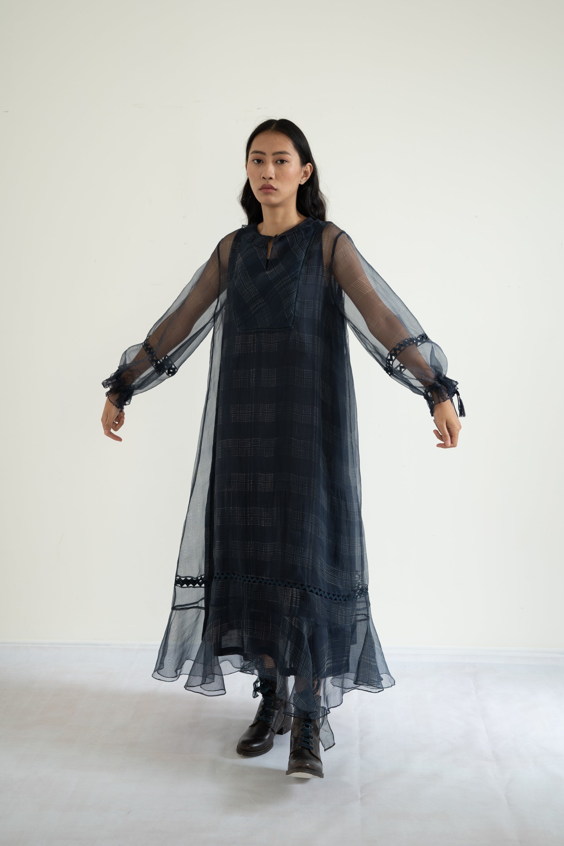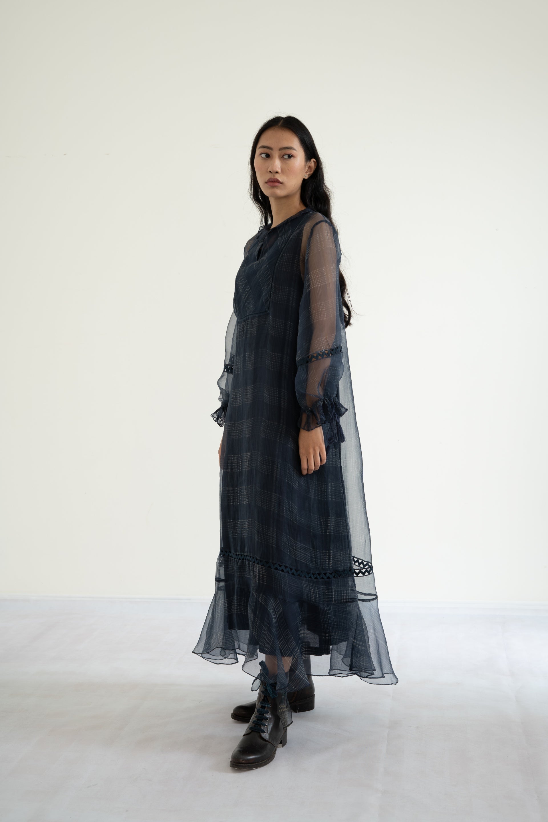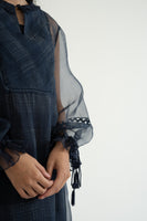 Indigo dress in organza featuring discharge printed checks all over, gathered trim along the neckline and lace inserts along the bottom and sleeves with drawstring tassles on cuffs.