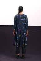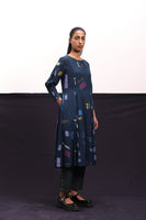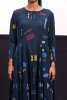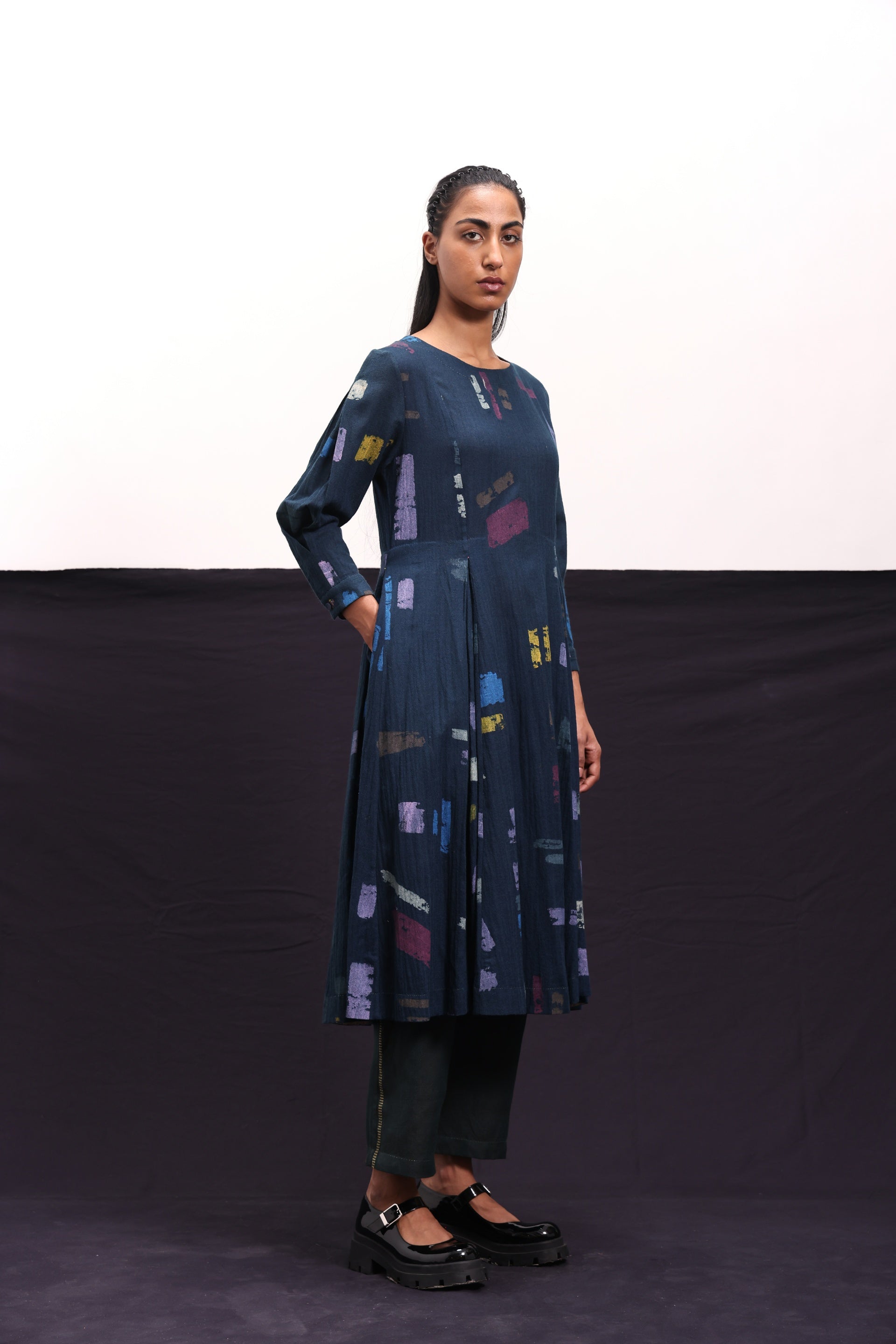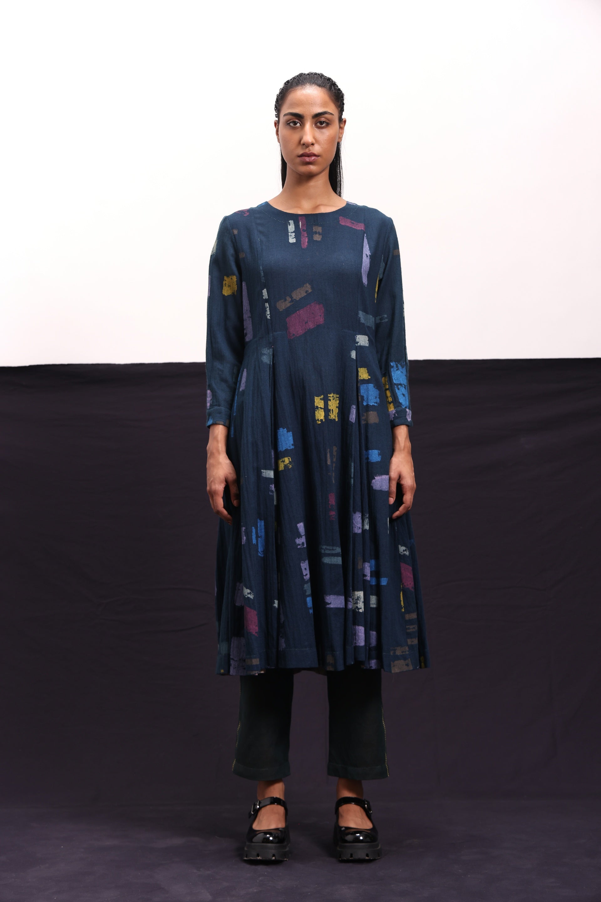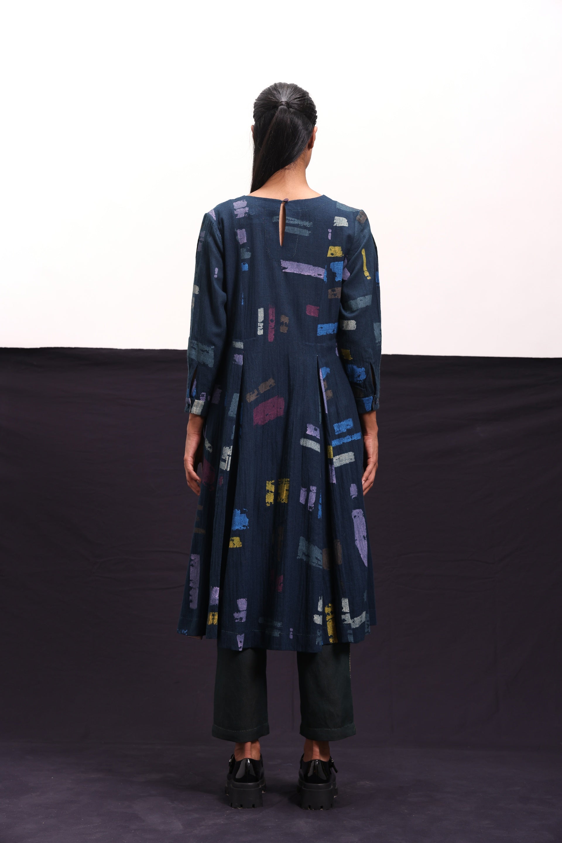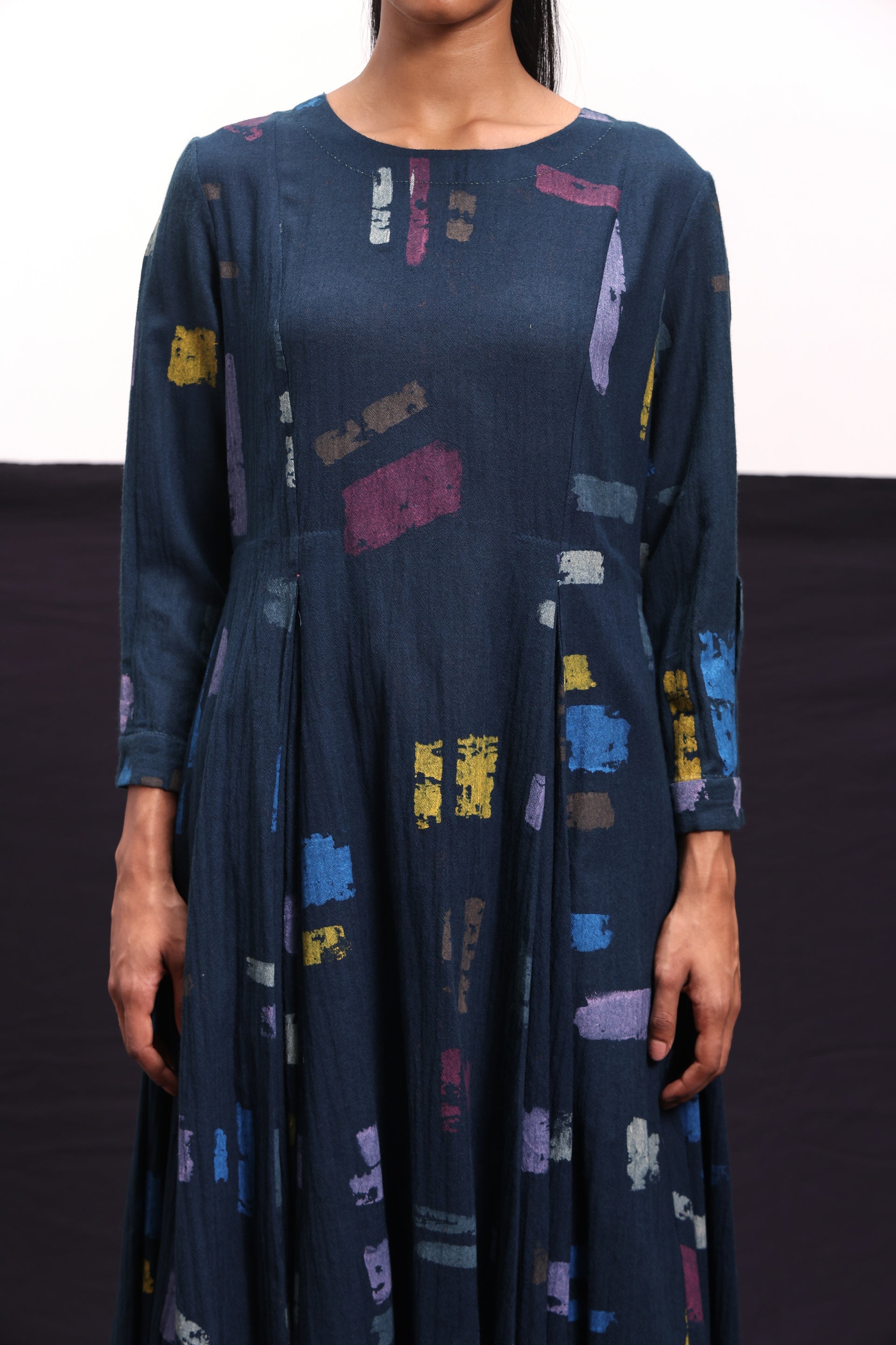Midi dress with inverted box pleats constructed in abstract blocks printed wool