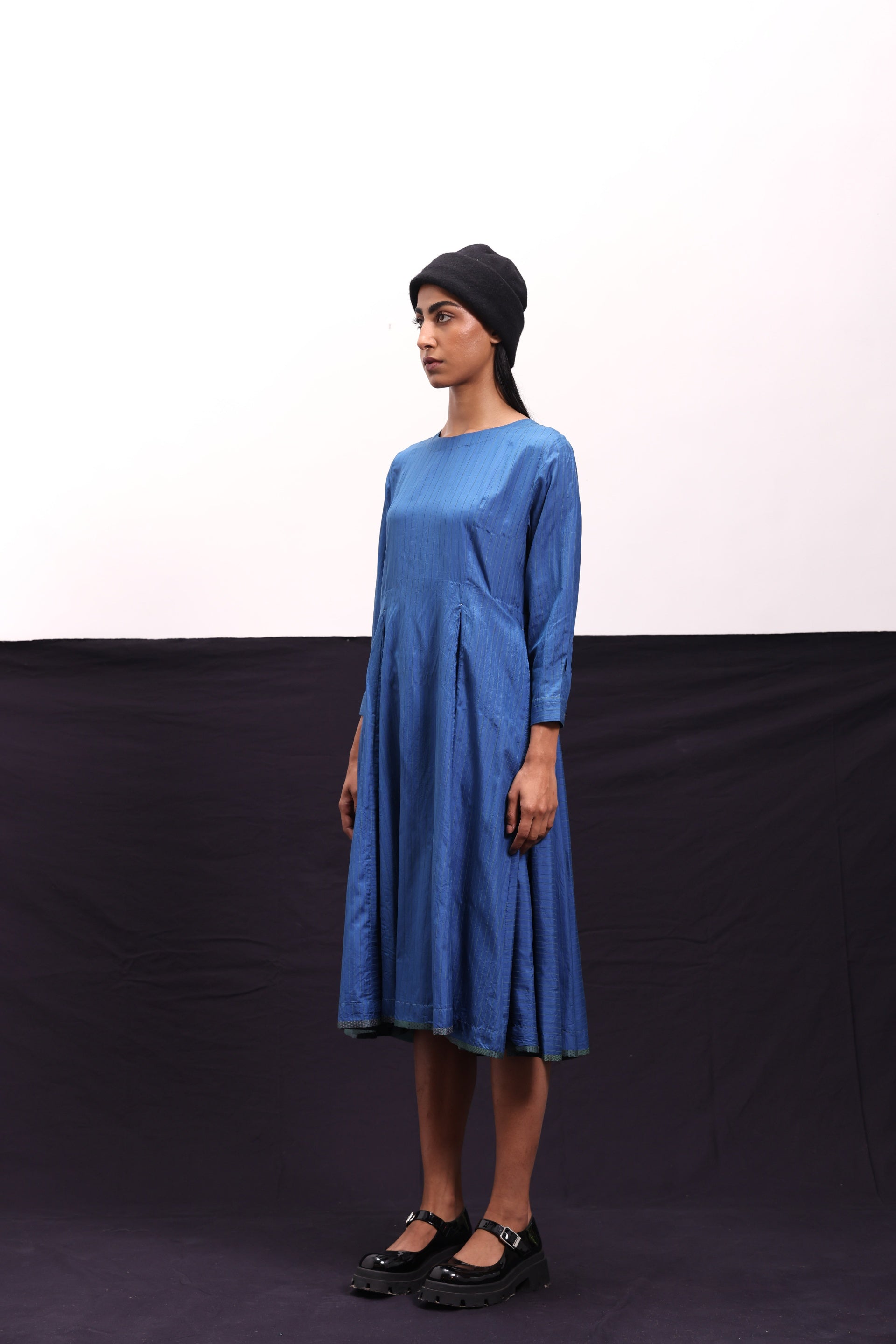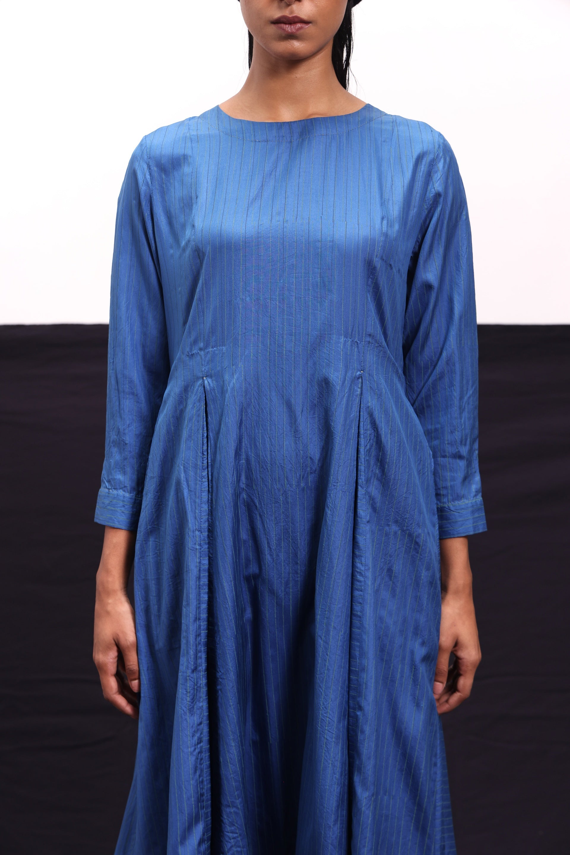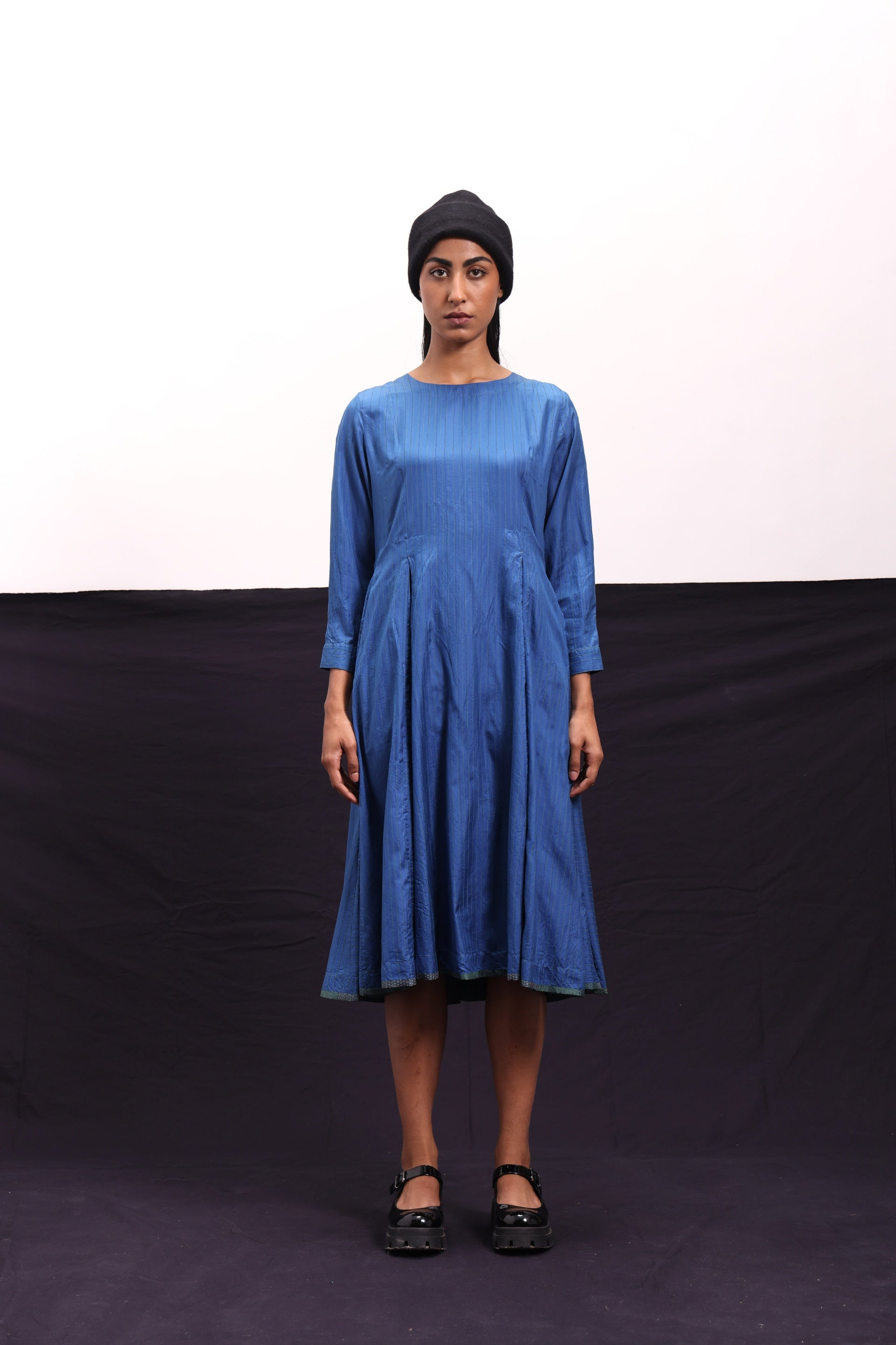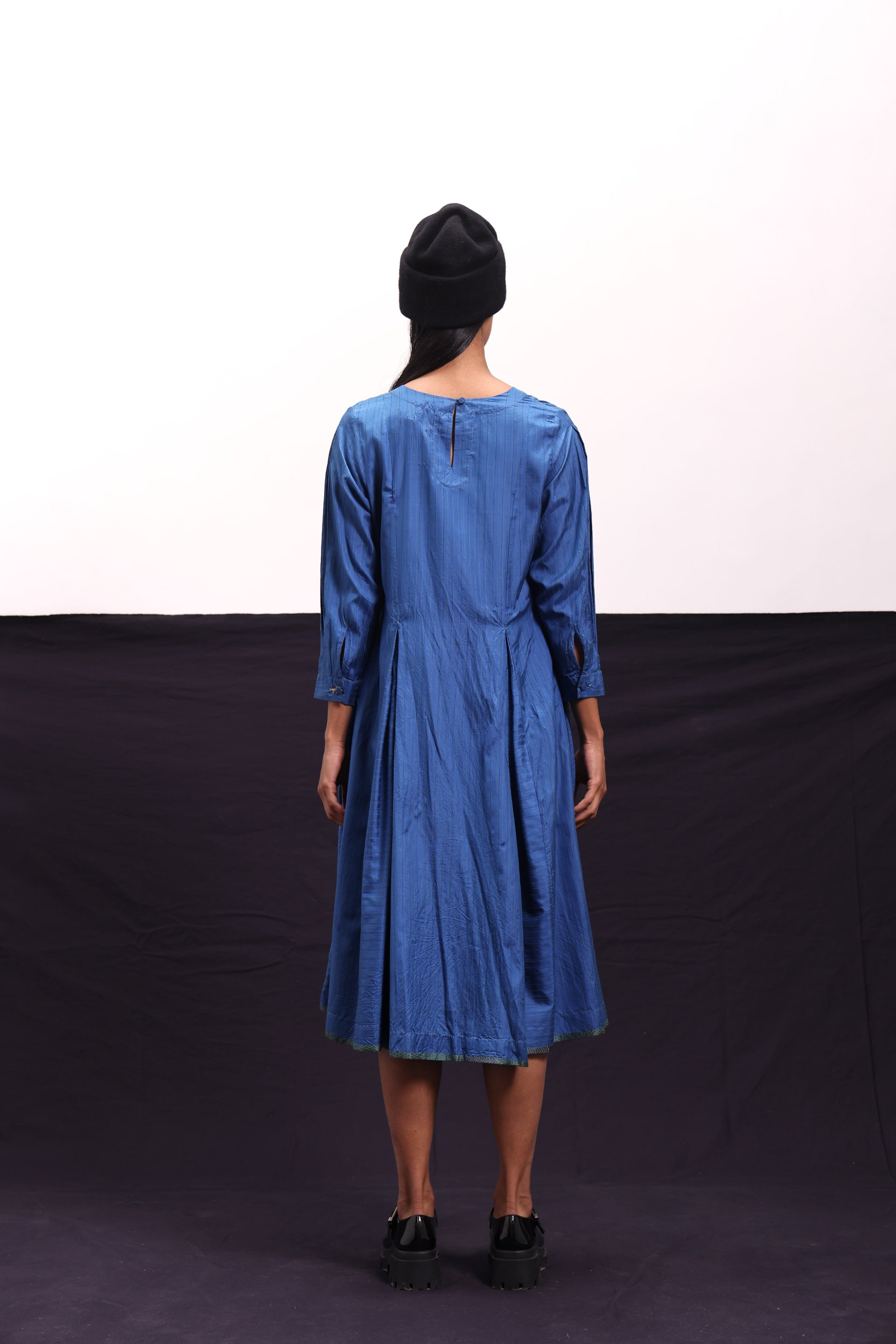 Midi dress with inverted box pleats constructed in abstract striper printed silk