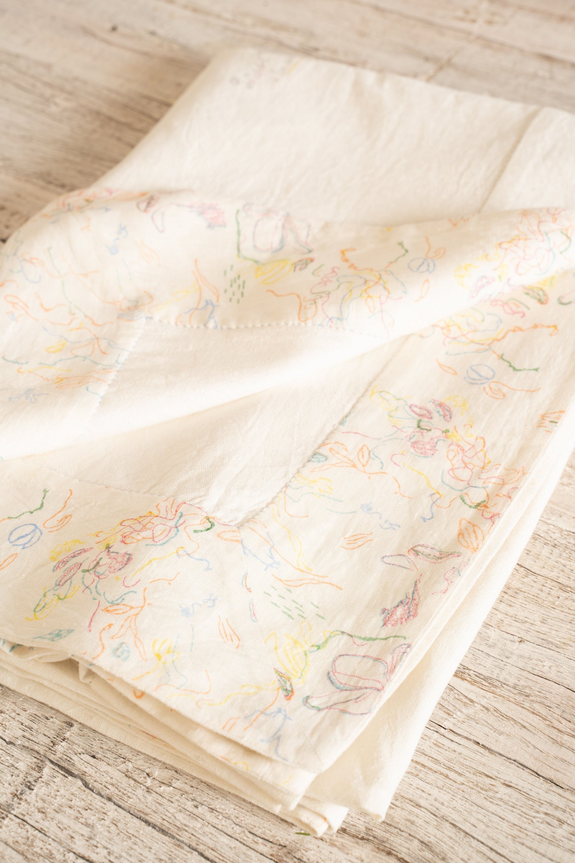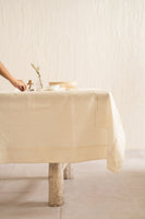 White table cloth cover in 100% linen with monotonal hand block printing and delicate embroidery detail, finished with contrasting multicolor hand block printed facing