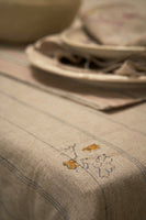 Natural table cloth cover in 100% linen with hand block printed stripes and floral design, finished with multicolor hand block printed stripes