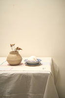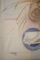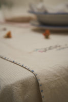 White multipatch table runner in 100% with block printing, patches with cotton silk self checks and delicate hand embroidery details.