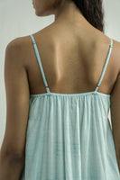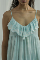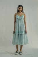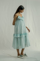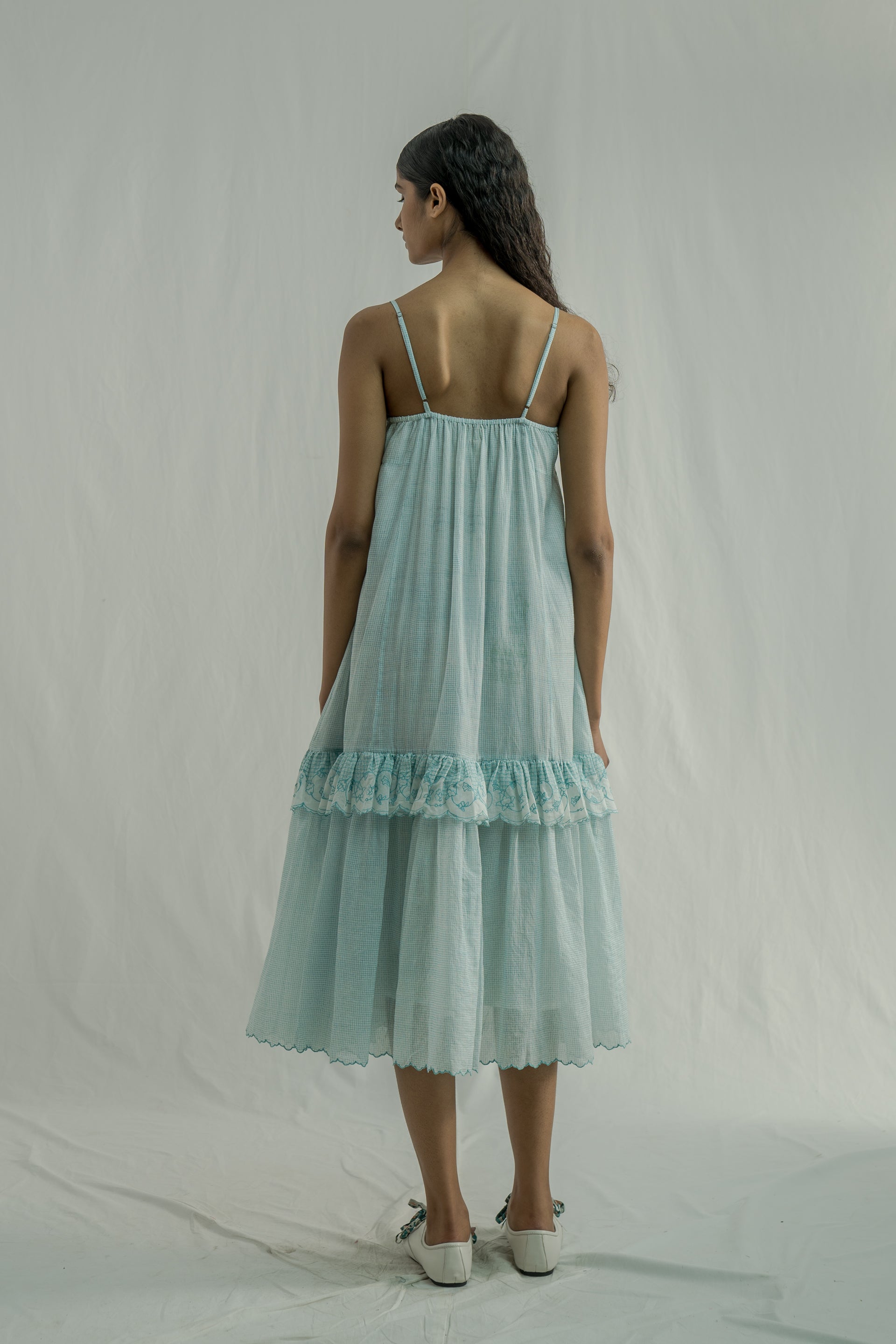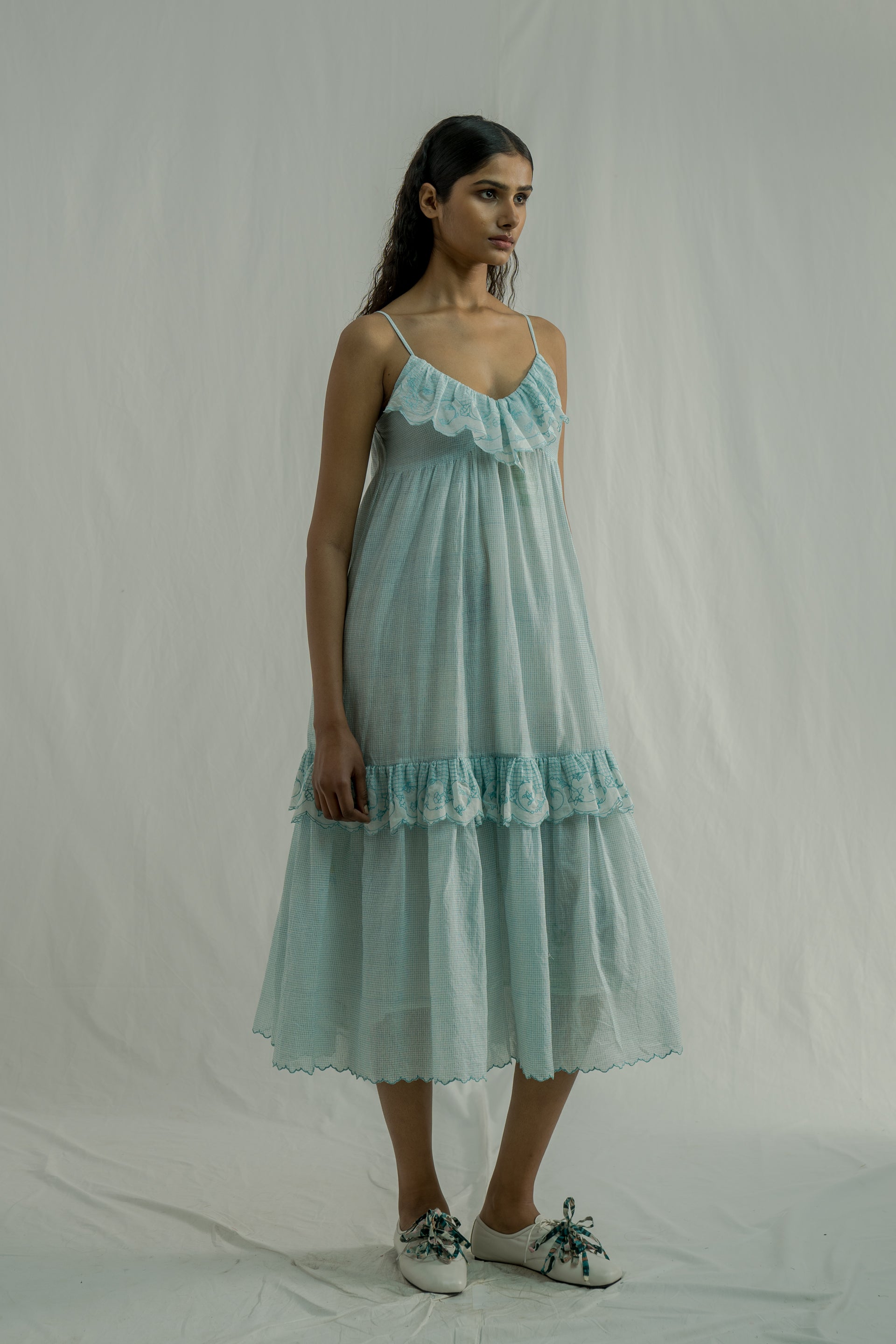 Adjustable-strap midi dress featuring a flattering V-neckline and a tiered design with soft gathers, complemented by ruffled embroidery inserts. Made from a pin-striped hand-block print with a floral border embroidery, it is crafted in a luxurious cotton-silk blend. The dress comes with an attached hand-block print placement lining.