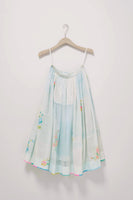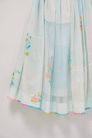 Ice blue multi collage print with floral placement and hand embroidered patchwork skirt with multicolor printed selvedge detail. Comes with an attached printed cottom silk lining
