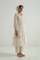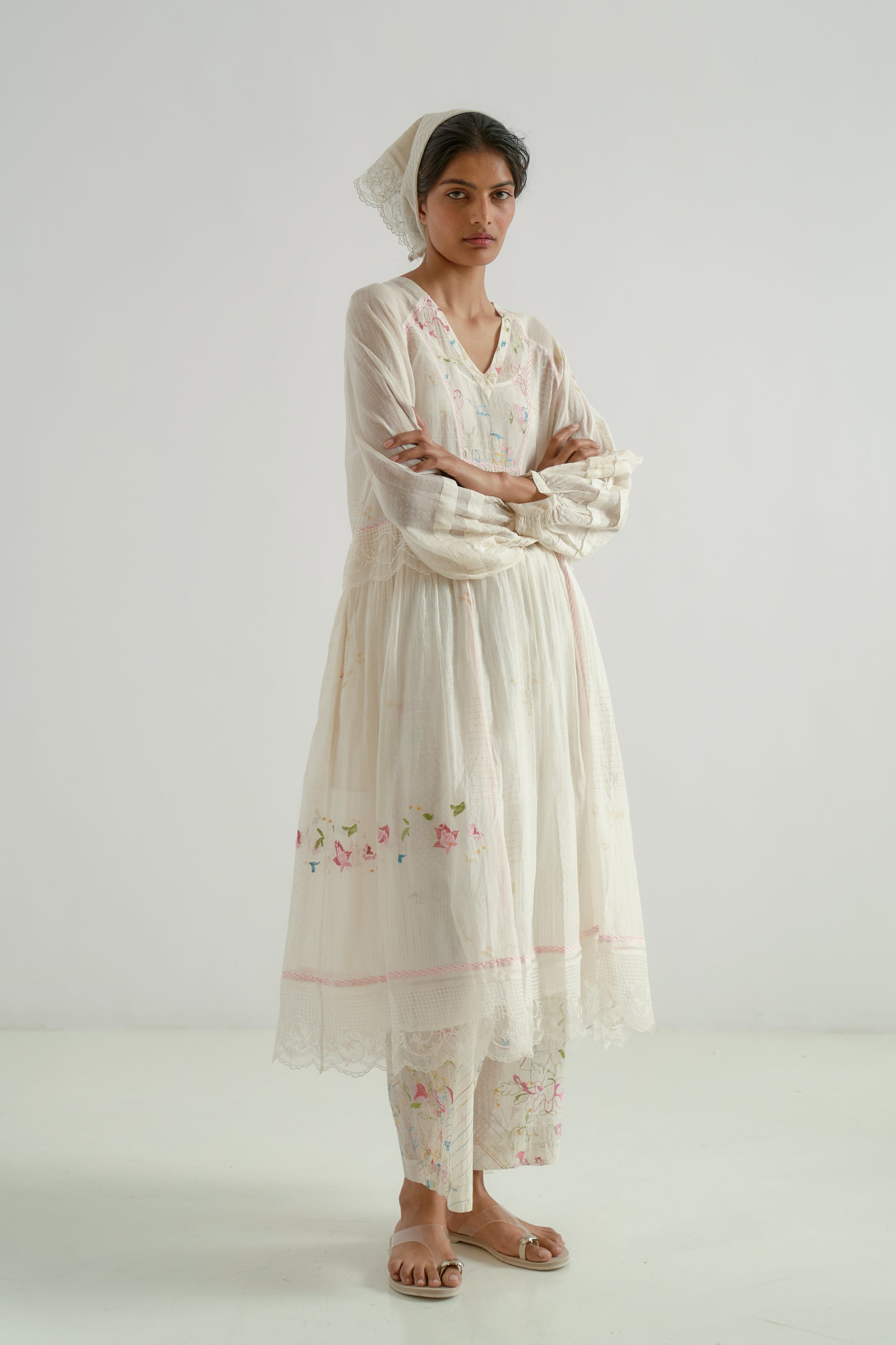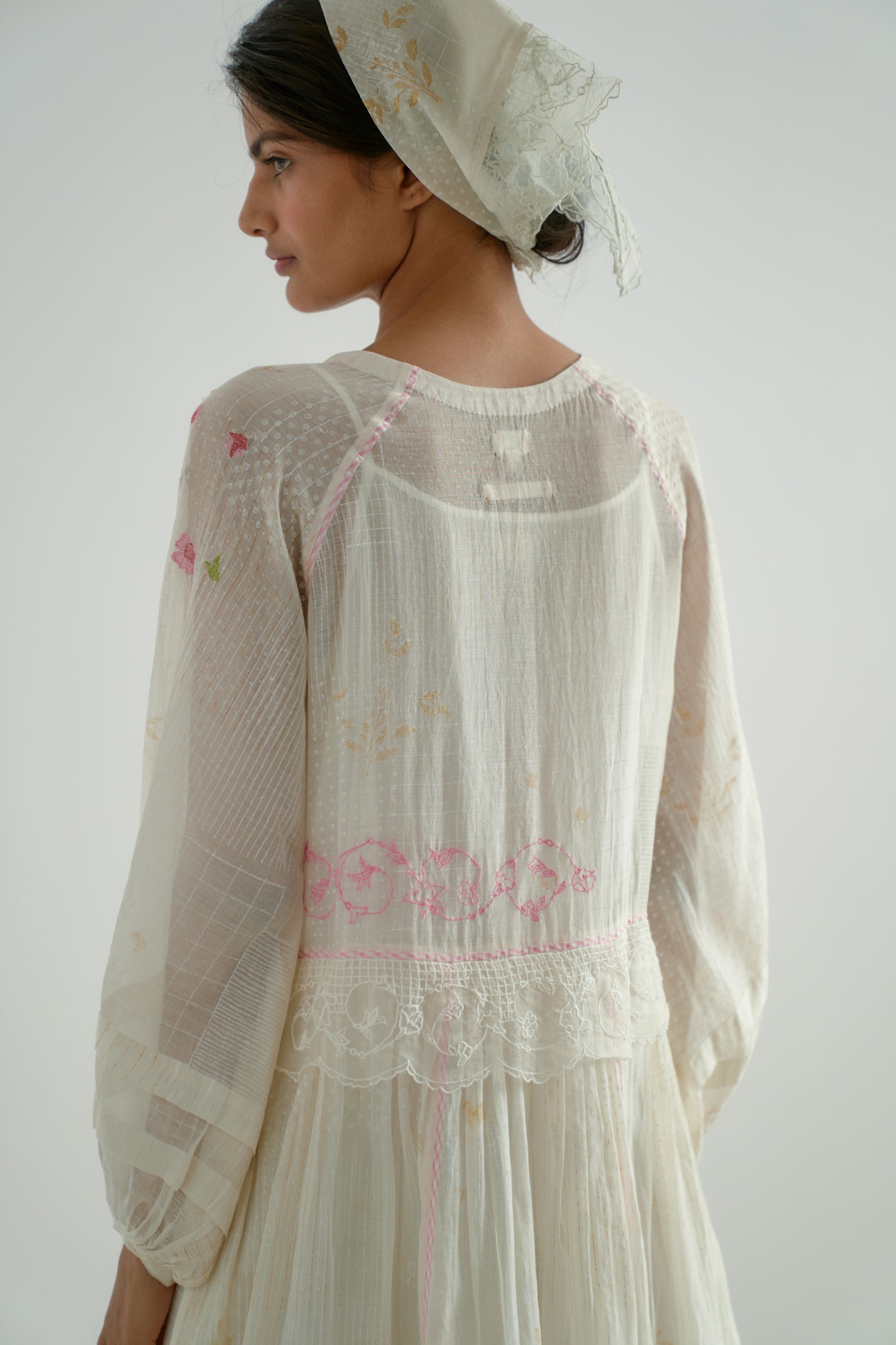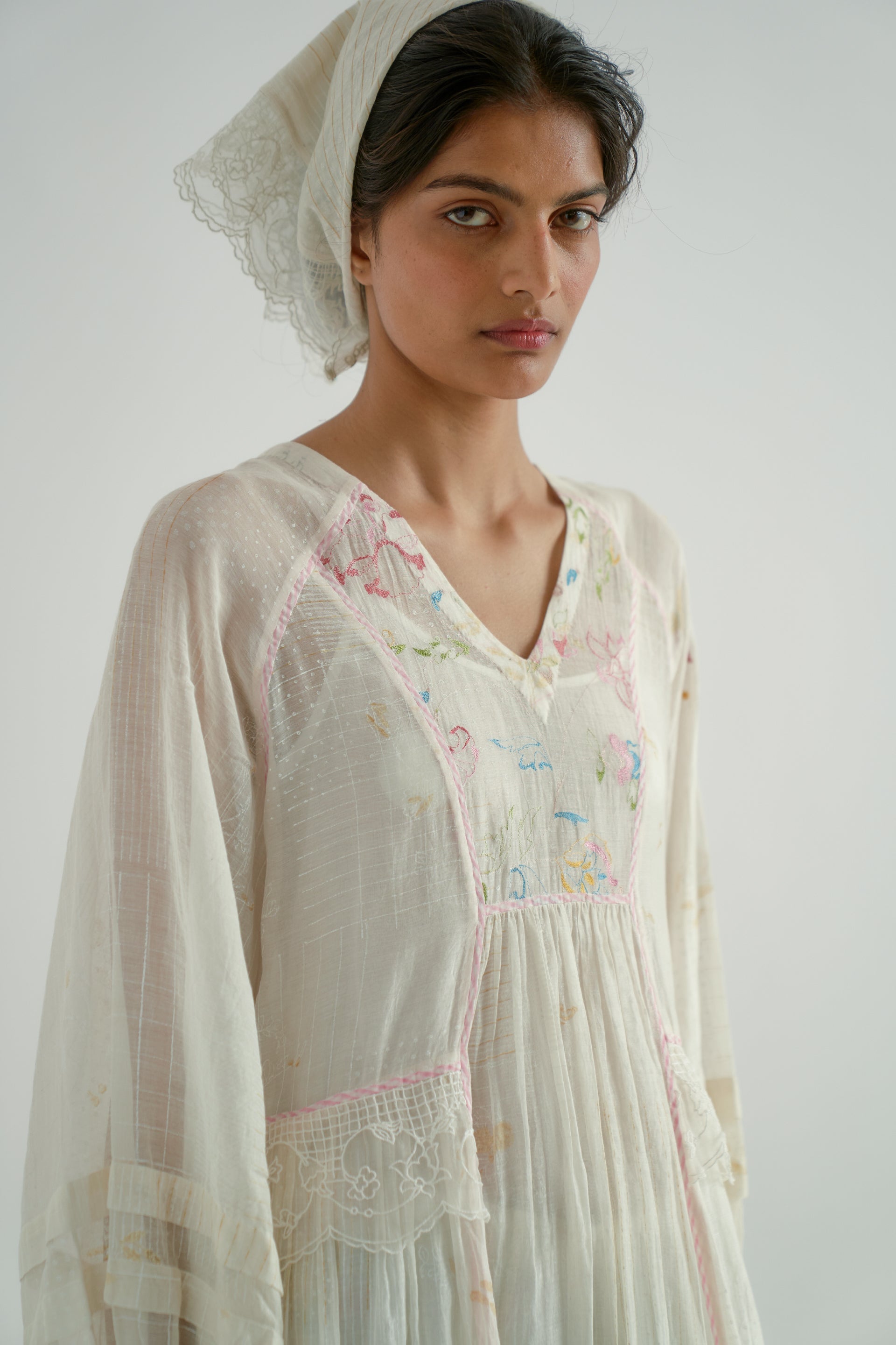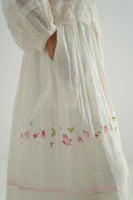 This patchwork midi-dress features a V-neckline, puff sleeves, and delicate gathers at the waist seam. It is beautifully finished with hand-block printed piping along the seams and an organza embroidery insert around the waist and the hem. Made from a 100% cotton-silk blend, the fabric showcases a tonal hand-block printed collage pattern, enhanced by scattered multicolor floral embroidery. The dress comes with a separate cotton lining.