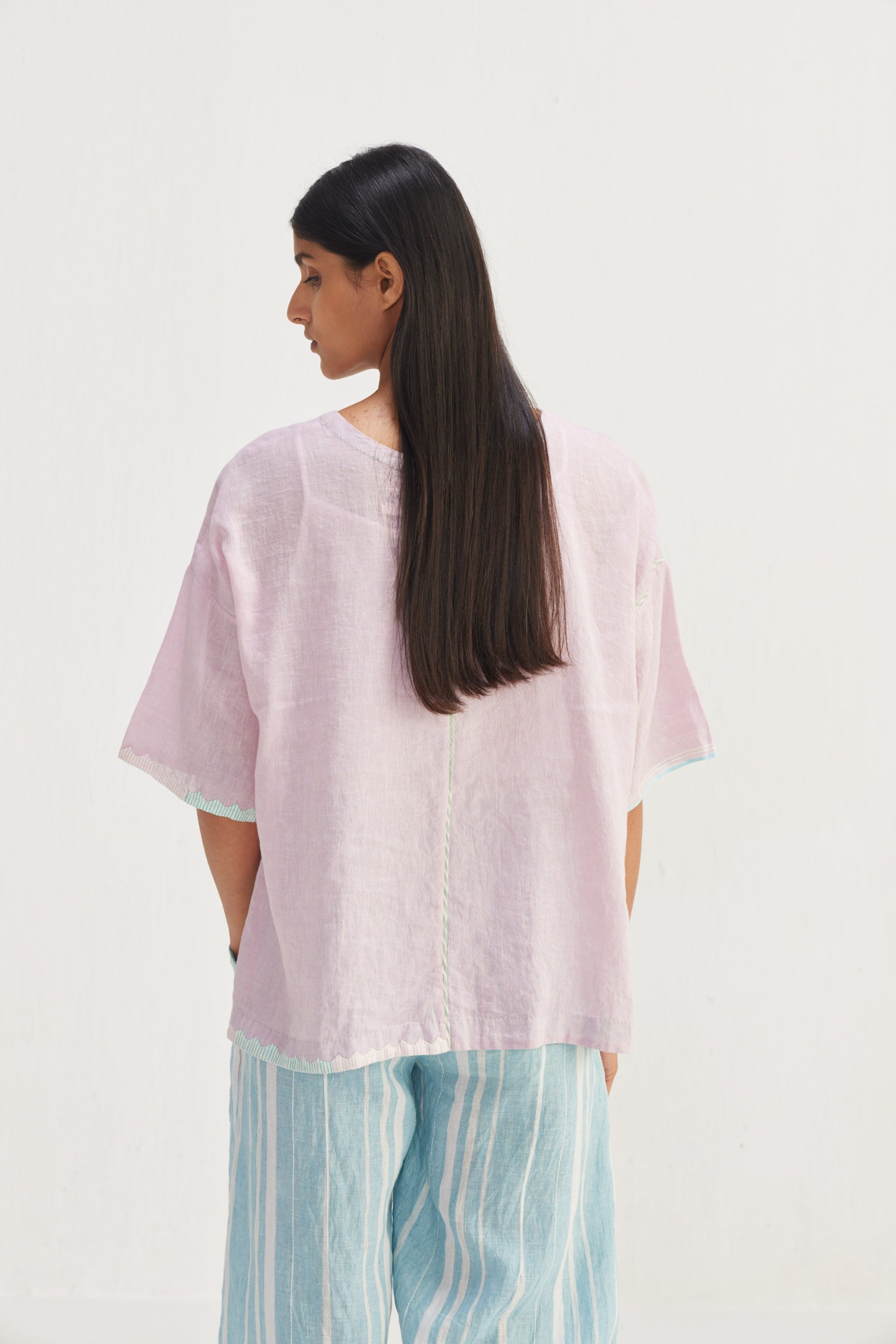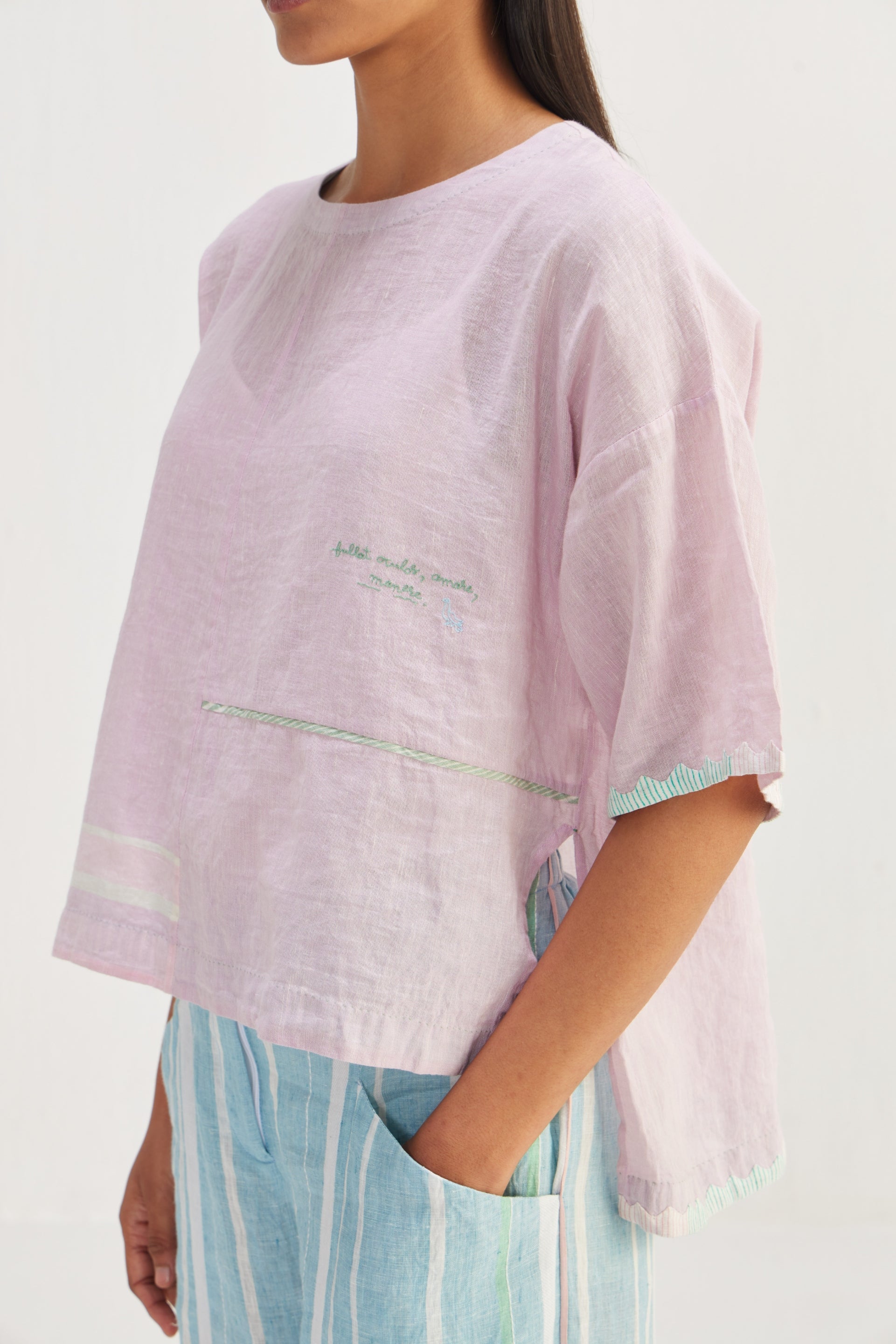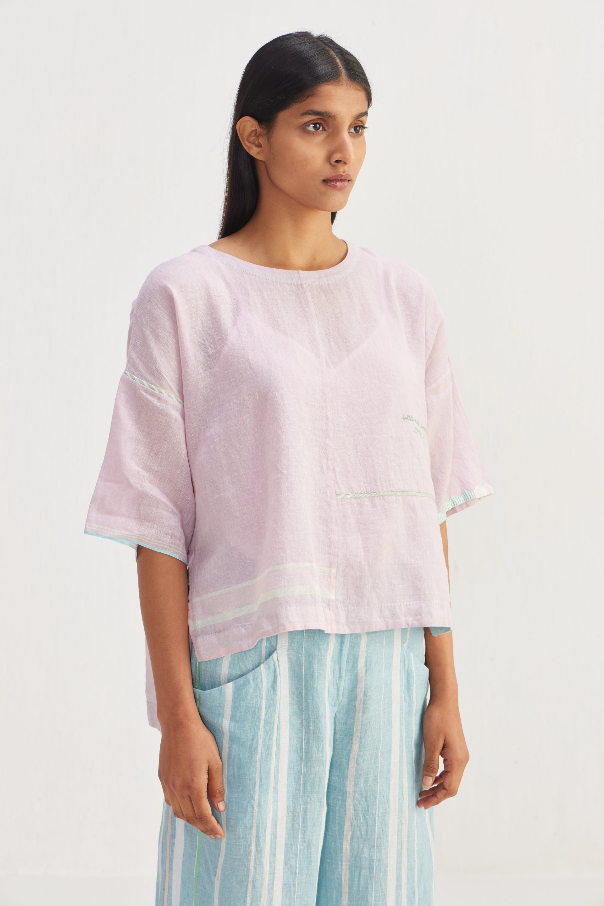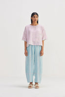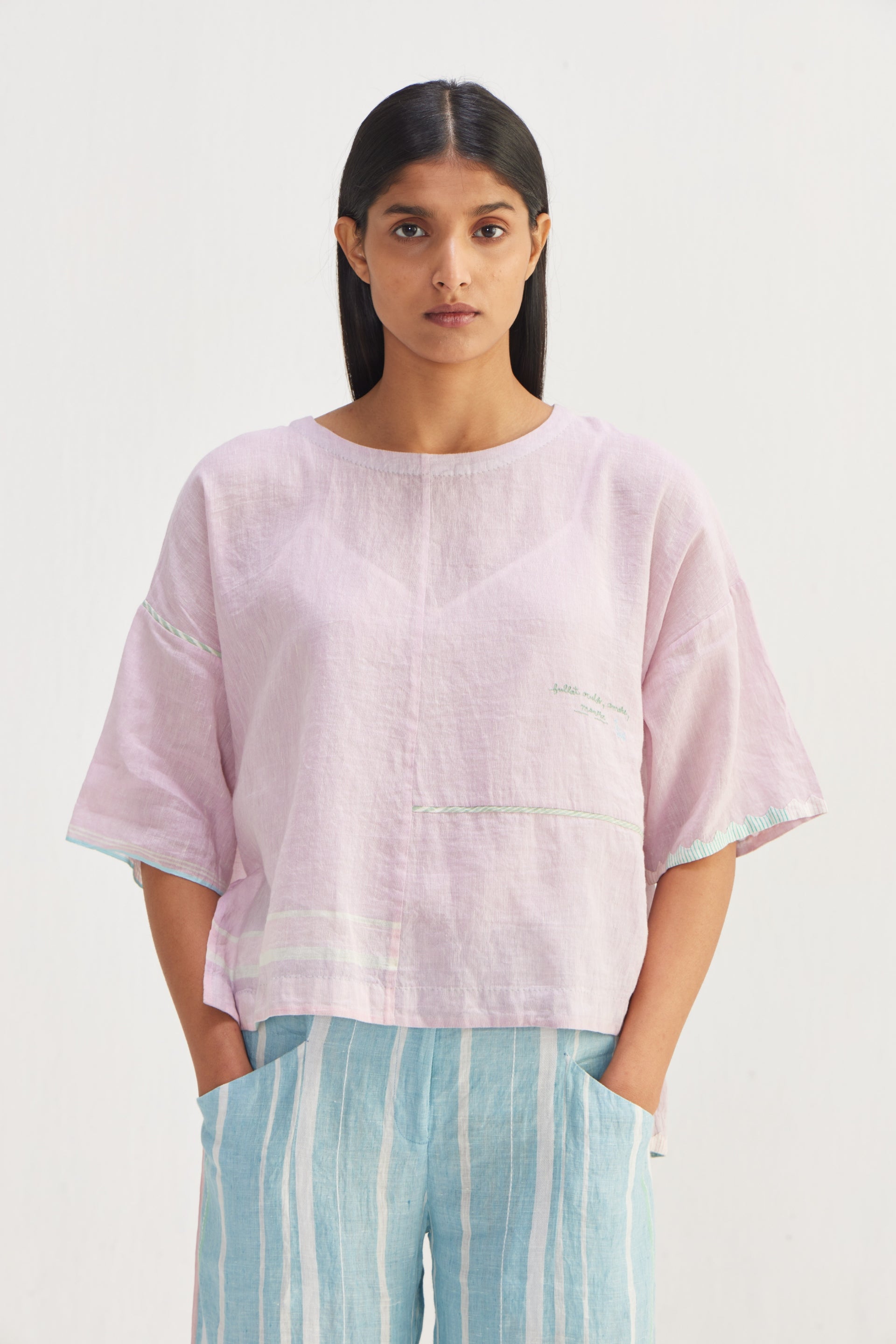 Short top featuring a woven border design with intricate chevron appliqué embroidery. Highlighted by contrast hand block print striper piping detail, this top offers a unique blend of elegance and sophistication.
