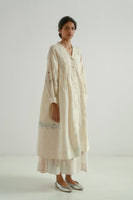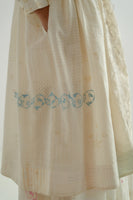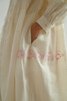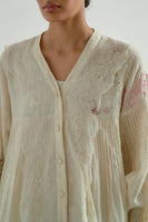 A front-button V-neck dress with pintuck detailing on the bodice and lace inserts along the placket. Featuring hand-cut embroidered inserts and a cotton-silk blend fabric with a hand-block printed collage pattern , beautifully accented by scattered multicolor floral embroidery.