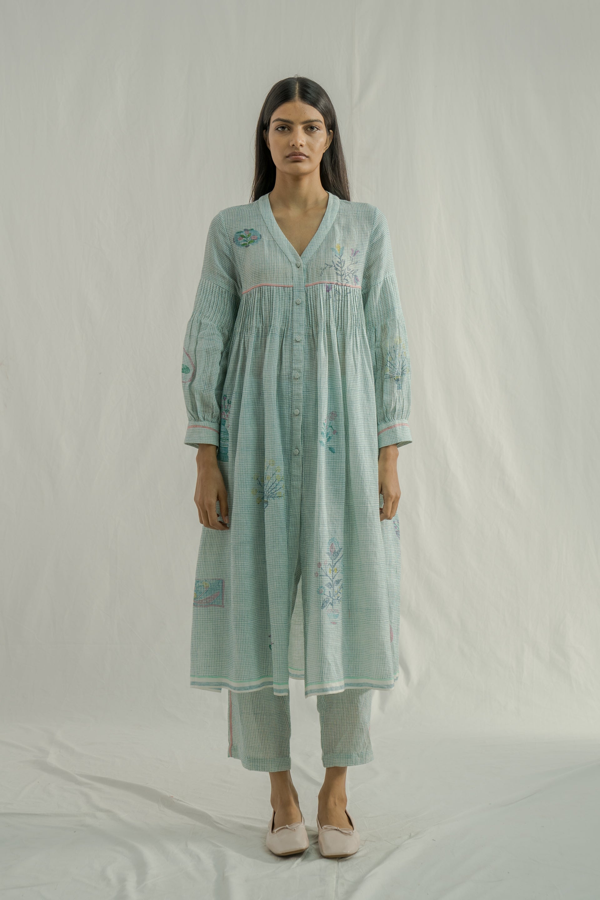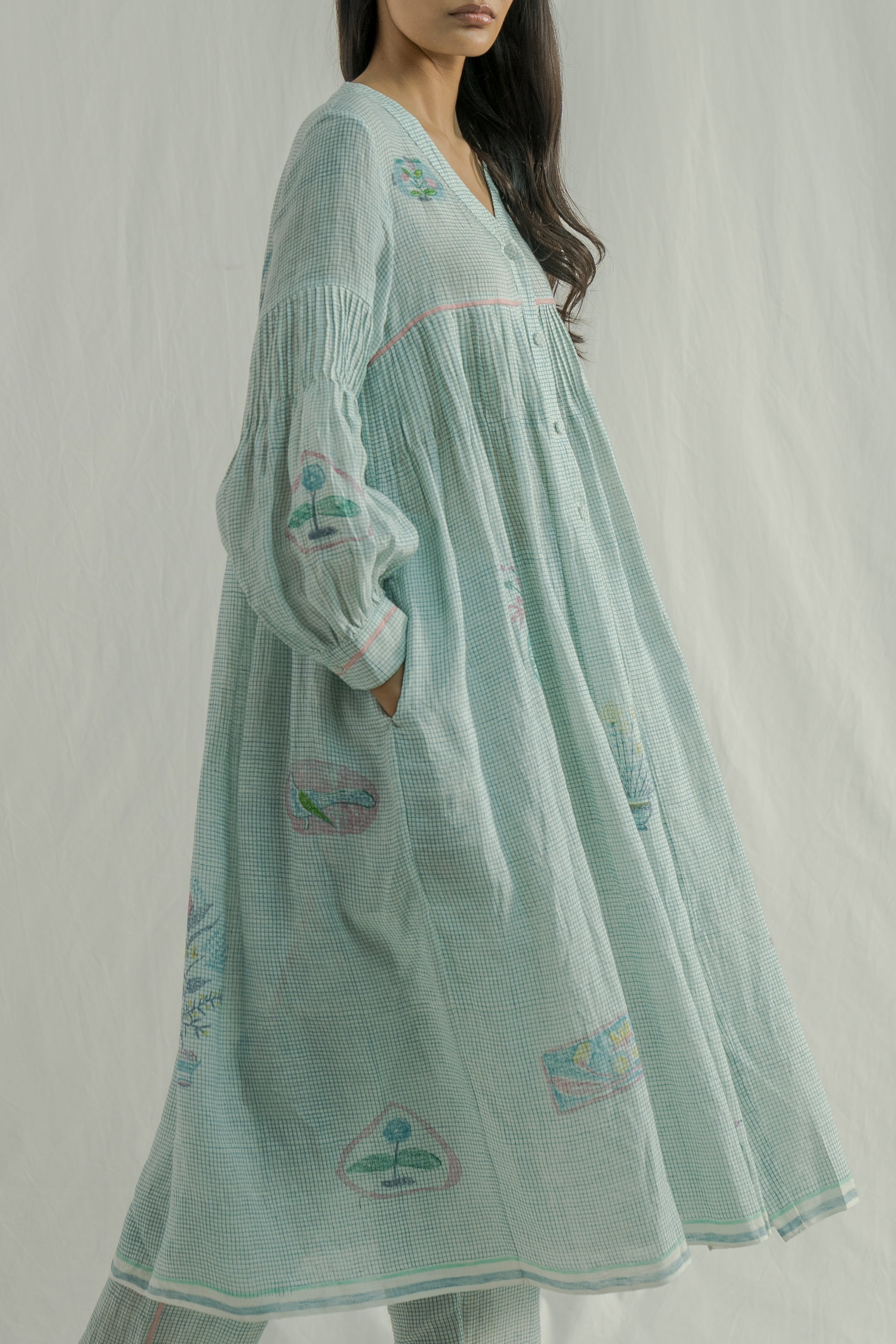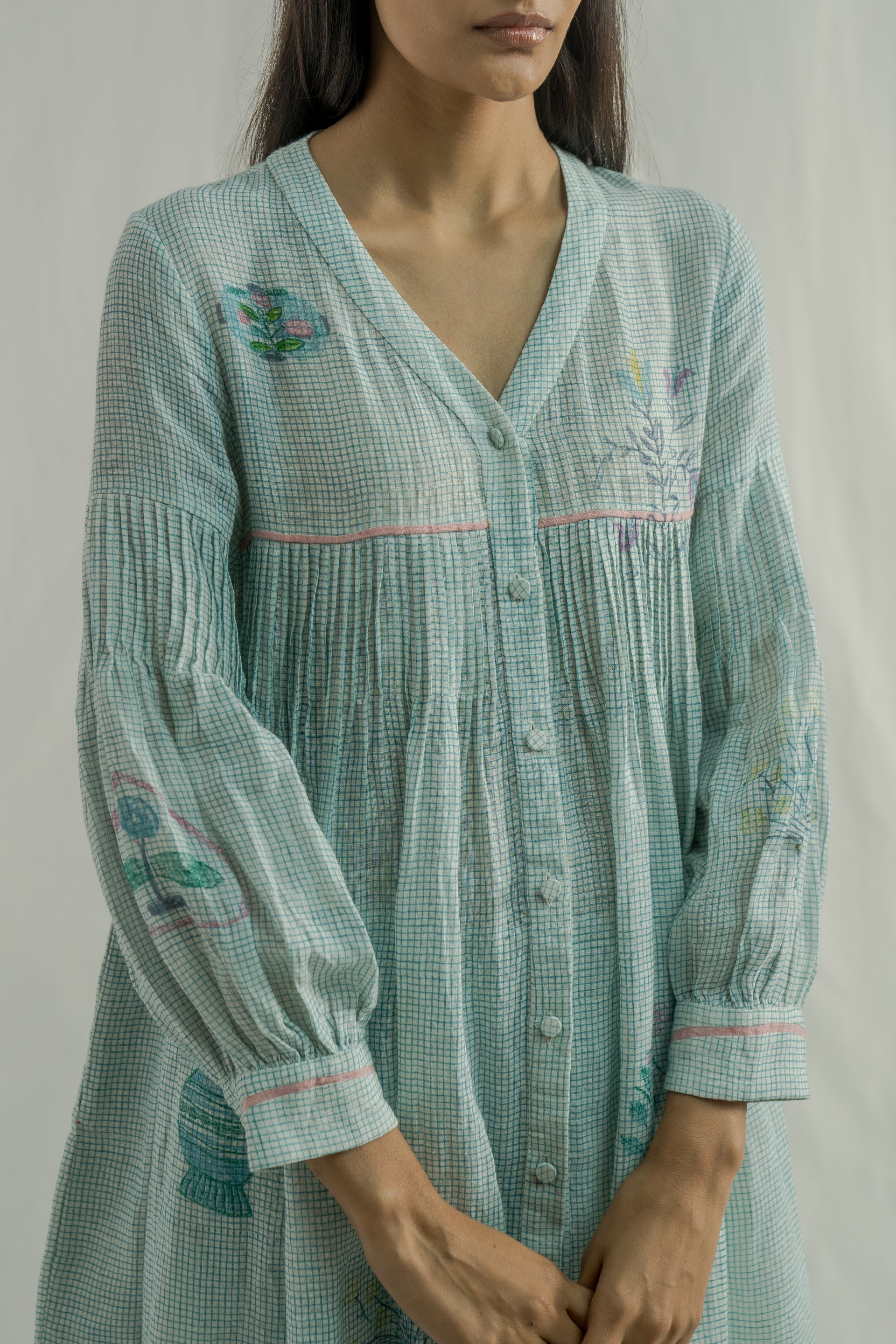 Front-open, button-down dress featuring a V-neckline and all-over pintuck detailing on the bodice, along with a contrast selvedge finish. Made from 100% linen, it showcases fine checks and a multicolor placement hand-block print. The dress comes with a separate cotton-silk lining, featuring a delicate organza trim at the bottom.
