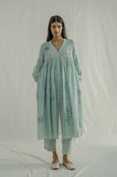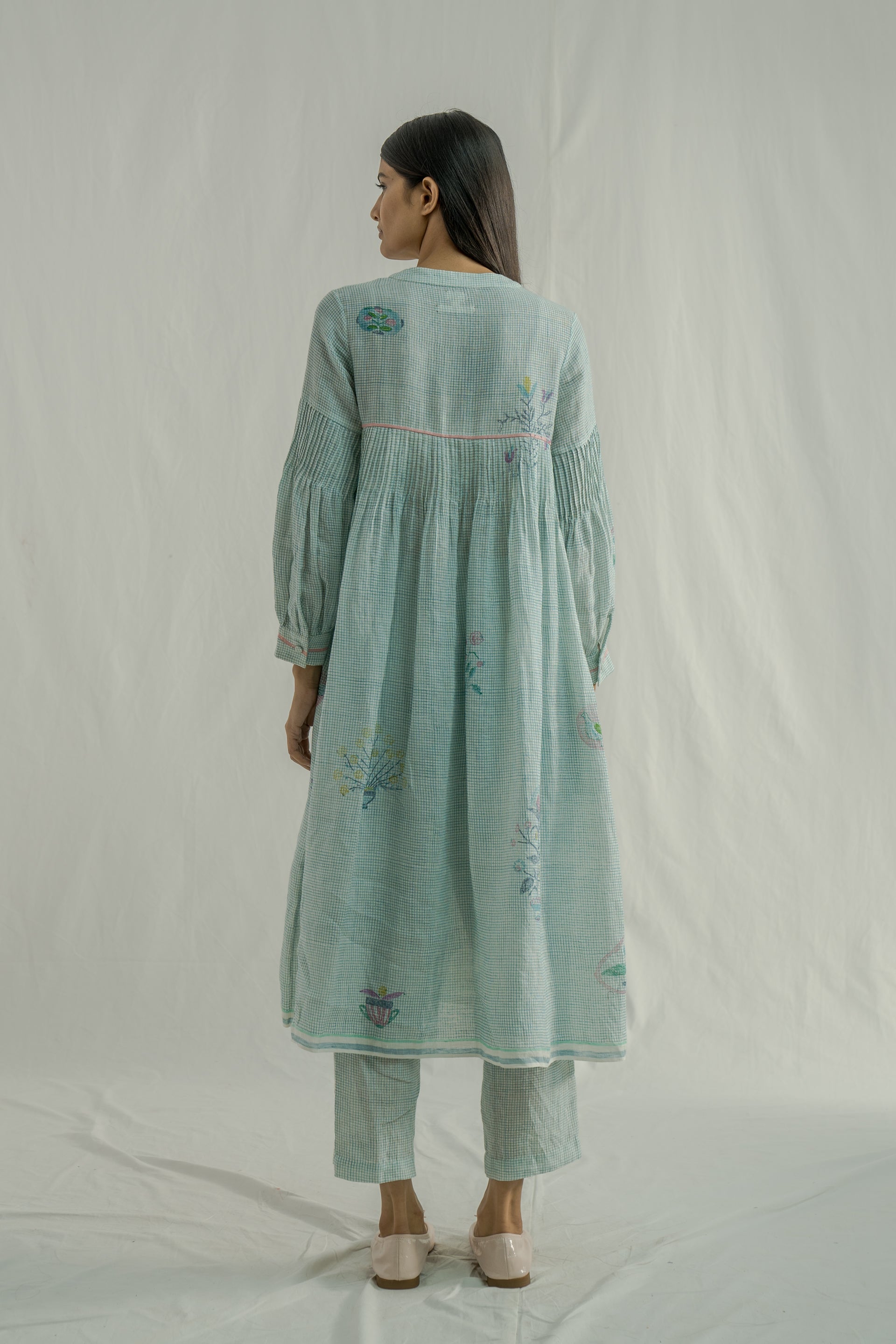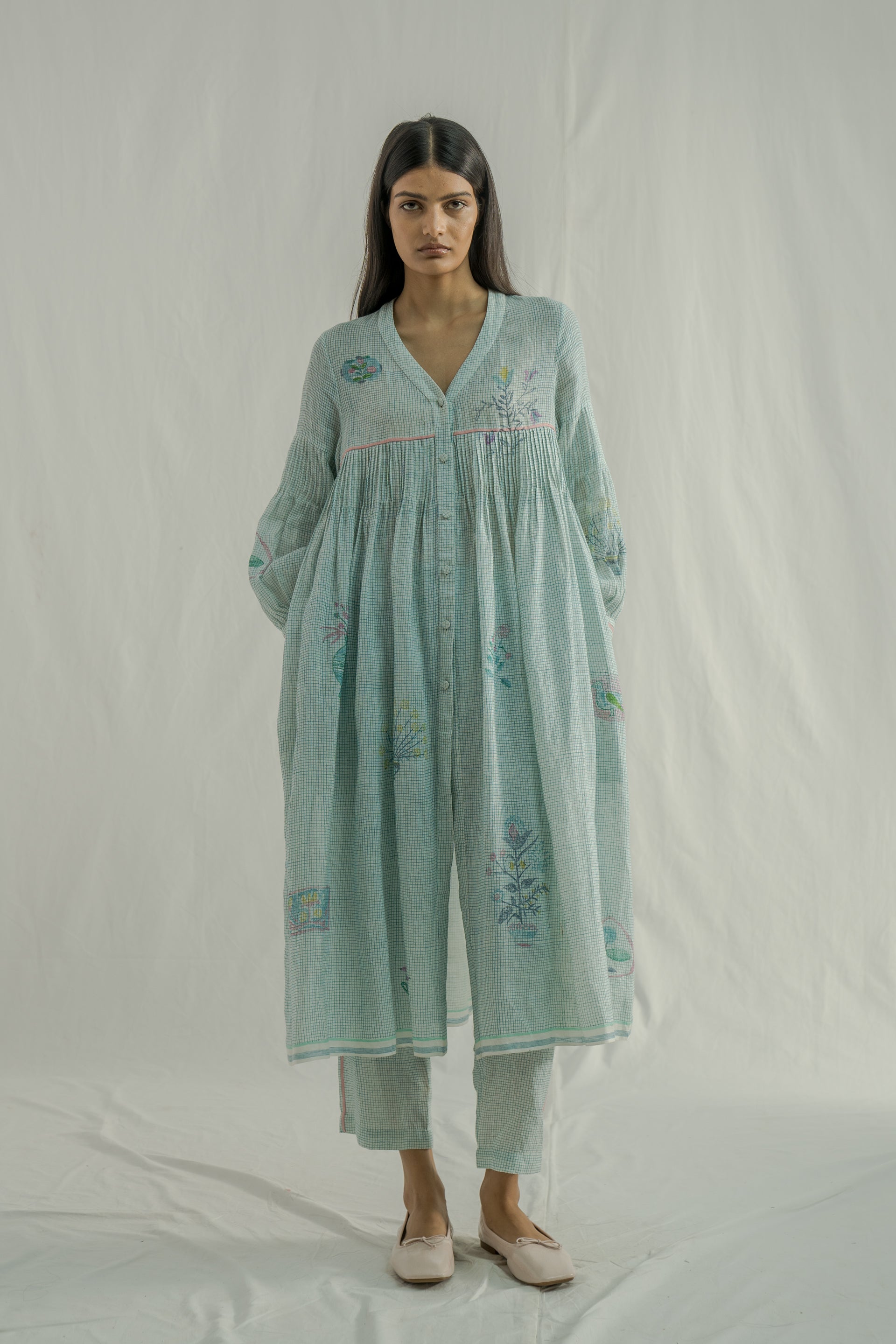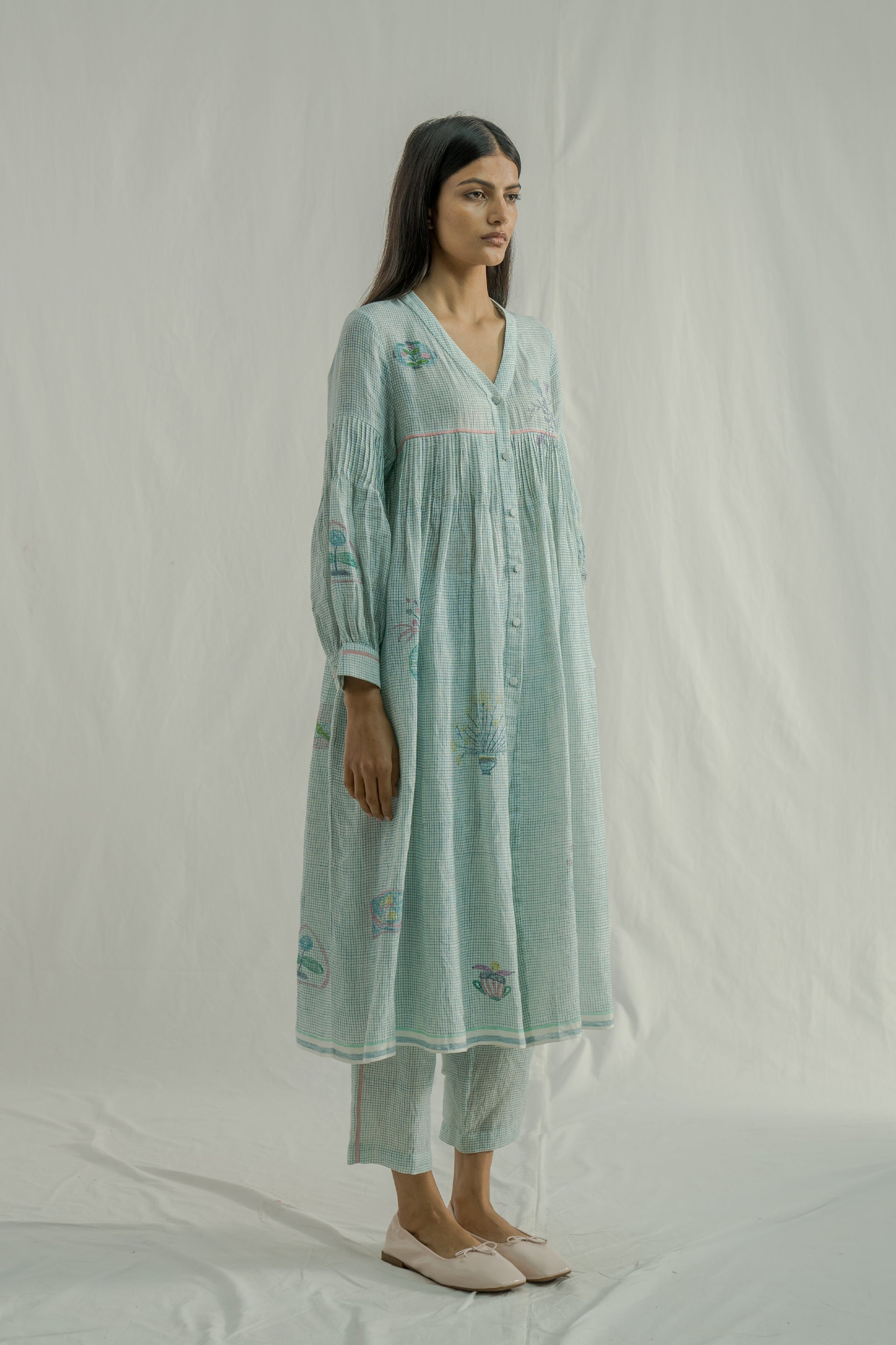 Front-open, button-down dress featuring a V-neckline and all-over pintuck detailing on the bodice, along with a contrast selvedge finish. Made from 100% linen, it showcases fine checks and a multicolor placement hand-block print. The dress comes with a separate cotton-silk lining, featuring a delicate organza trim at the bottom.
