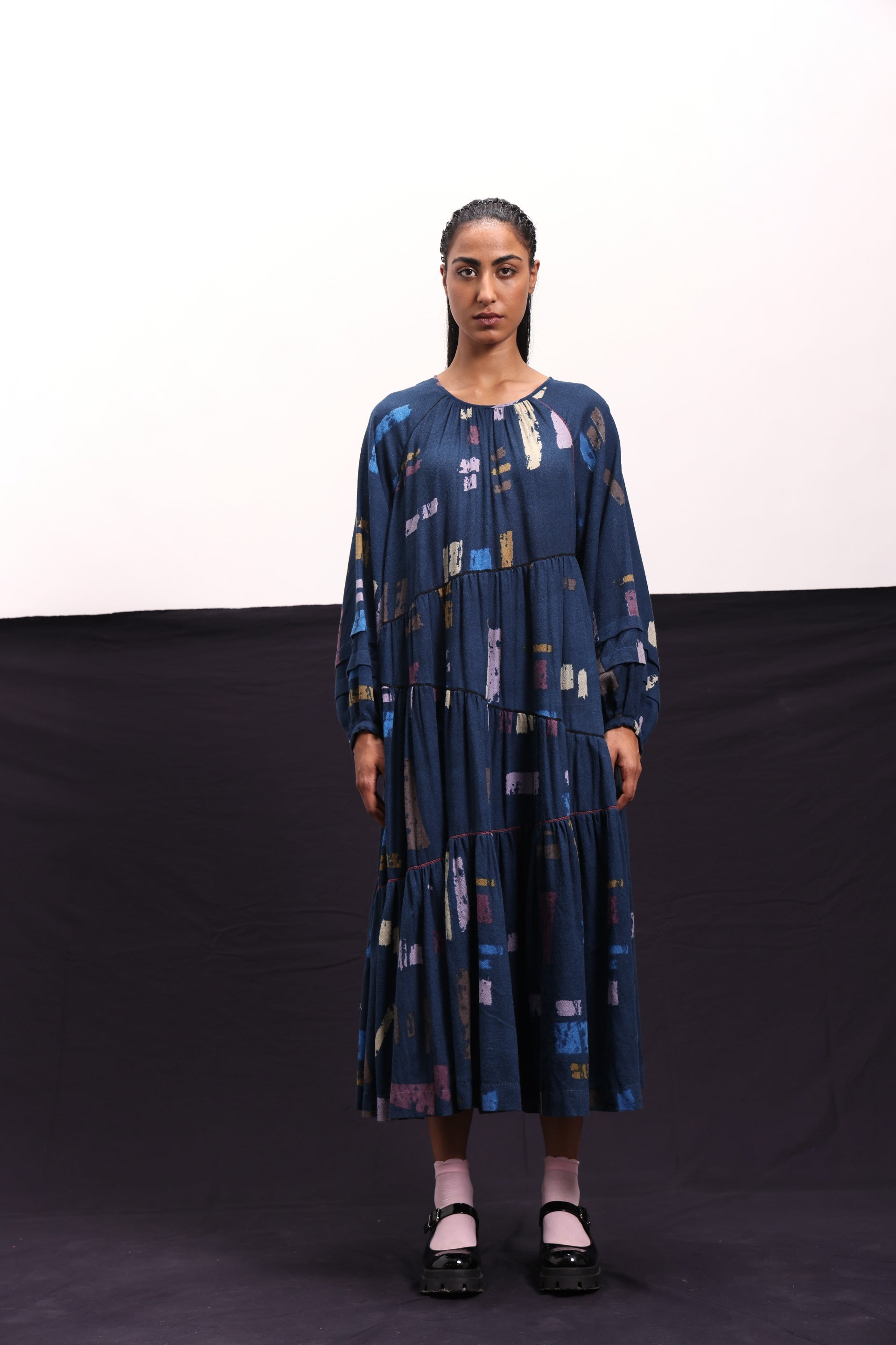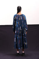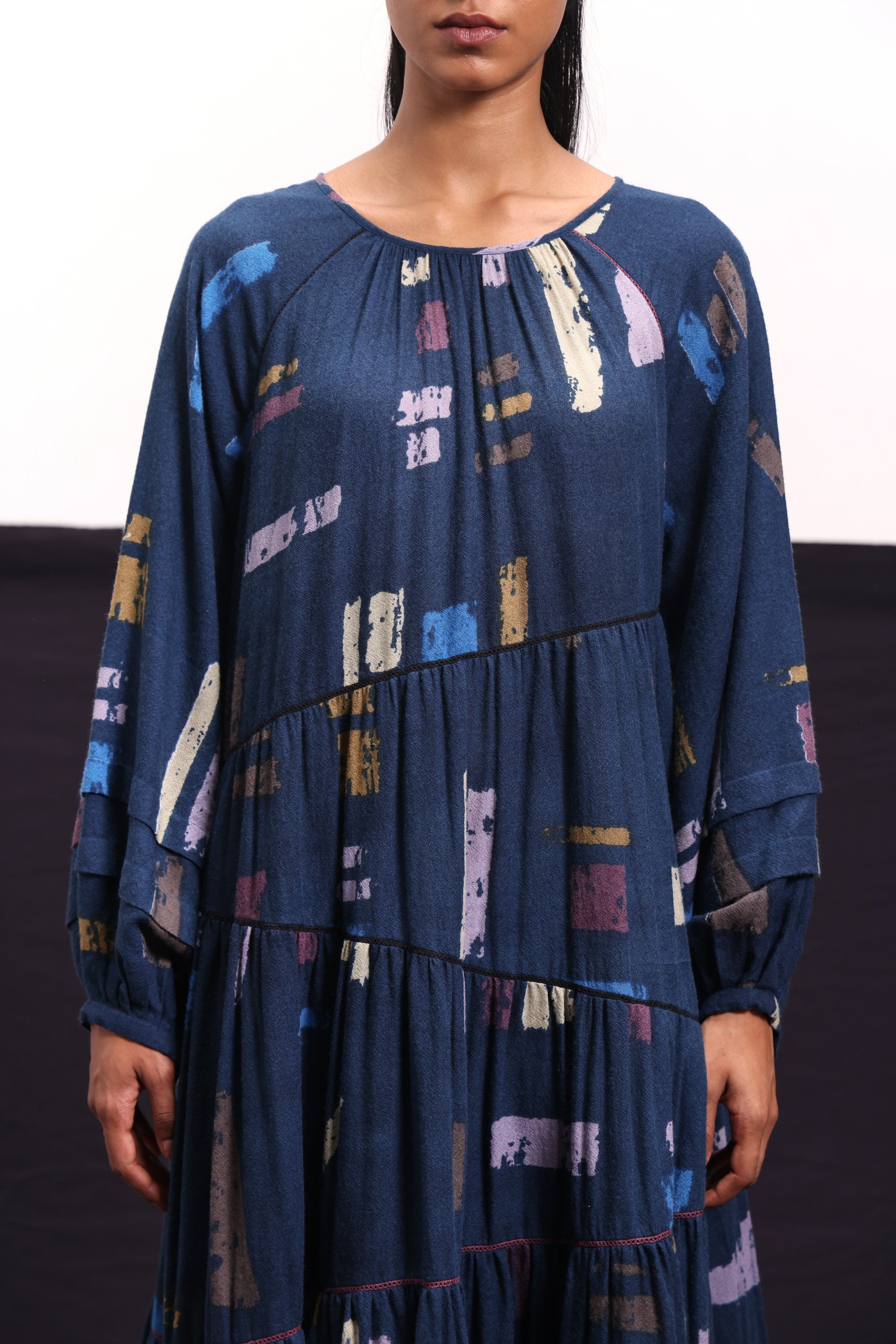 Midi dress constructed in abstract blocks print with criss - cross lace inserts