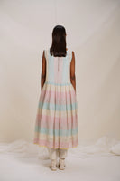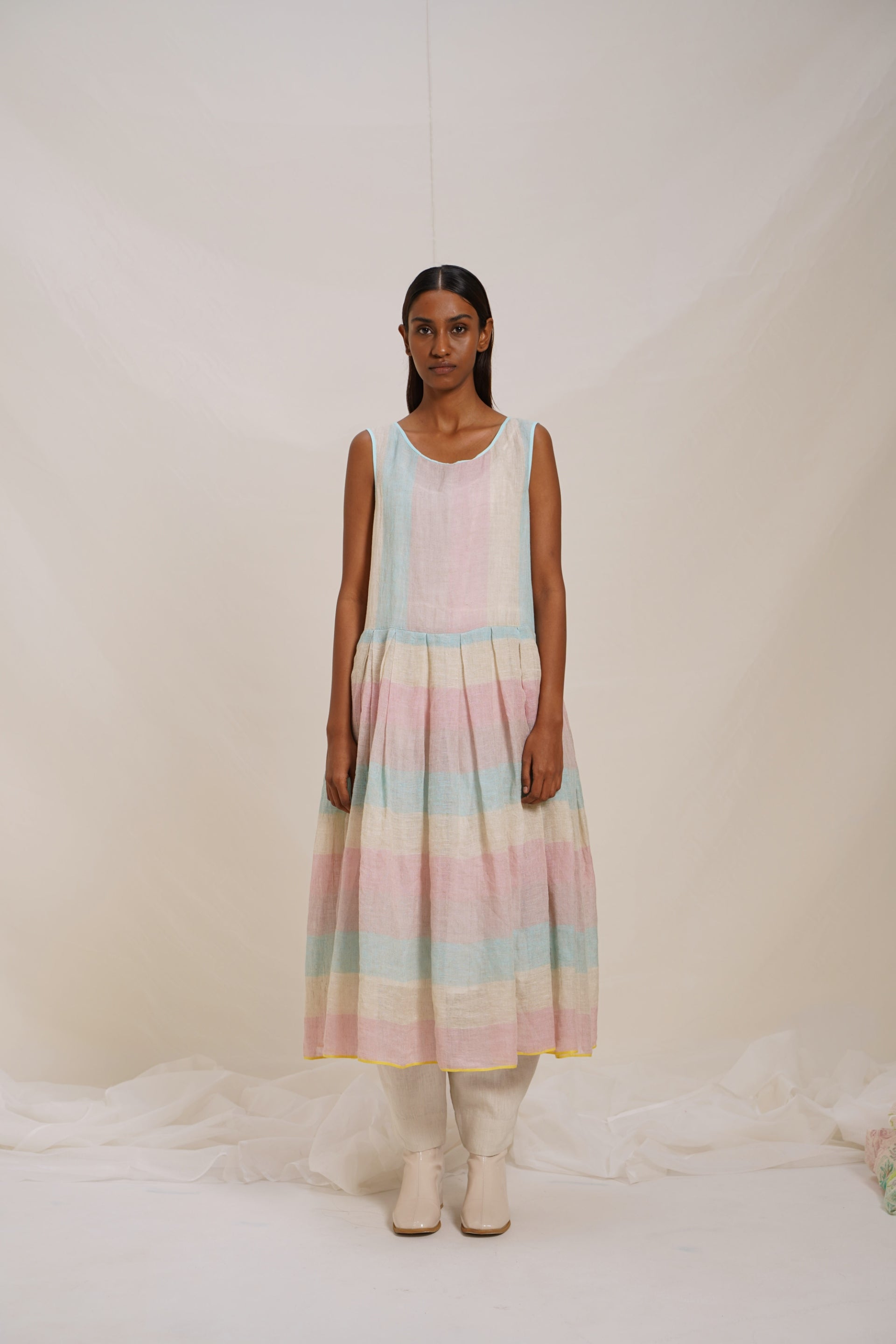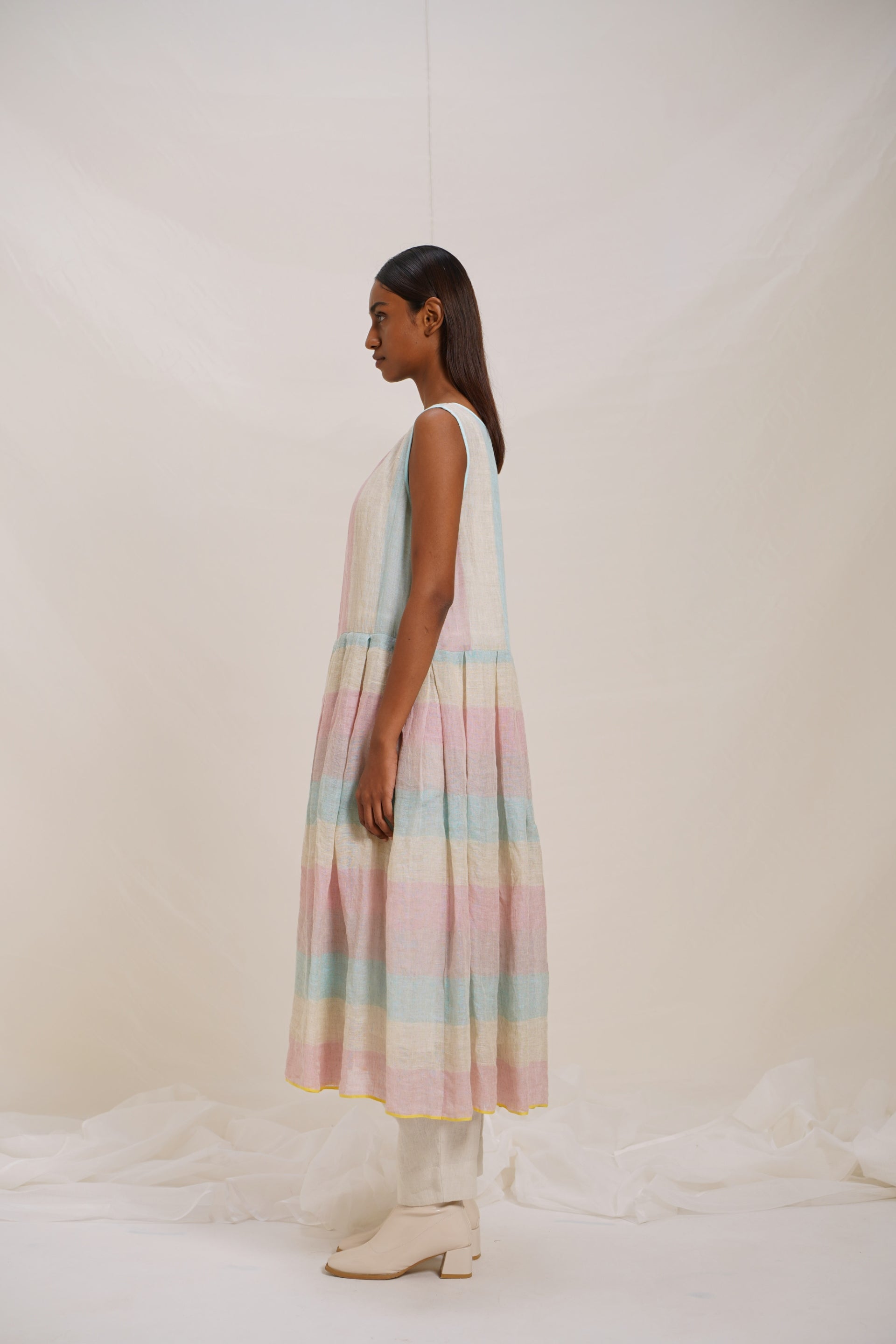 Sleeveless striper dress features inverted box pleats for added texture and dimension, along with a selvedge on the hem for a clean finish. Complete with an attached all-over hand block text printed lining.