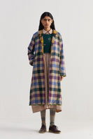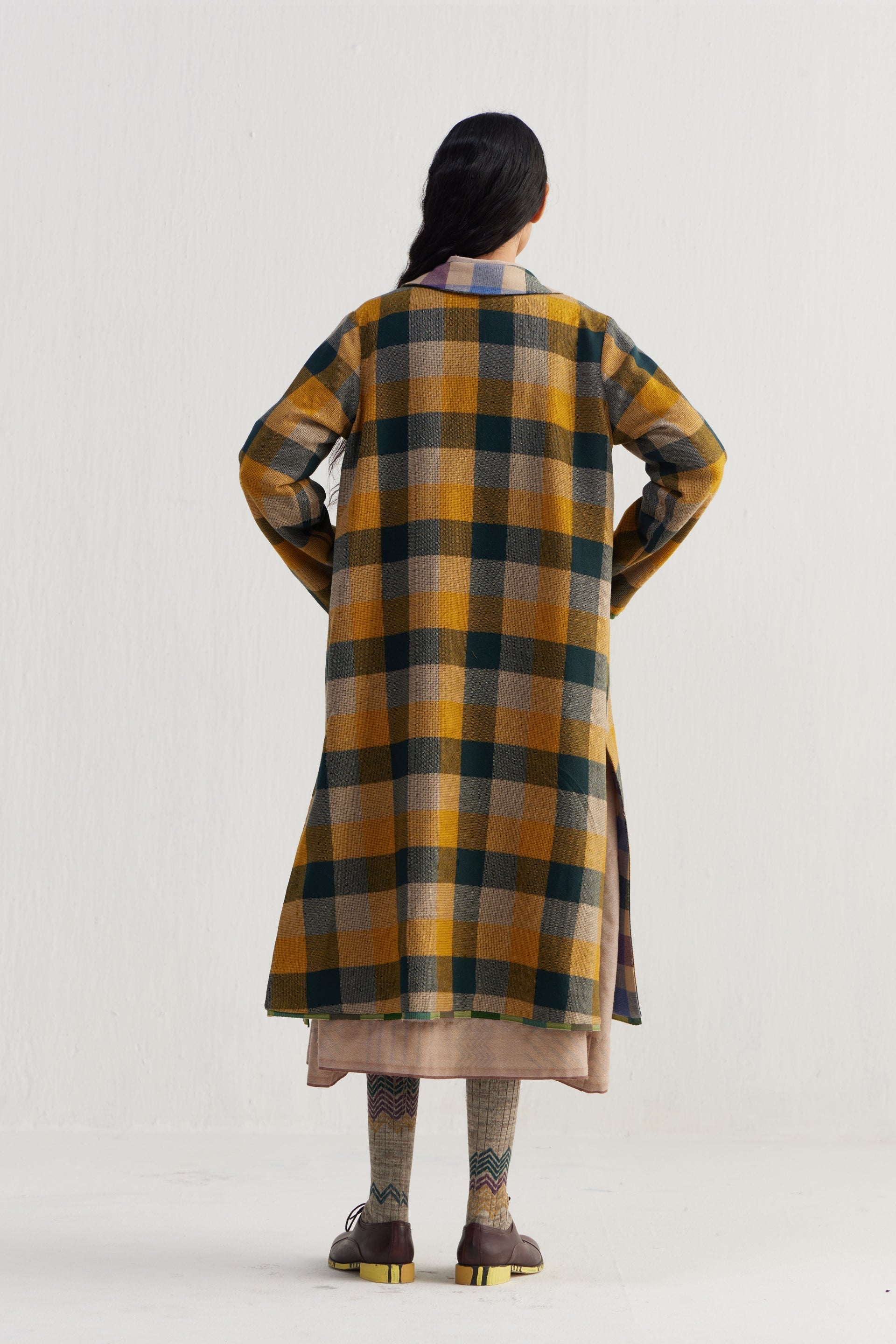 Reversible straight fit flat collar button down full sleeves jacket. Constructed in multicolor checkered 100% merino wool fabric. Finished with tonal selvedge detail insert on hem and sleeves.