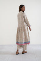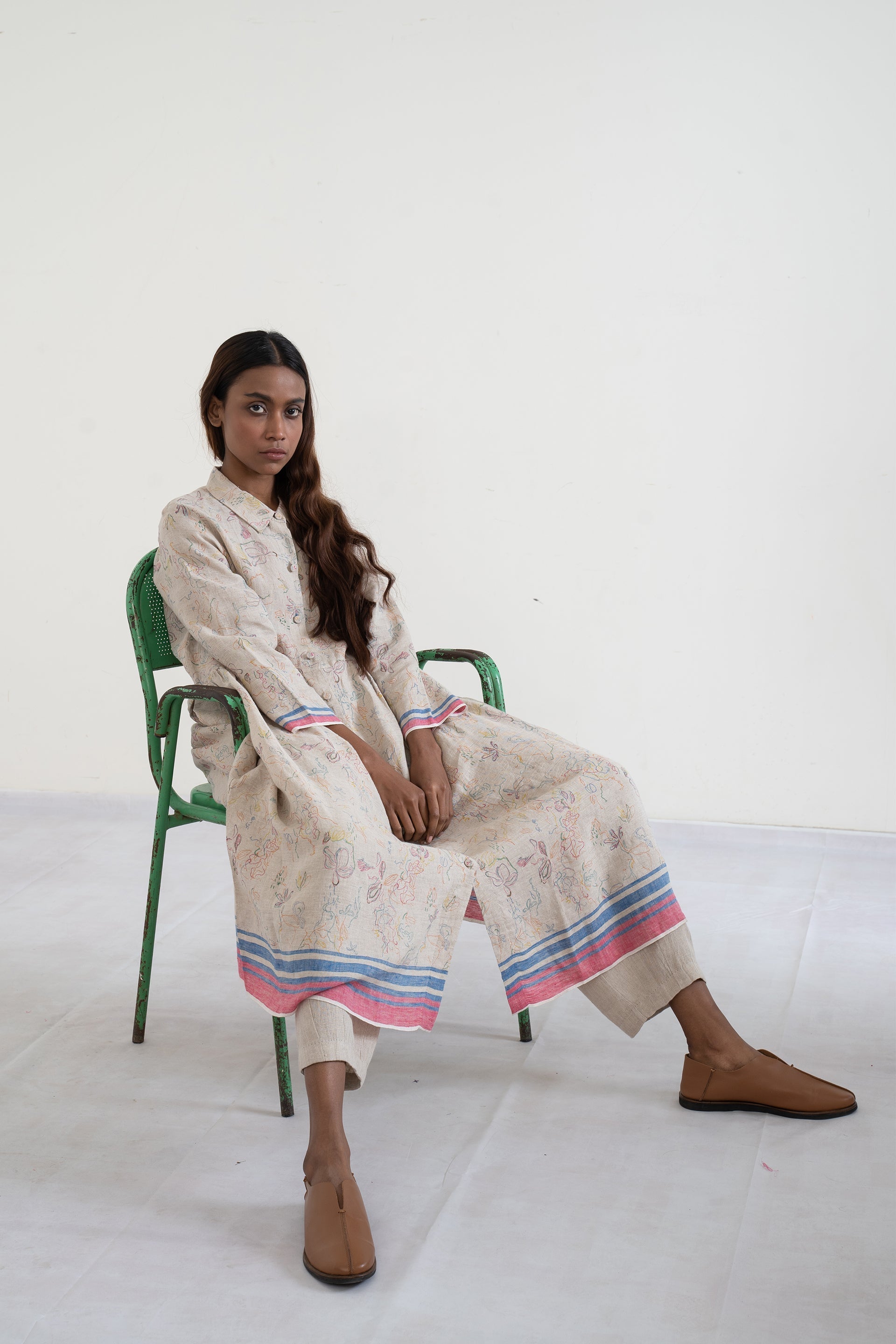 Collared buton-down jacket in handwoven, block-printed linen with gathered waist and contrast selvedge border on the hem