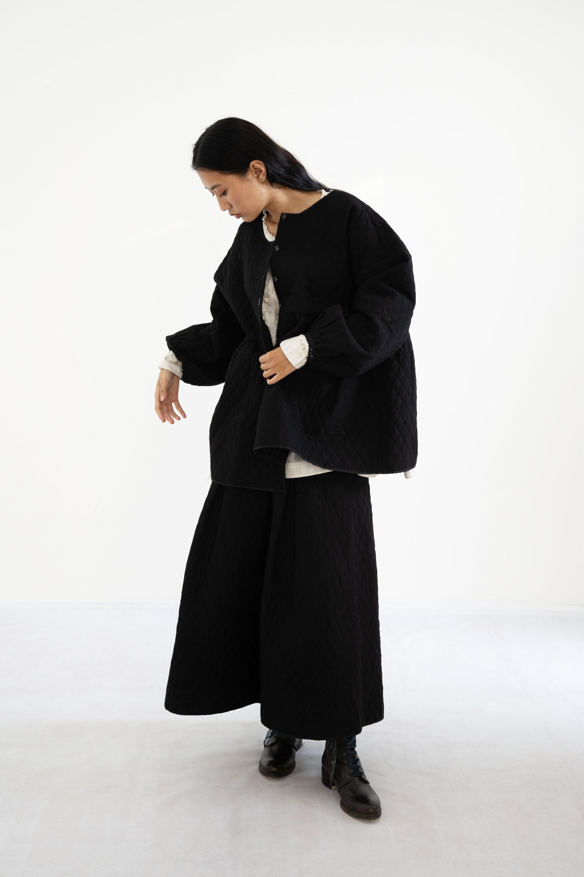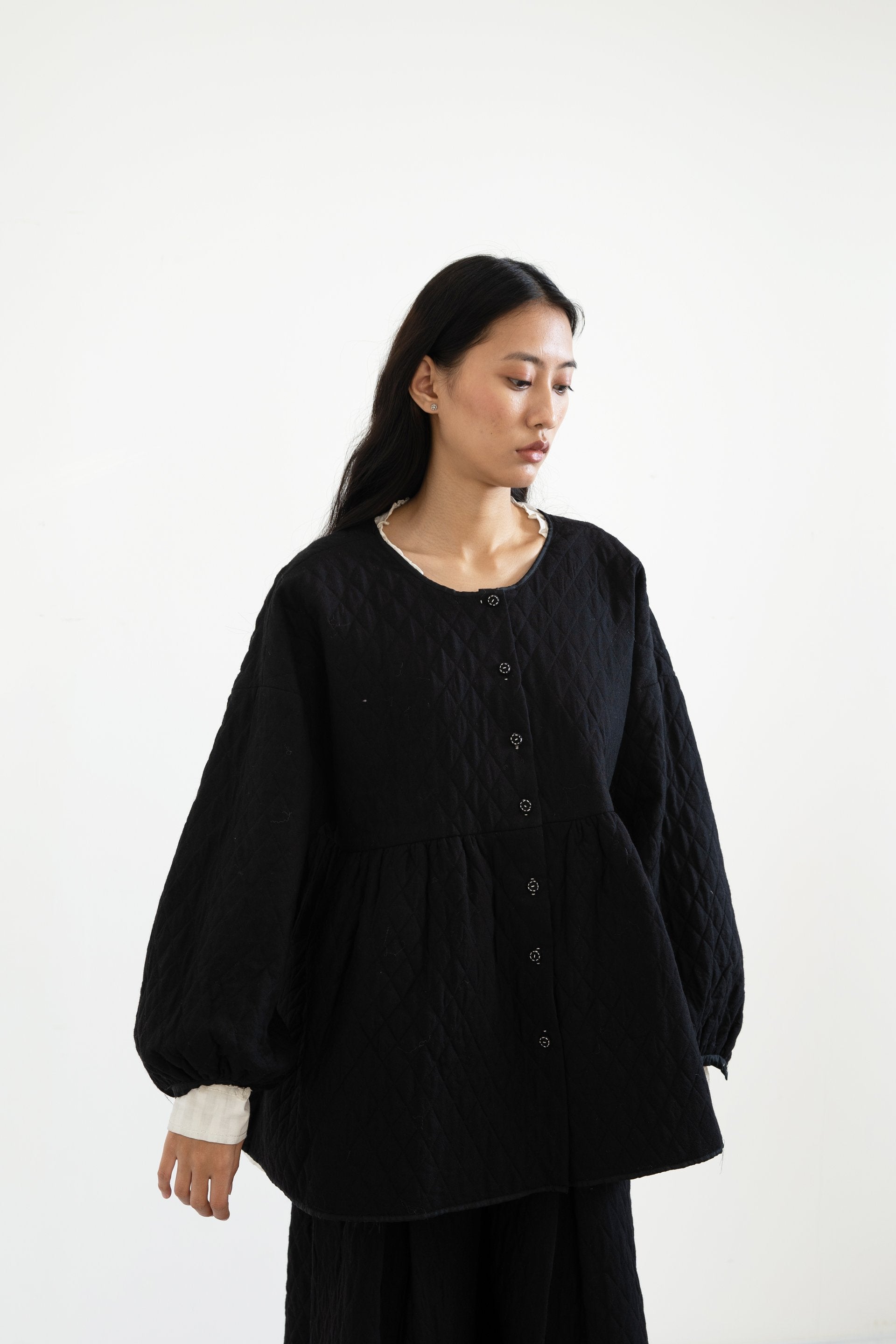 Round neck button-down quilted top in black 100% merino wool with voluminous sleeves and gathered waist, lined with handwoven silk.