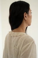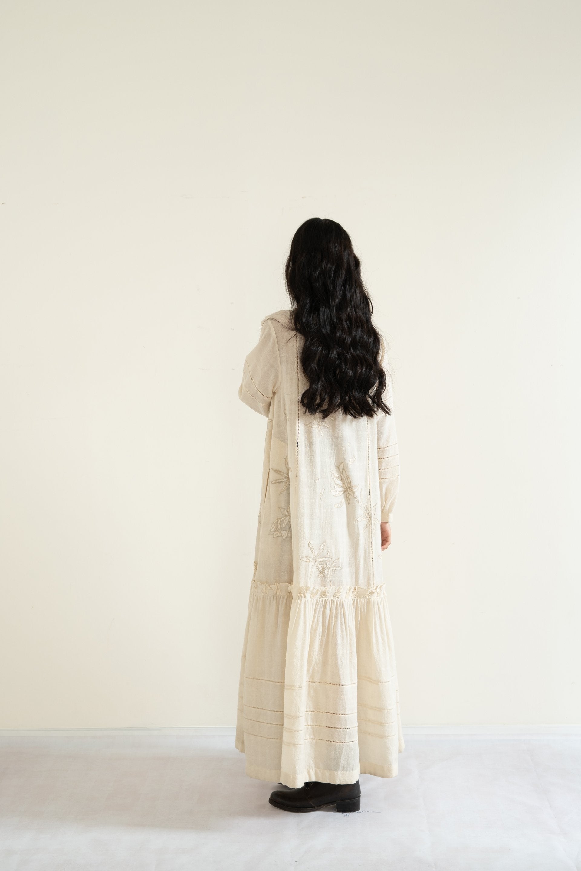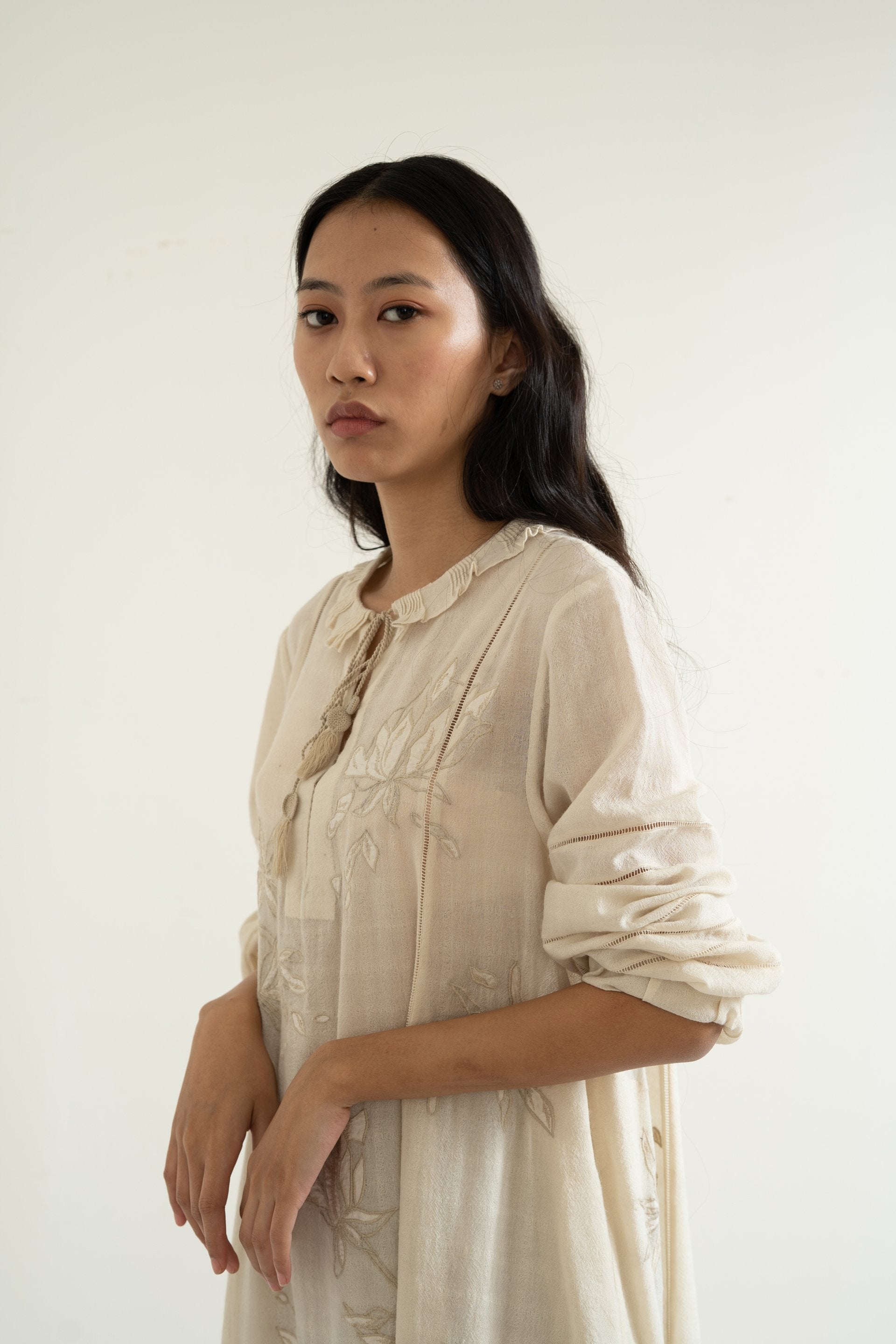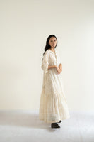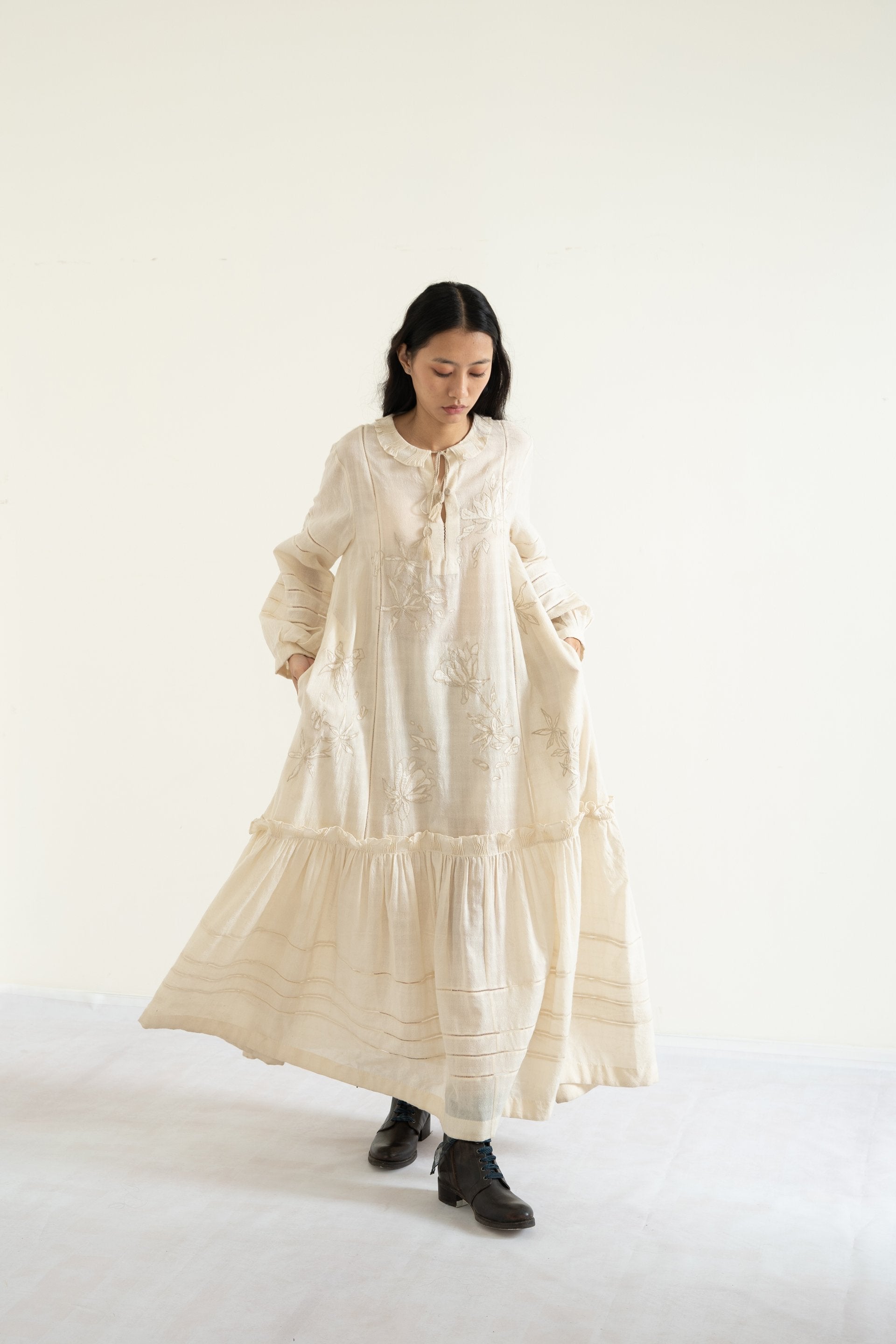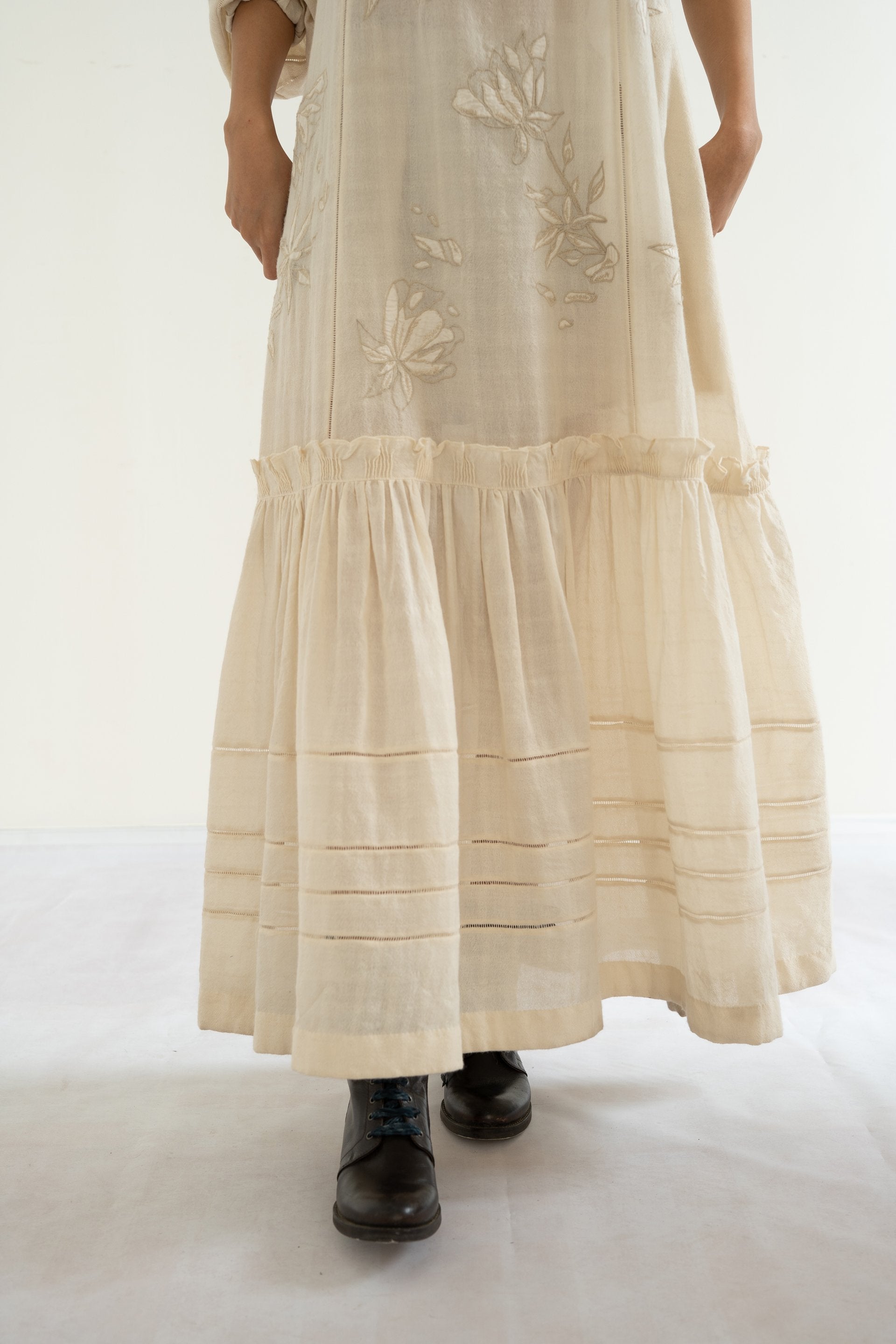 Ecru dress in wool-linen featuring hand-embroidered applique florals along with gathered trim on neckline, tiered bottom and lace inserts along sleeves, front and bottom panel.