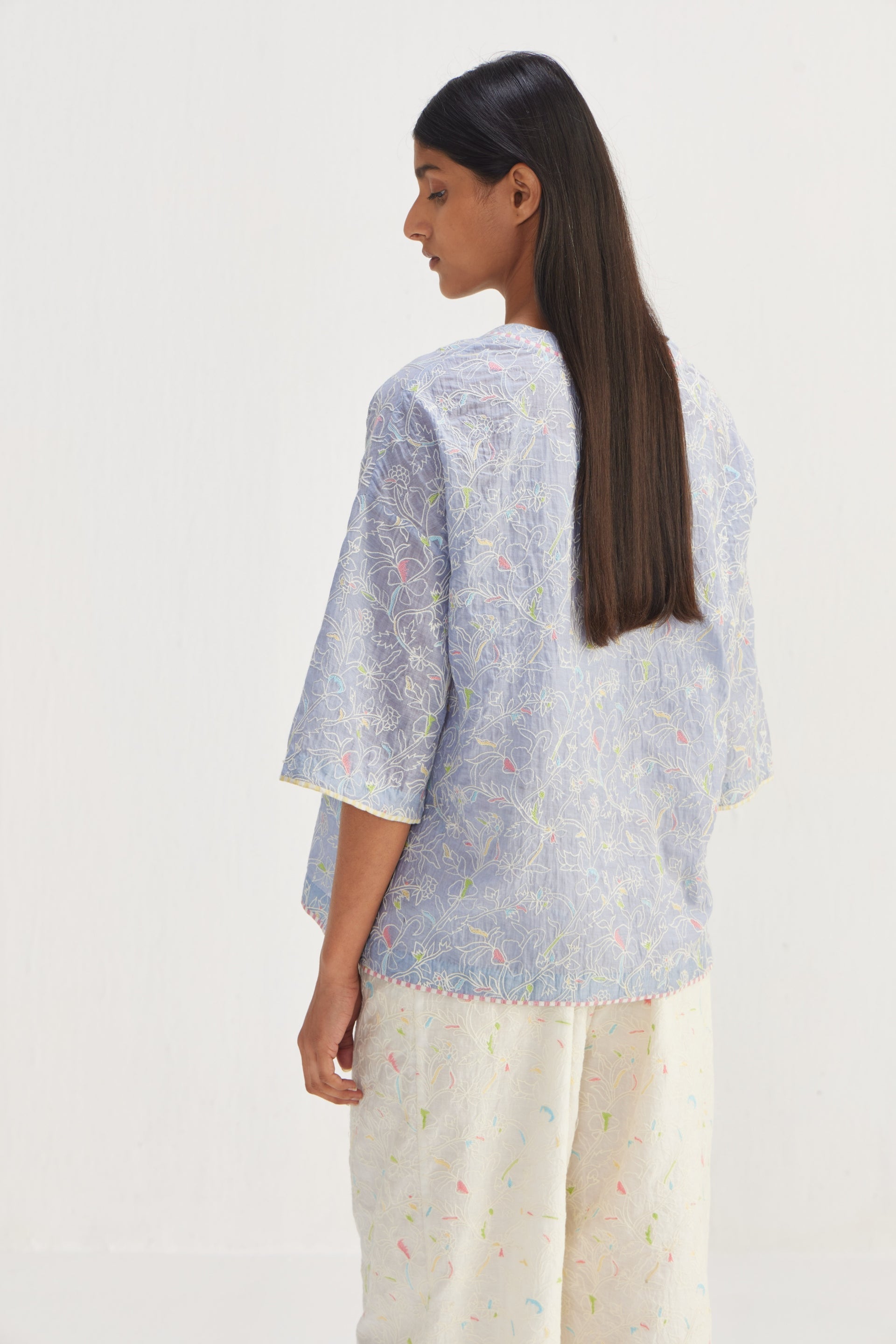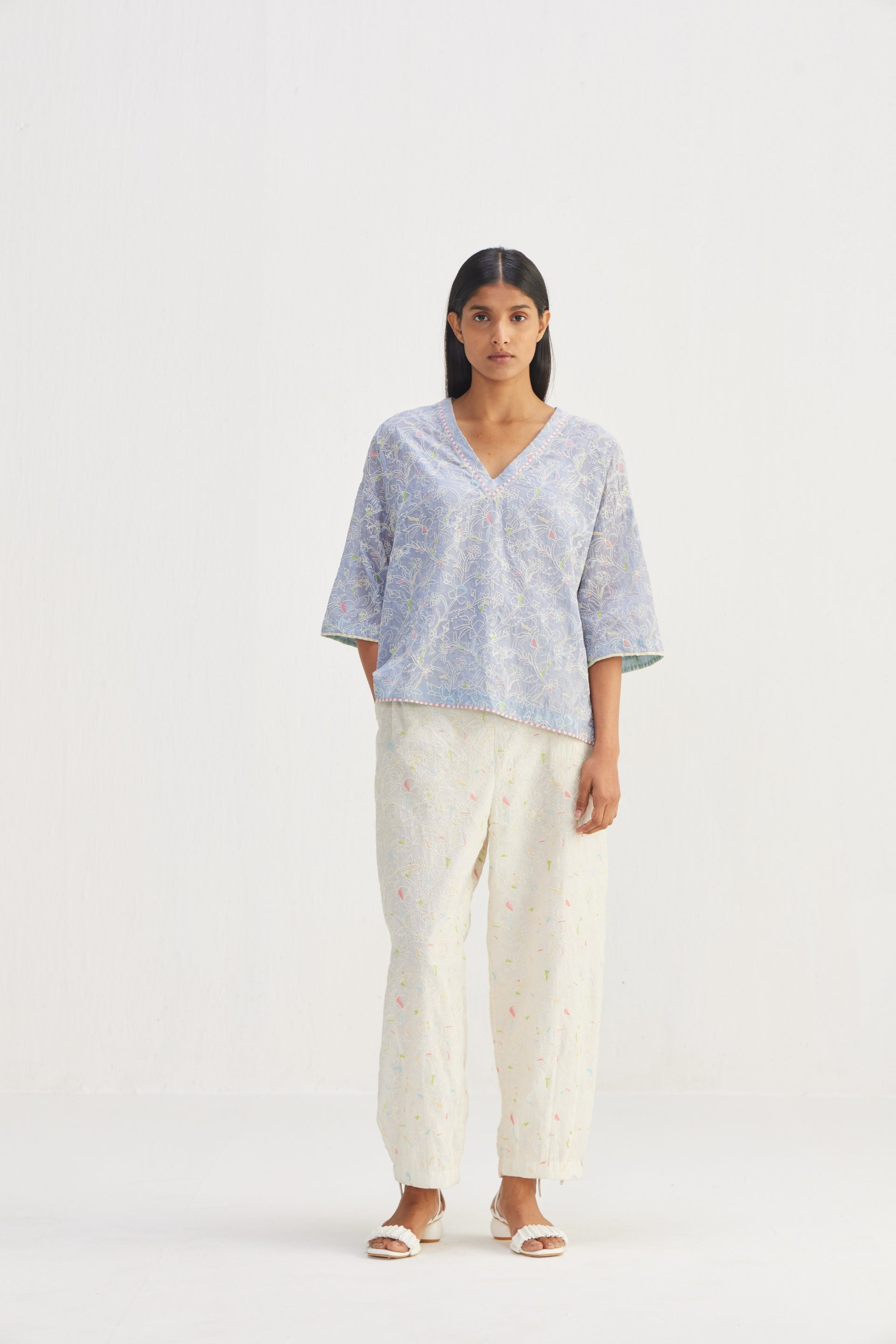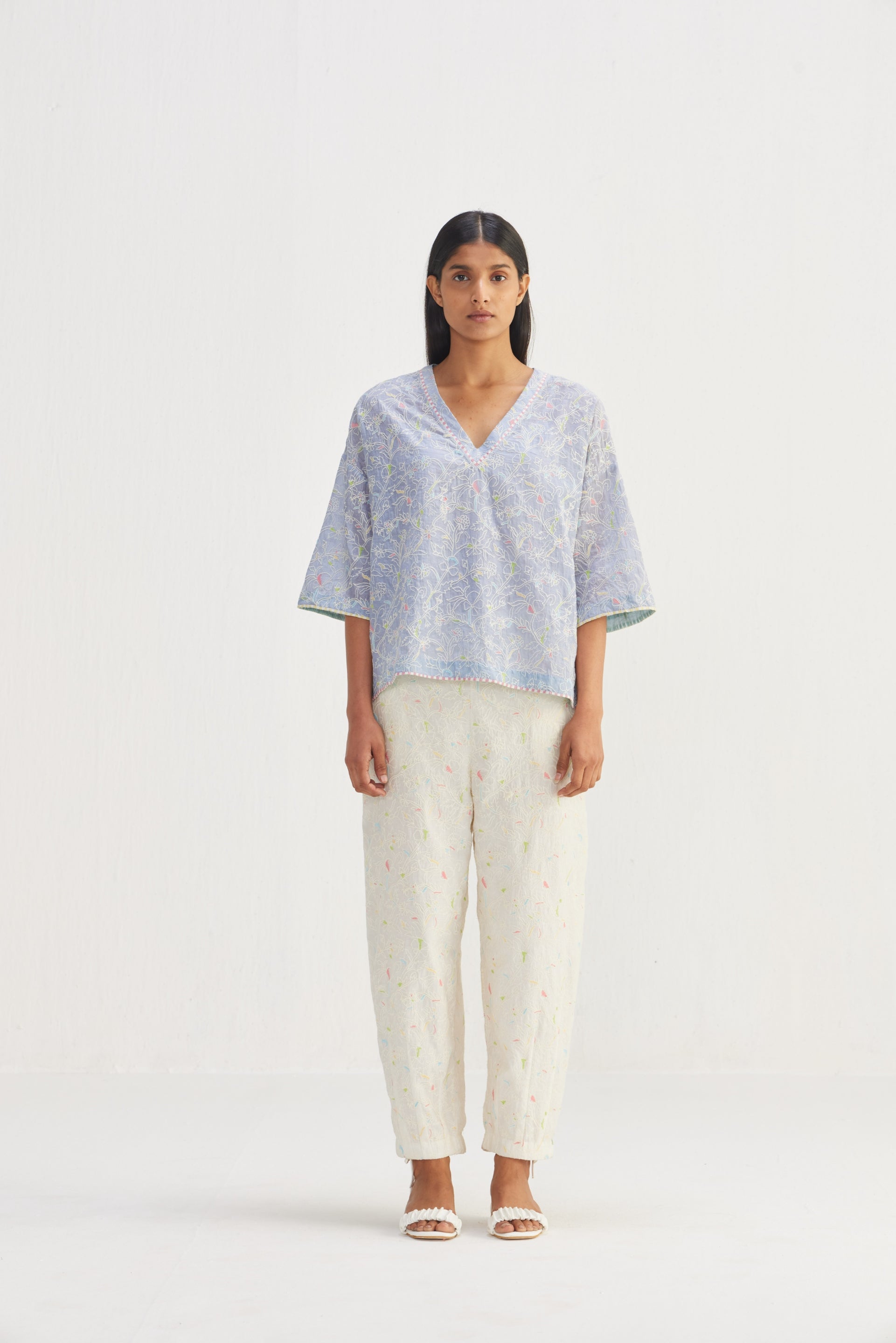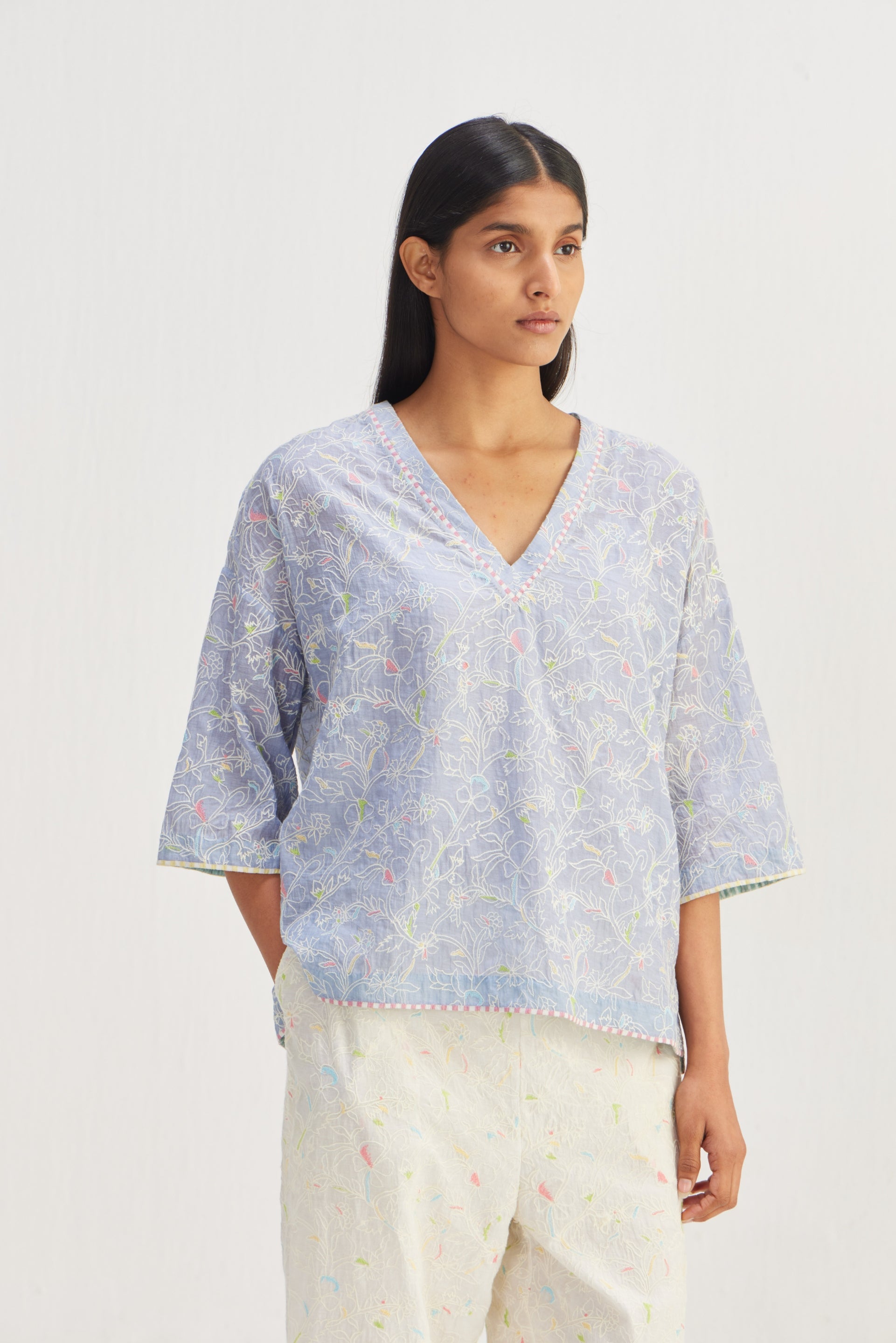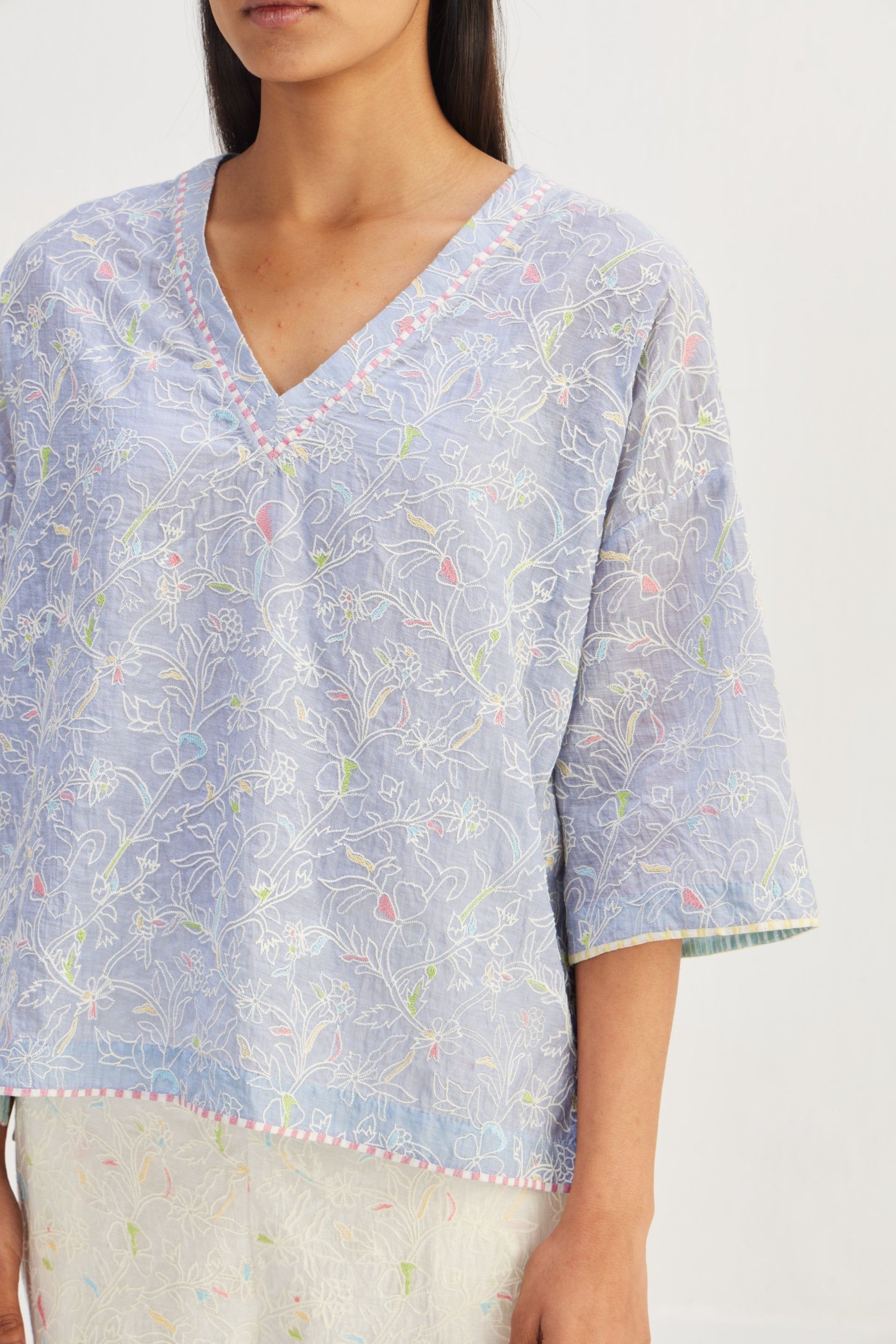 Short Boxy V-neckline Top, featuring side slits and adorned with floral embroidery detail throughout. Enhancing its appeal is the contrast hand block print striper piping detail, adding a touch of sophistication to this chic piece.