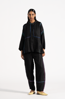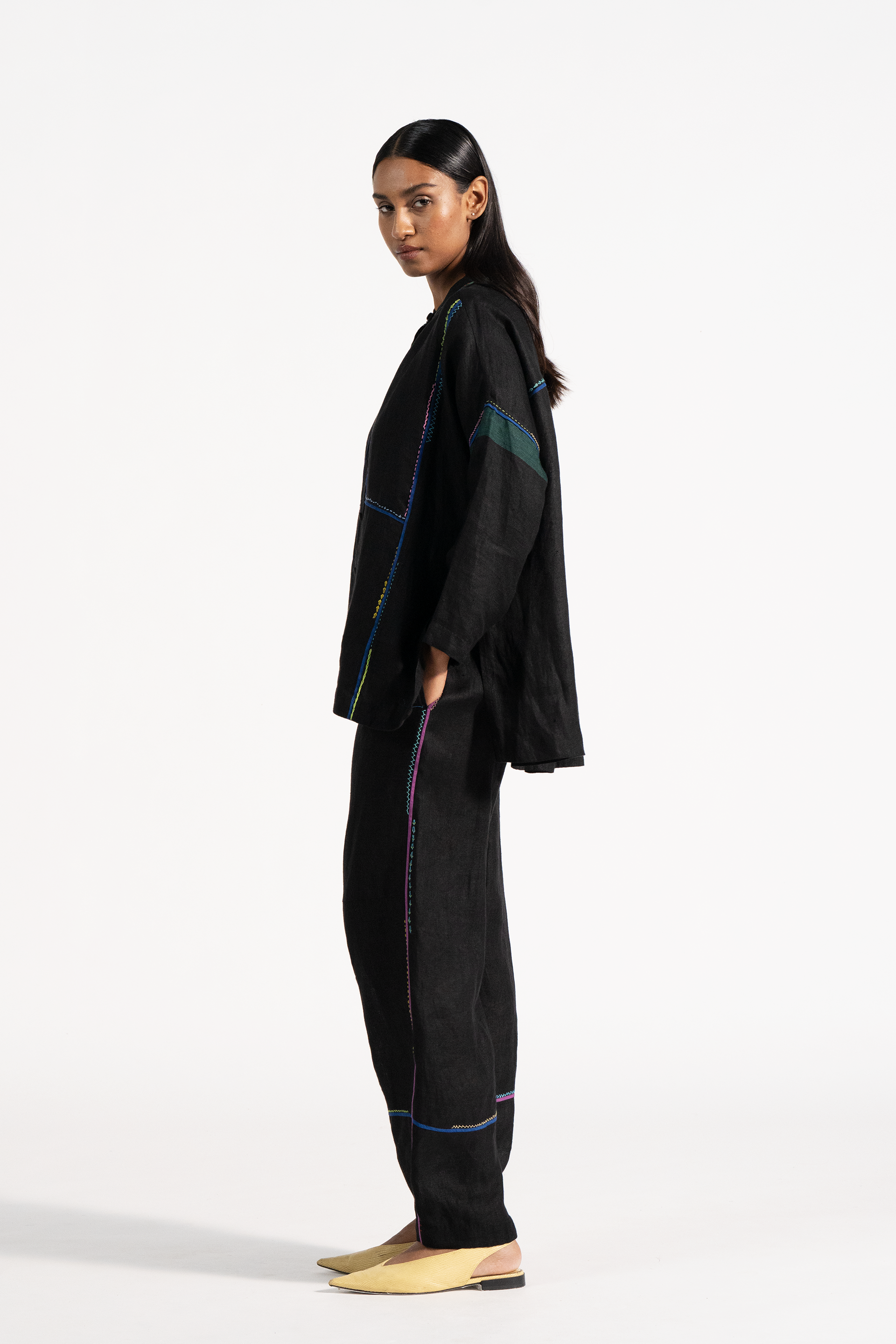 High Low Hem Relaxed Fit Shirt With Multicolor Delicate Hand Stitch Detail In 100% Linen.