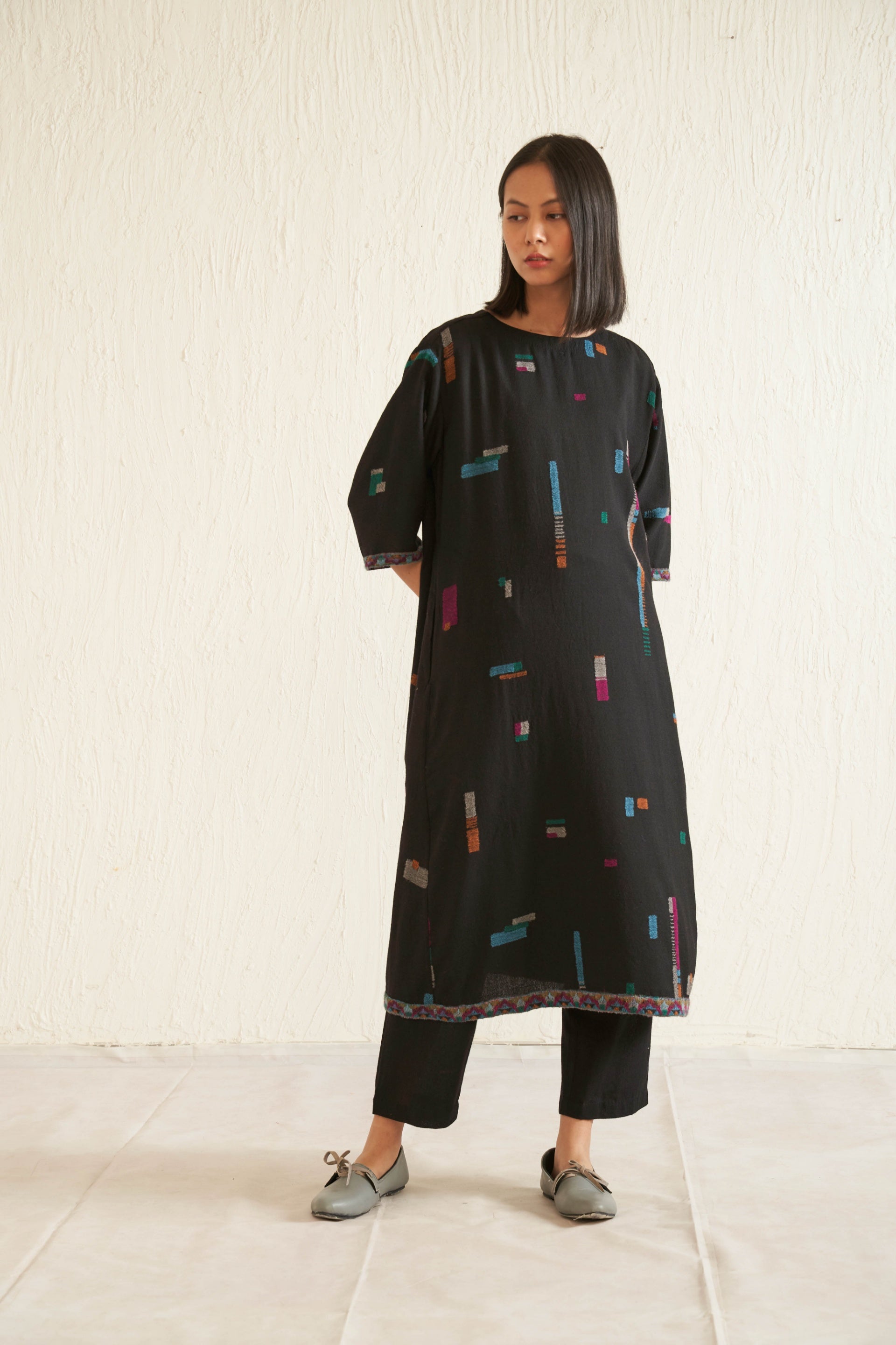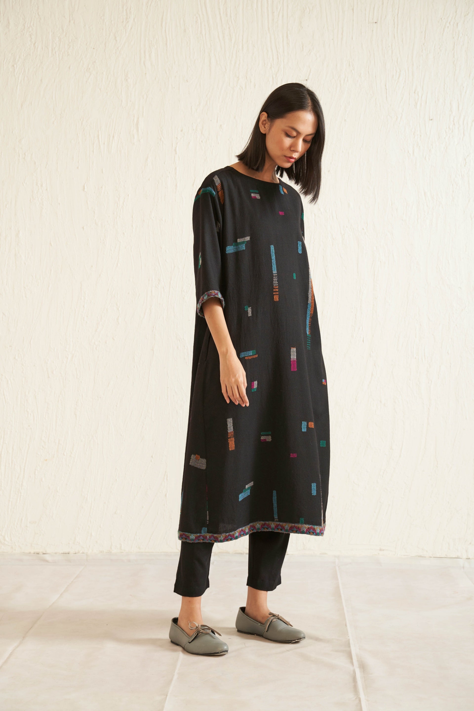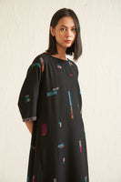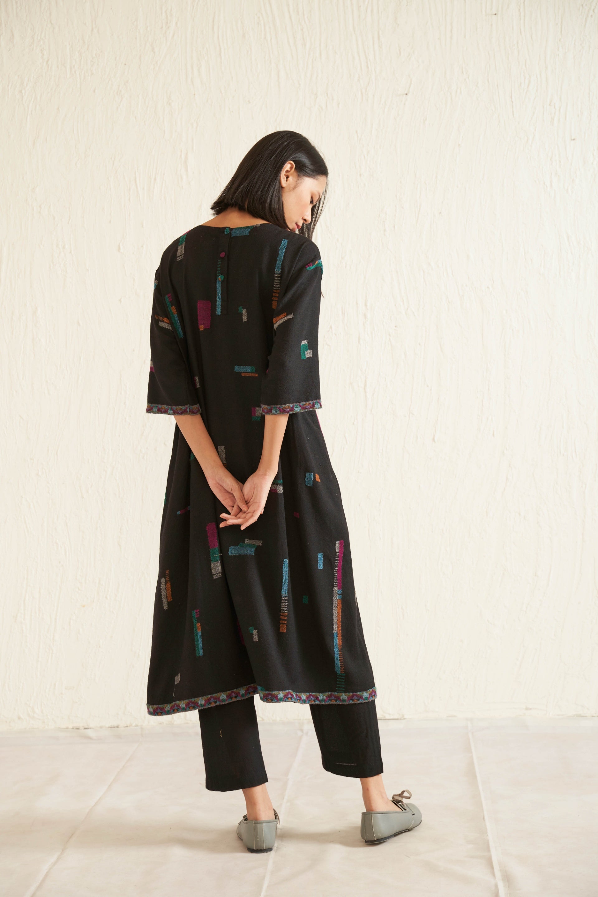 Black straight fit tunic in pure merino wool with centre back placket constructed in all over abstract wool jacquard design