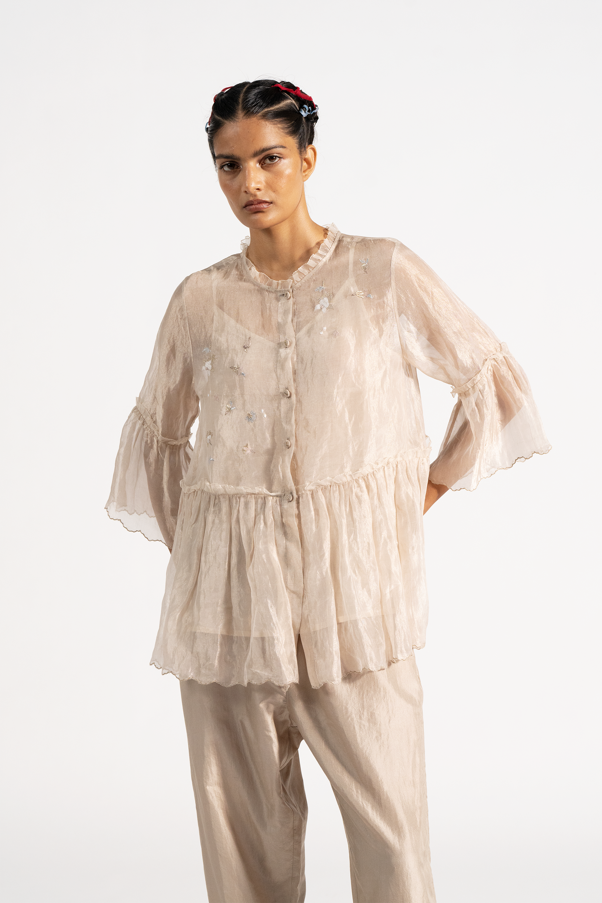 Button down tiered top with gathers in golden tissue. With multicolor floral embroidery. Comes with a complimentary cotton silk lining.