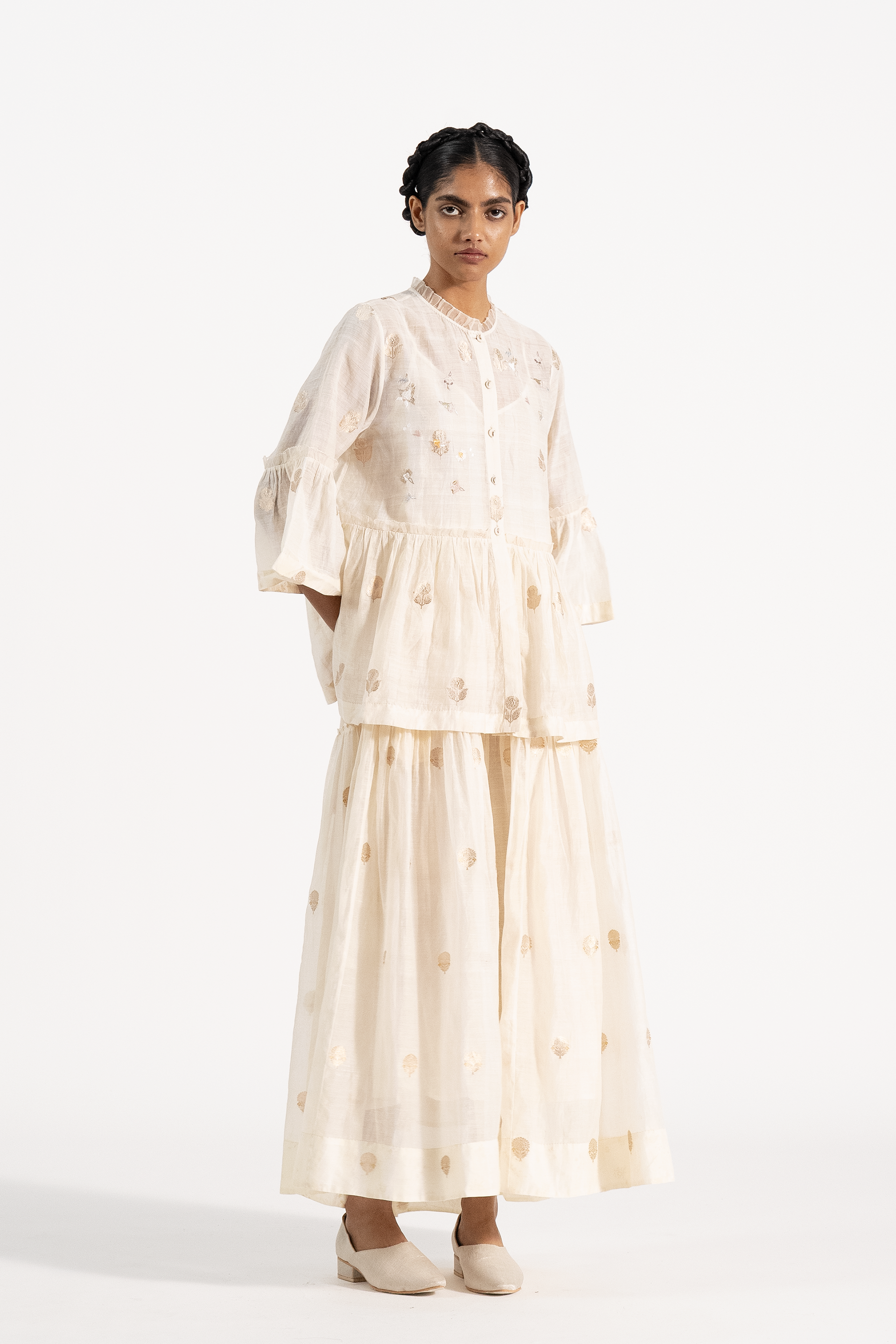 Relaxed Fit, Puff Sleeved Tiered Top With Gathers And A Tie Up Detail And Scalloped Hem. Has Floral Embroidery And Fagotted Seams. Comes With A Seprate Cotton Silk Lining.