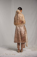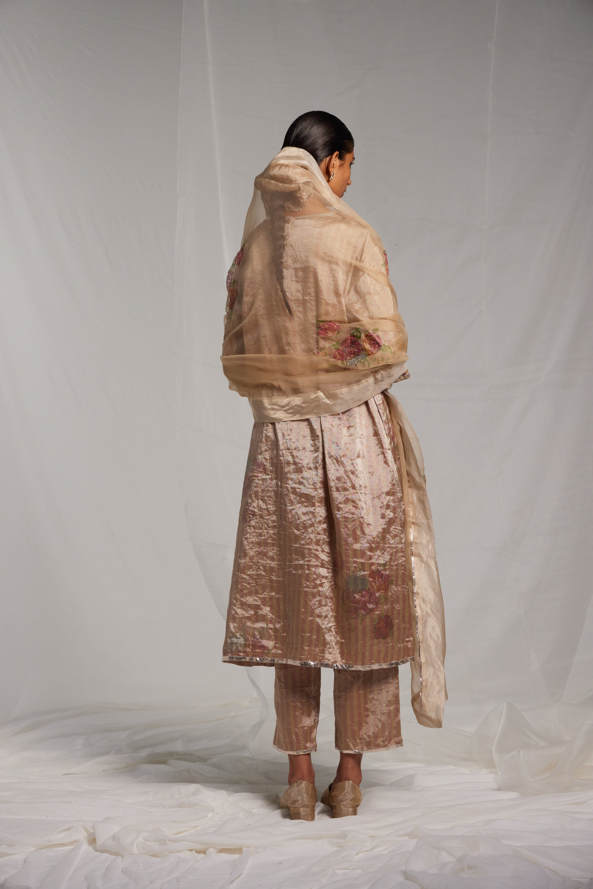 Hand block printed striped semi fitted flare midi length kurta dress in linen zari tissue with hand block printed chunky flowers juxtaposed over the stripes, finished with metallic gota on hemline, sleeves and neckline. Comes along with a pair of straight fit linen zari pants in hand block printed stripes, finished with metallic gota seam detail on the hem.