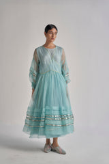 Semi fitted flare midi length dress in hand block printed multicolor diagonal striper with waist tie-up detail. Hand embroidered around the placket and gota embroidery on hem and sleeves.