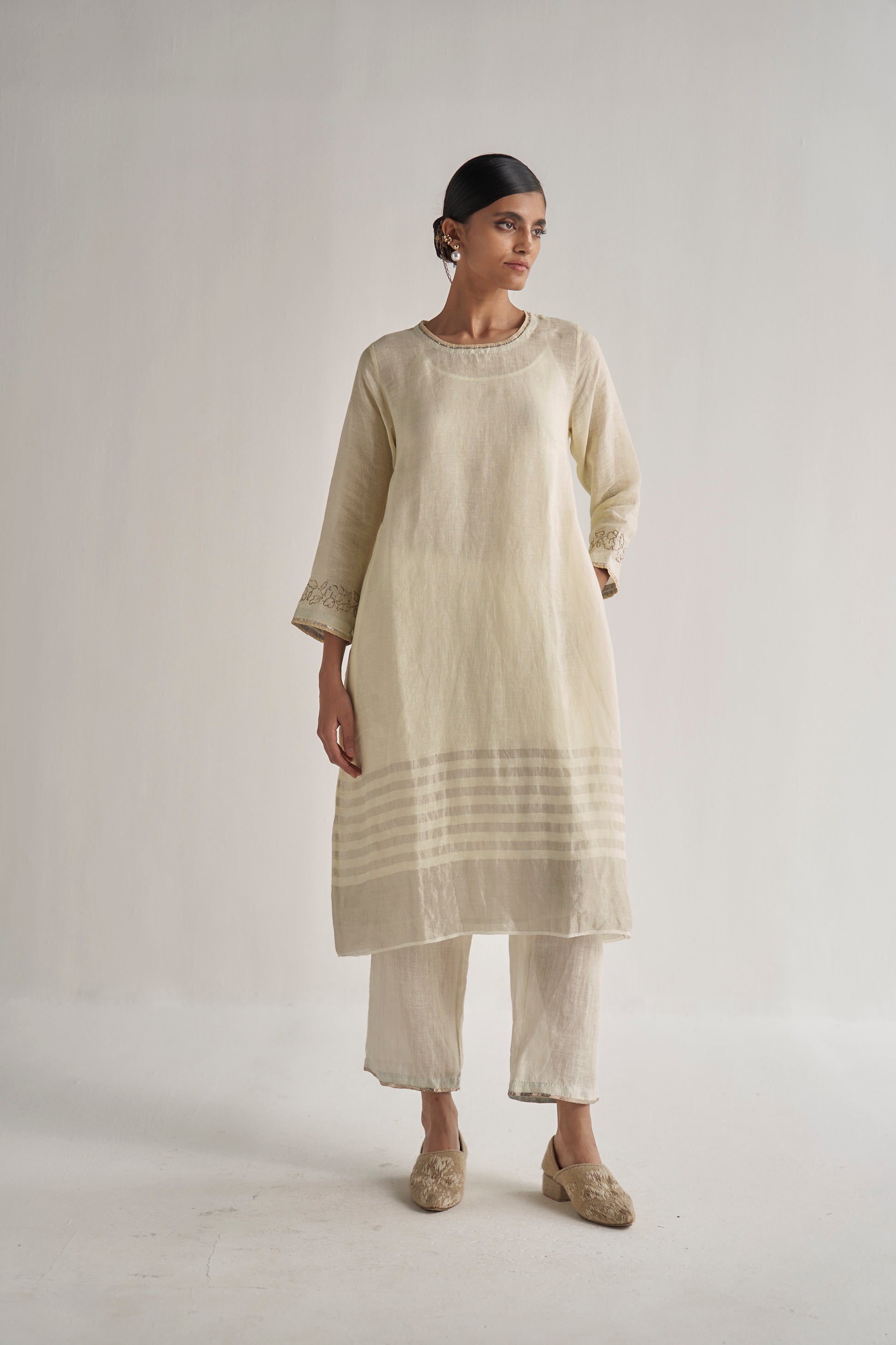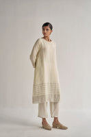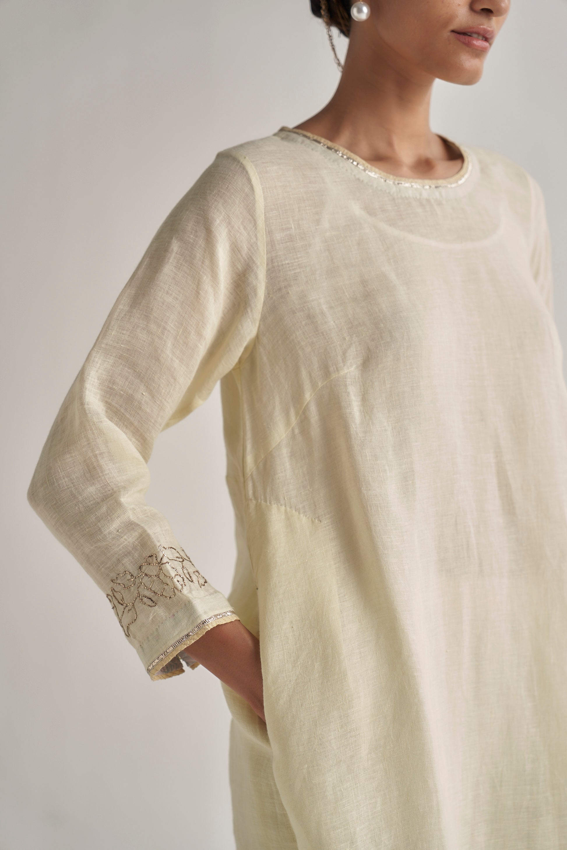 Kurta dress in linen zari with pitta hand embroidery on the sleeves, finished with metallic gota on neckline and sleeves. The zari border on the hem adds a touch of sophistication. Comes along with a pair of straight fit linen zari pants.