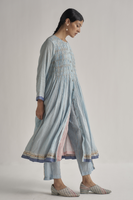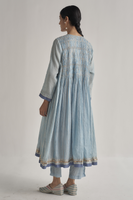 Front open button down dress in handloom cotton silk and zari stripes with contrast zari quilted border detail on hem and sleeves. Finished with exquisite hand smocking at the front and metallic gota seams. Comes along with an attached hand block printed kota doriya lining. 3 cm length of border in sleeves and hem.