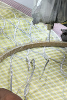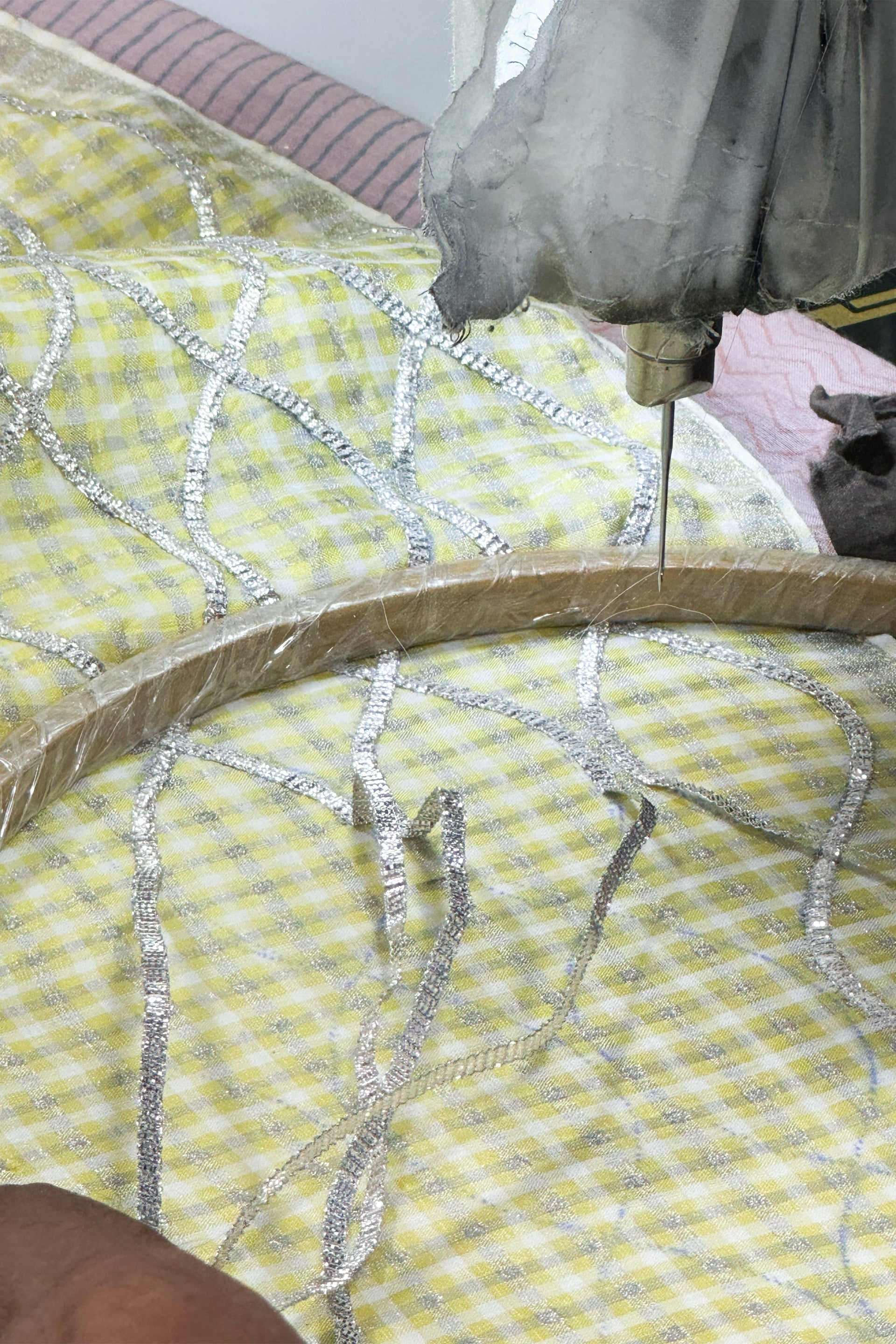 Gathered tiered dress with tie-up detail on the waist and delicate hand pitta embroidery on the front and sleeves. Fits away from the body flare midi length dress. Finished with metallic gota details on the sleeves and hemline . Comes along with a separate cotton silk lining.
