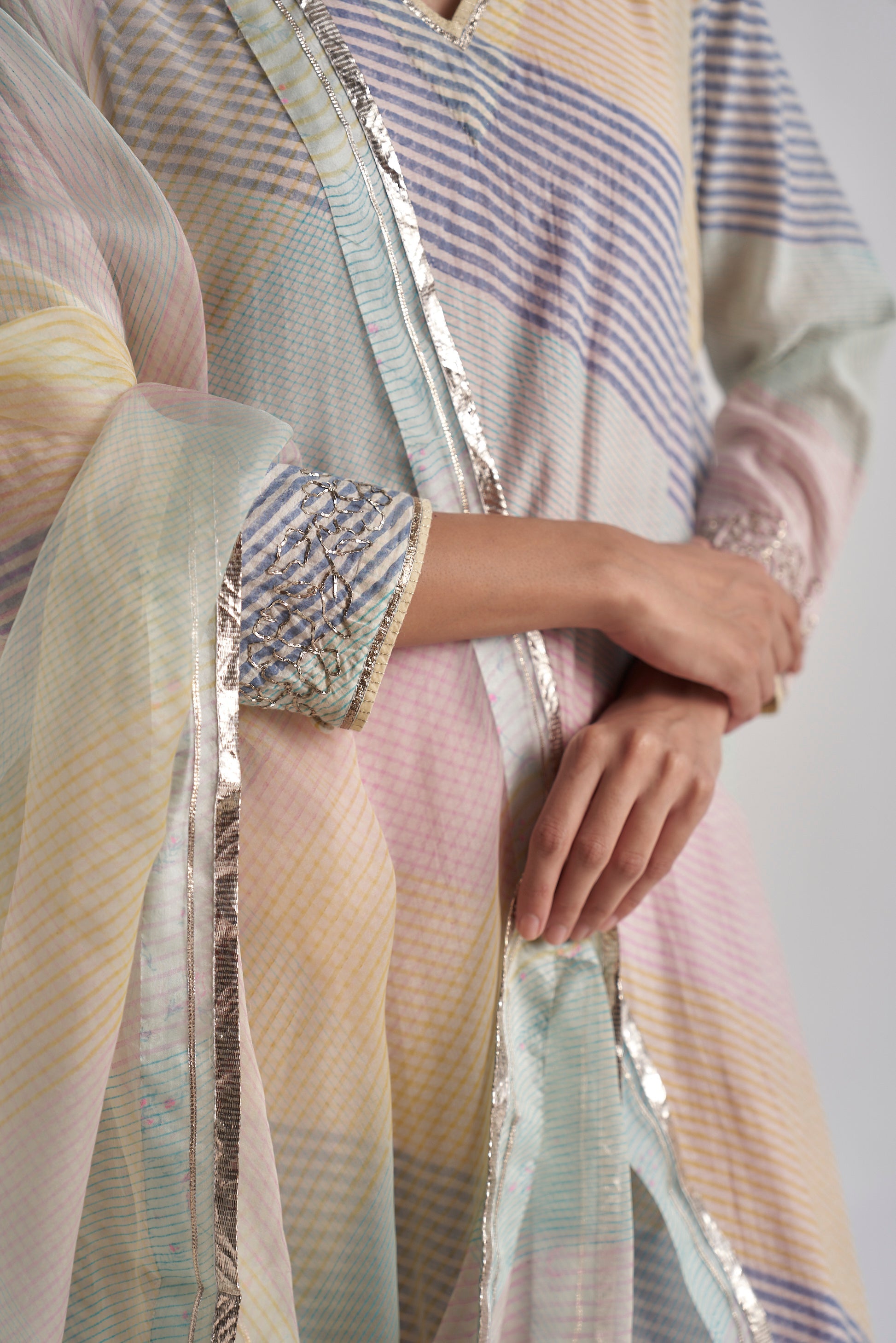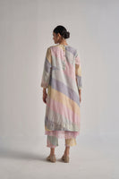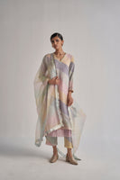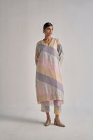 V-neck kurta dress in handloom cotton silk with pitta hand embroidery on the sleeves, finished with metallic gota on neckline and sleeves. The zari border on the hem adds a touch of sophistication. Comes along with a pair of straight fit hand block printed cotton silk pants.
