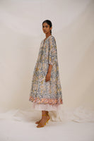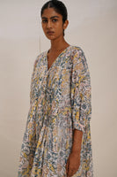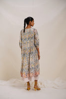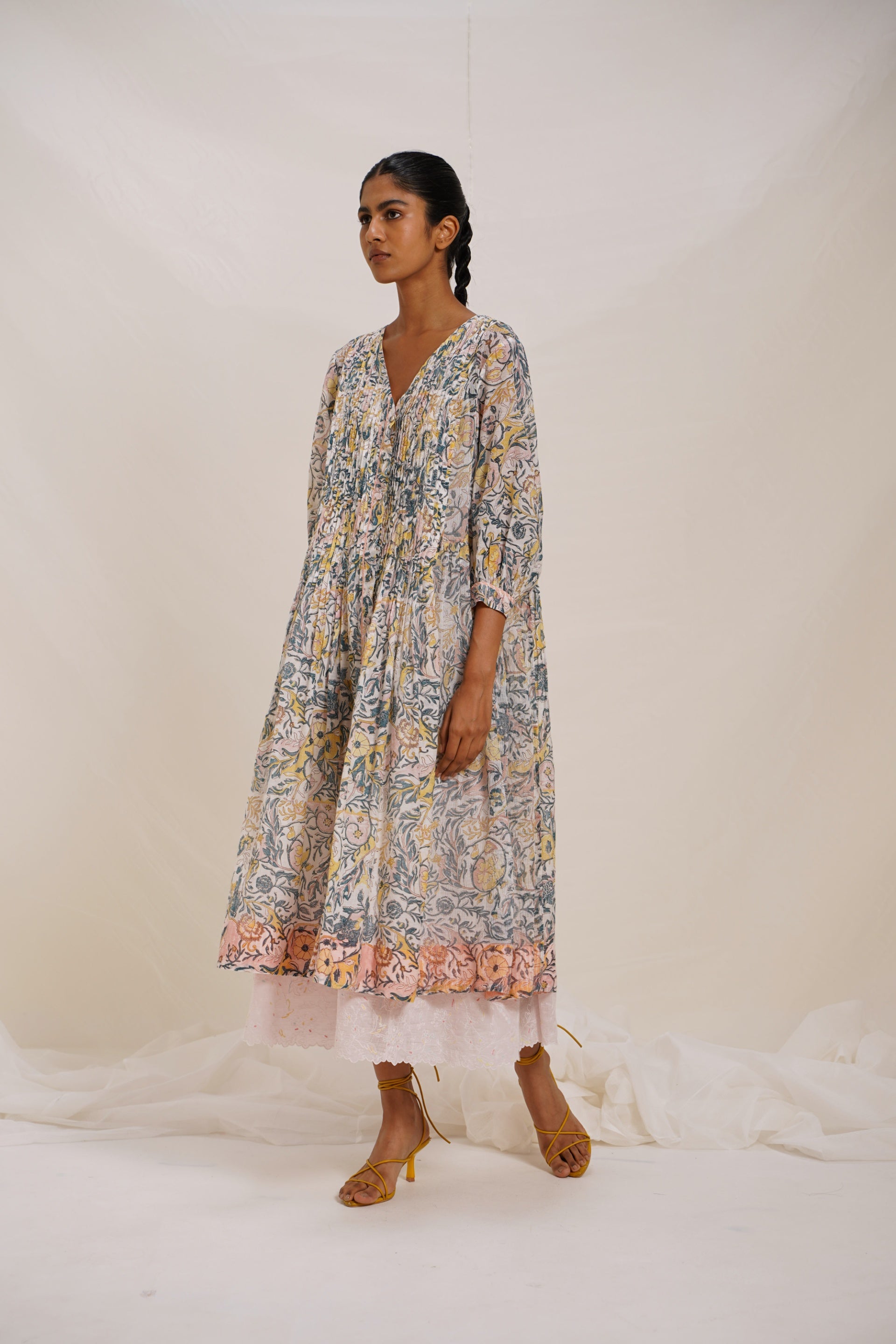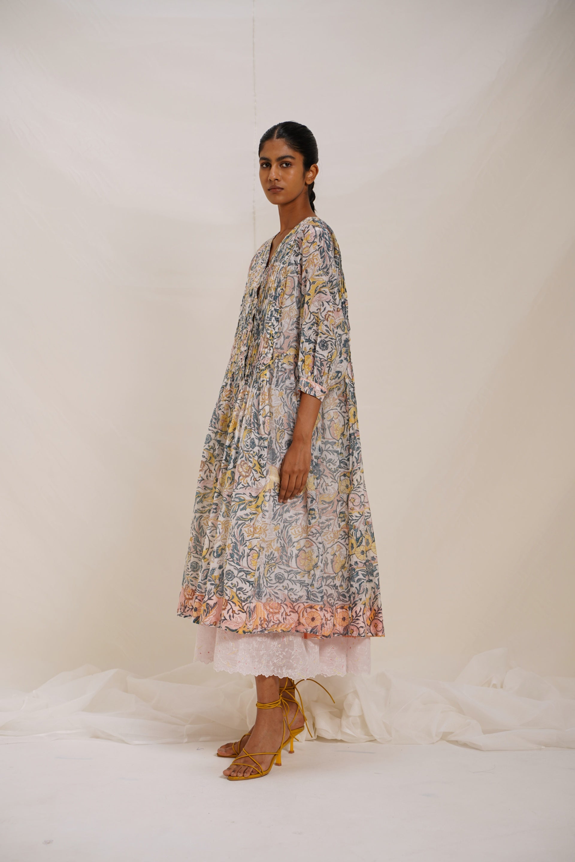 Midi front open button down dress with all round pintucks in all over floral hand block print.