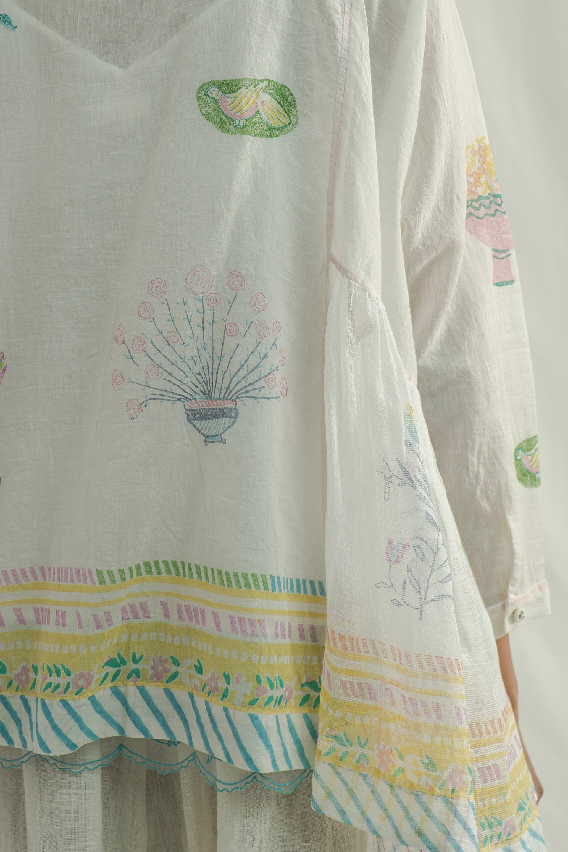 A relaxed-fit stand collar top with a front placket , featuring gathered kota on the sides. Crafted from a multi-color handblock printed cotton-silk blend, with an all-over placement print . Comes with a separate cotton silk lining .