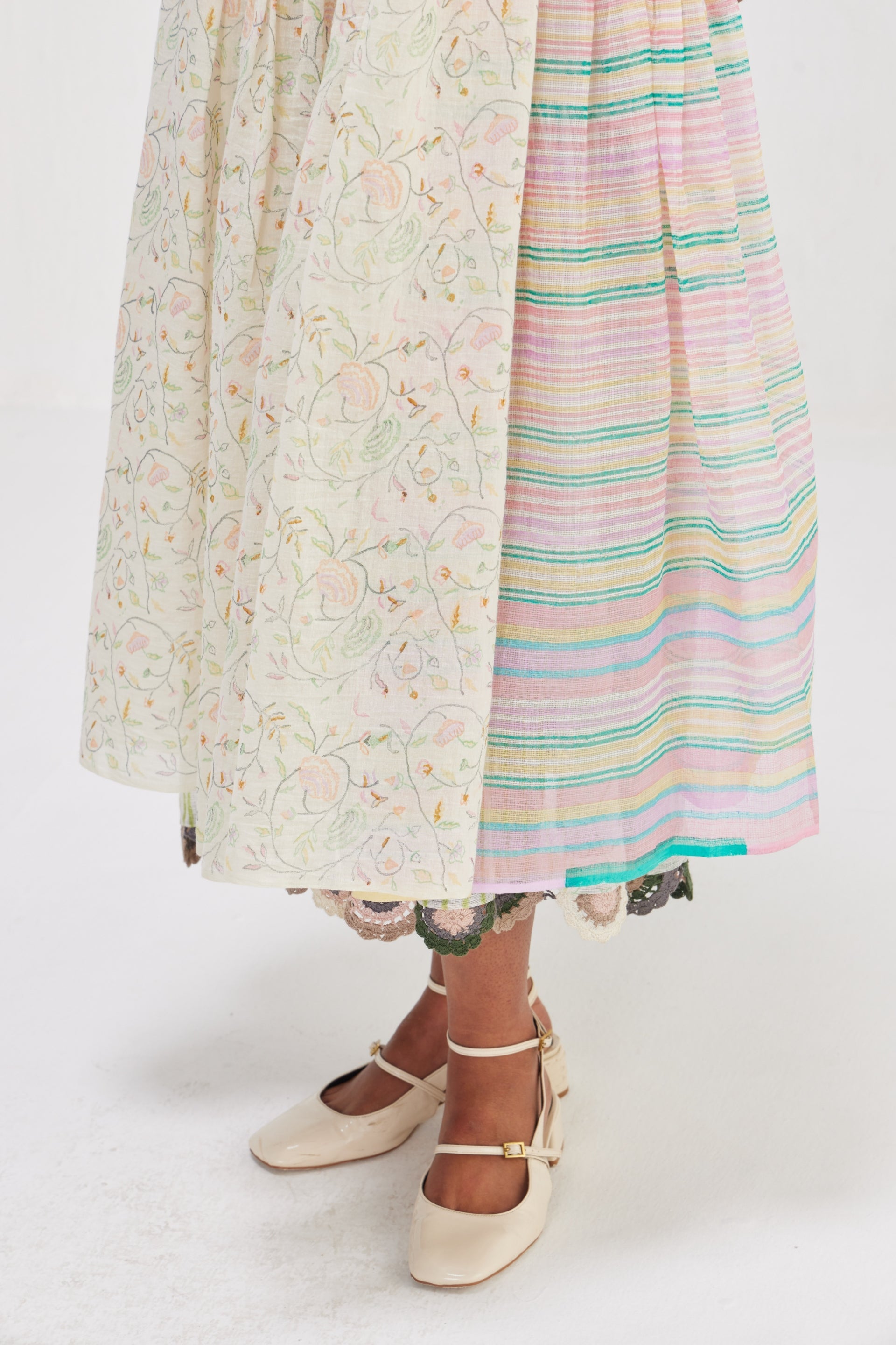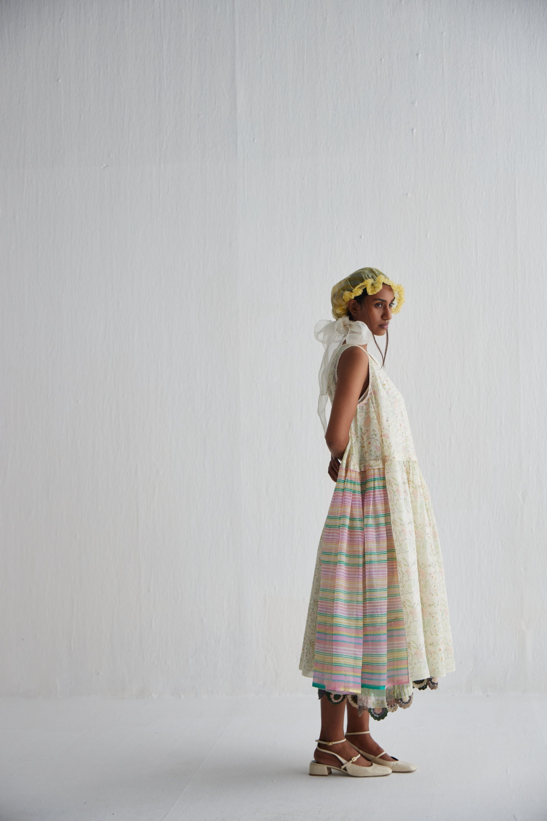 Sleeveless dress, adorned in all-over hand block floral bird print contrasted beautifully with multicolor stripes on Kota Doriya fabric. Lightweight and breathable fabric ensure comfort throughout the day, while the included lining adds a perfect finish.