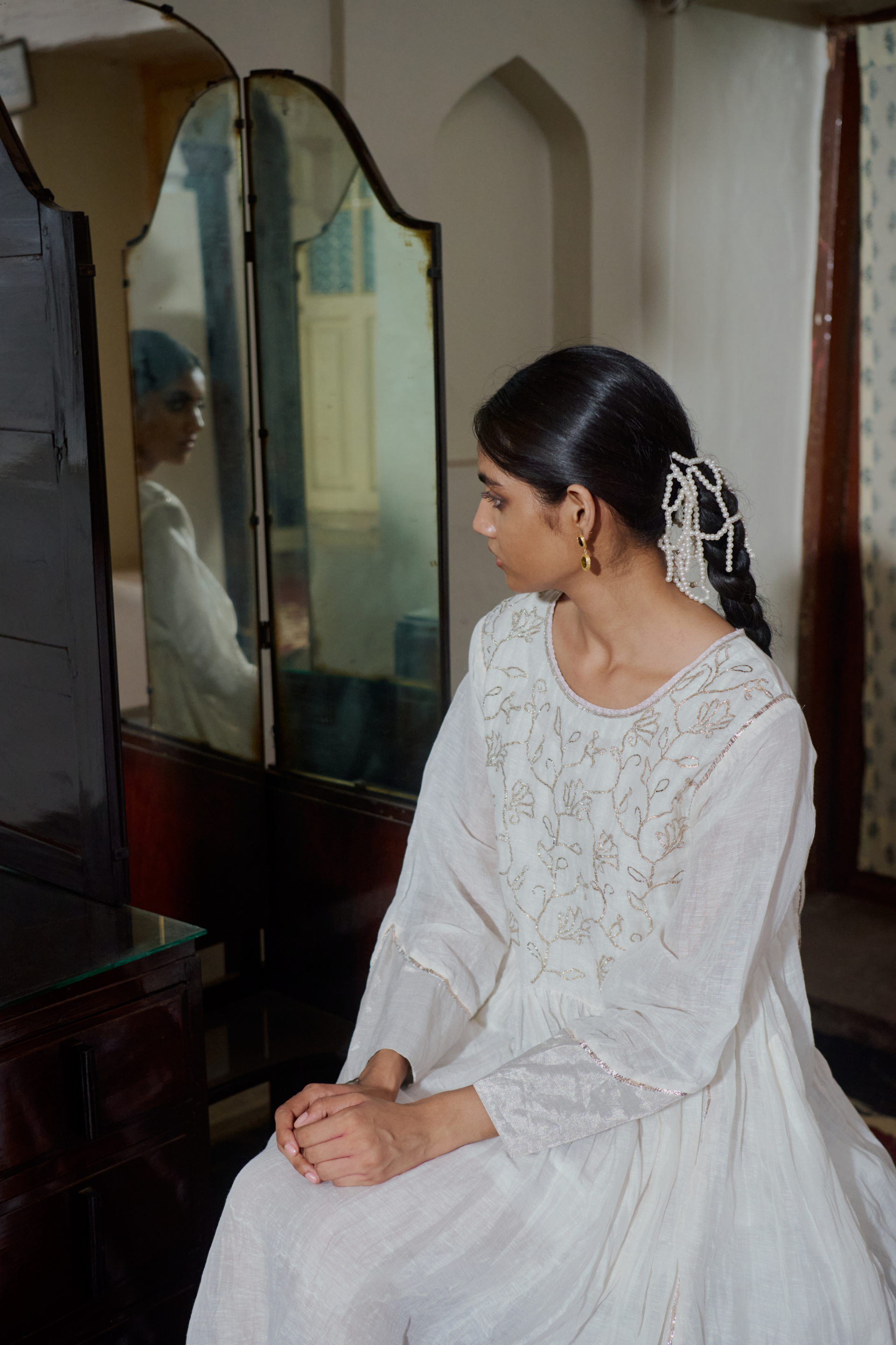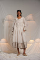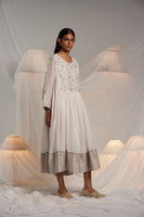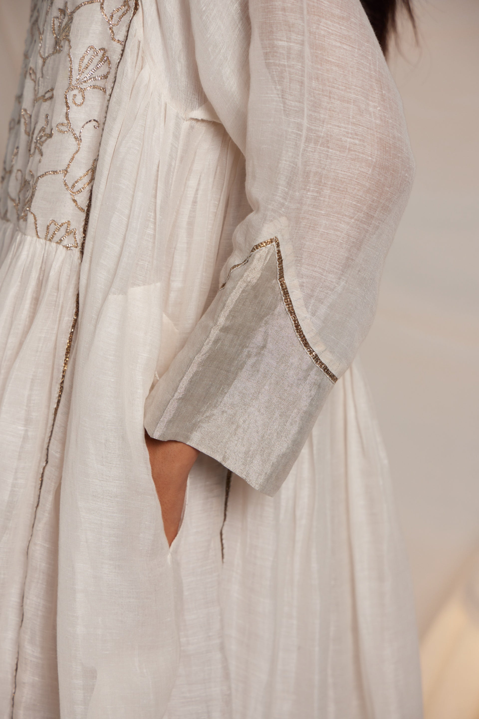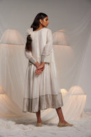 A silk linen gathered kurta dress fits away from the body flare midi length dress. With intricate gota embroidered motifs on the yoke. silver linen zari tissue finishes the hem and sleeves with metallic gota joineries. Comes along with a separate cotton silk lining.
