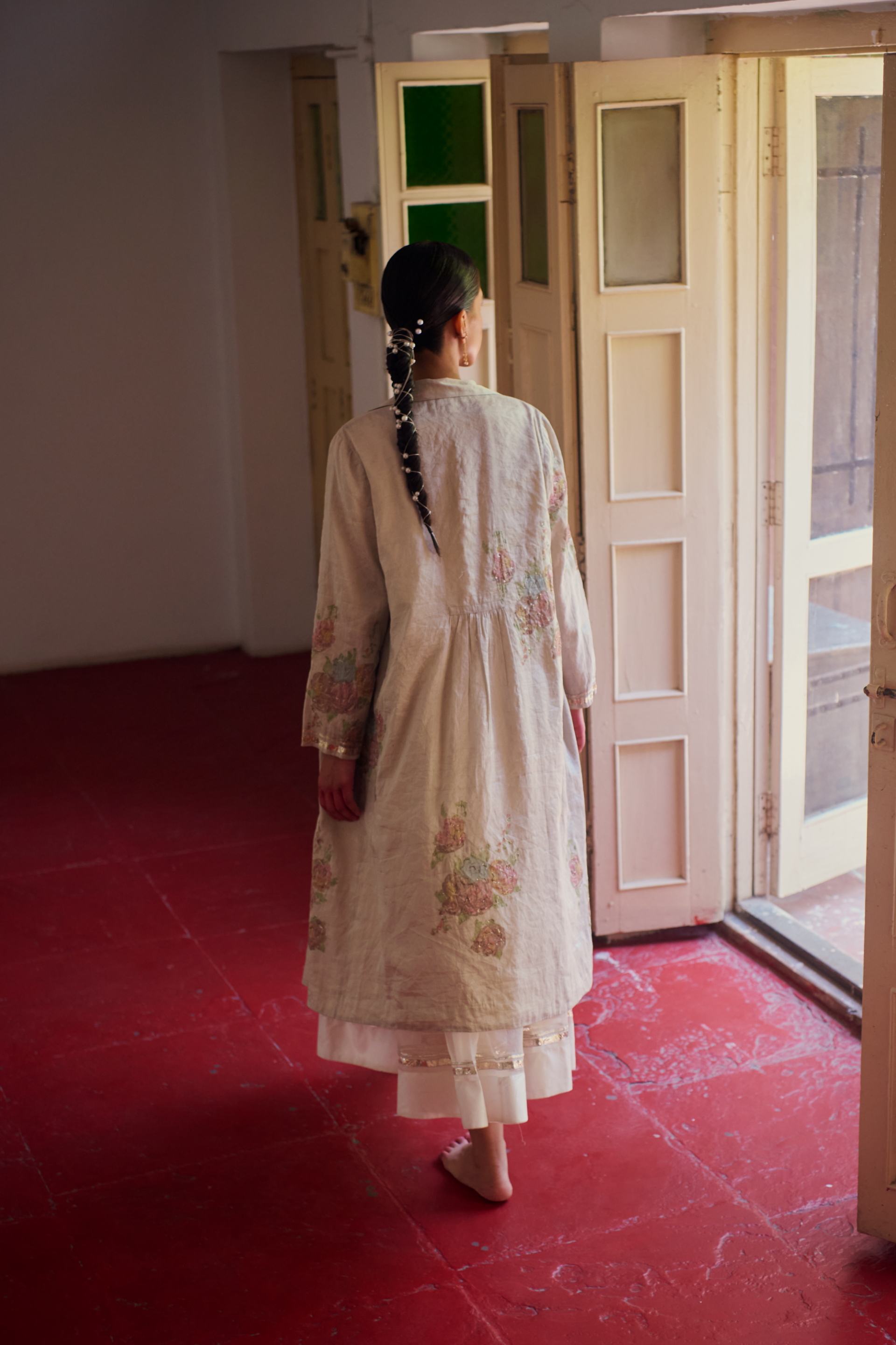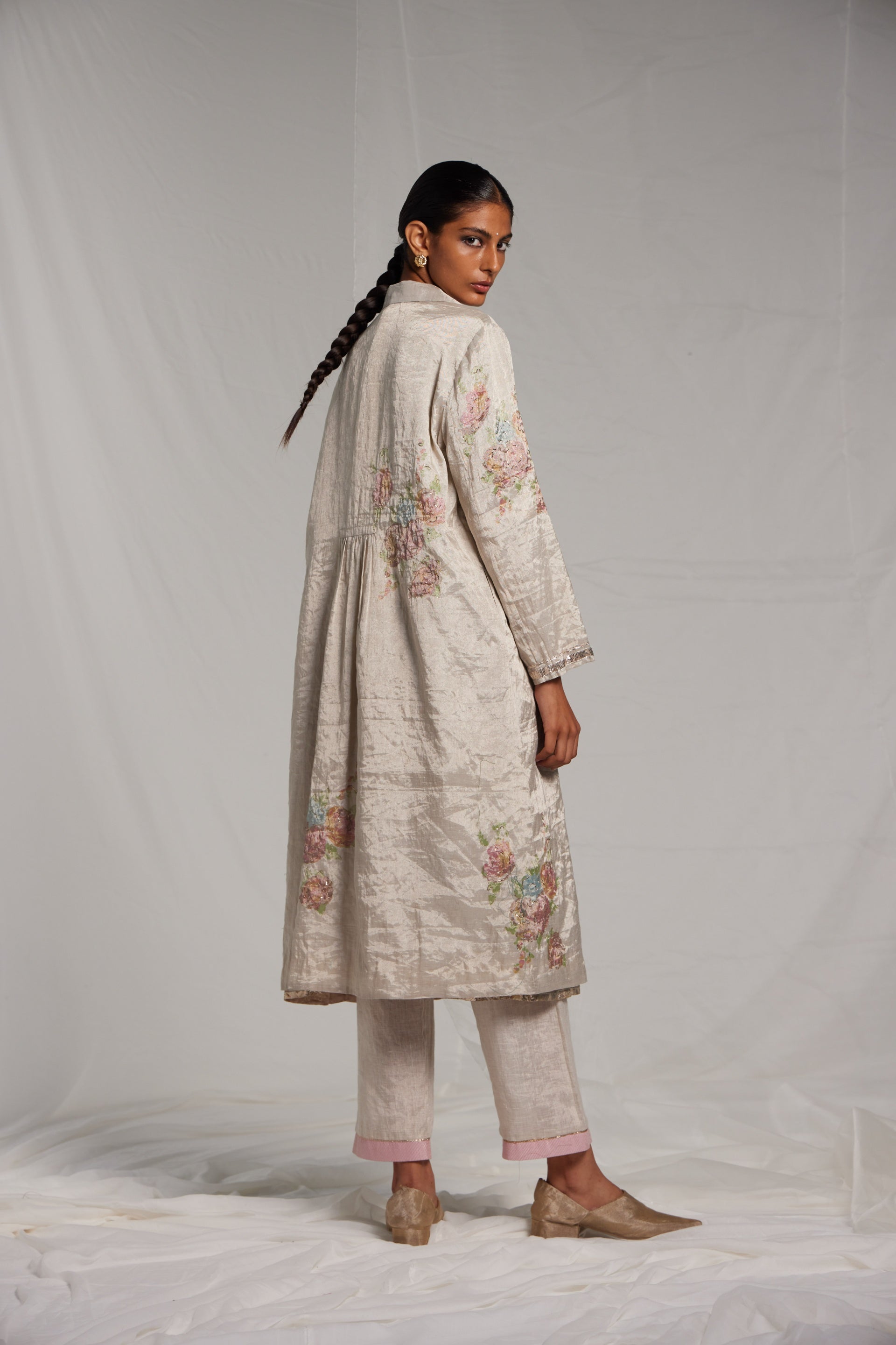 Semi fitted, midi length jacket, with hand block printed chunky flowers embellished with hand embroidered pitta work. Finished with metallic gota highlights on sleeves and notch collar.