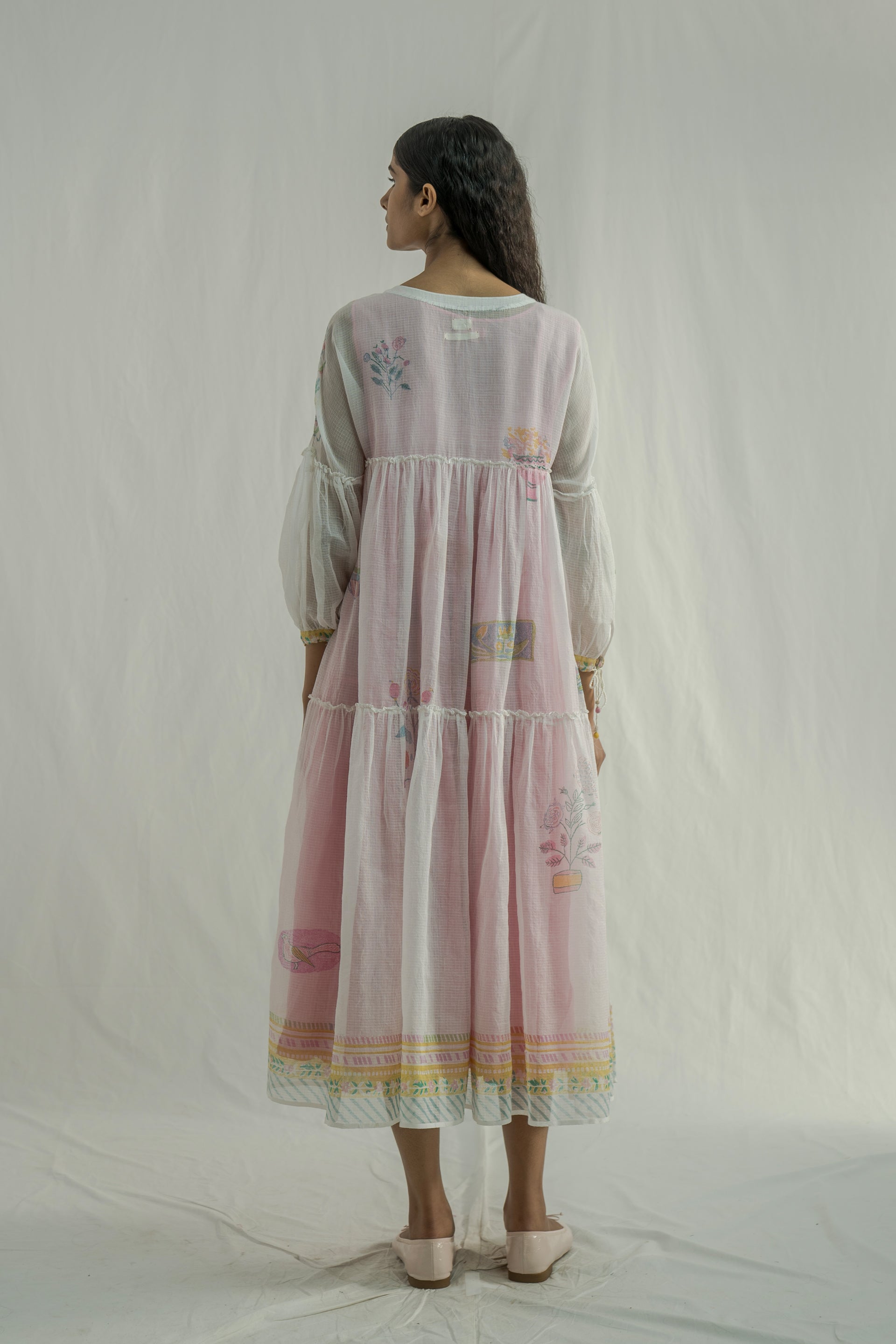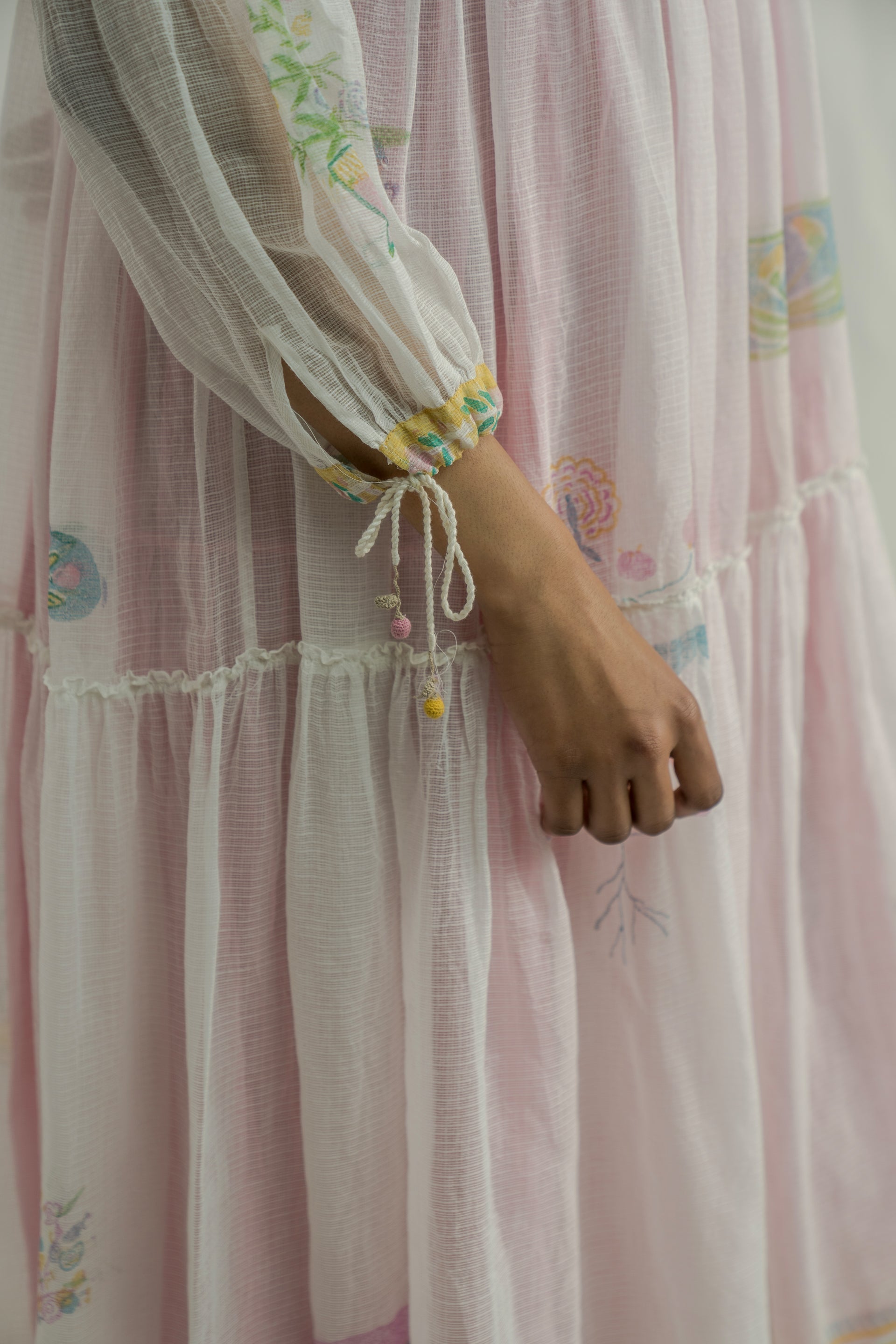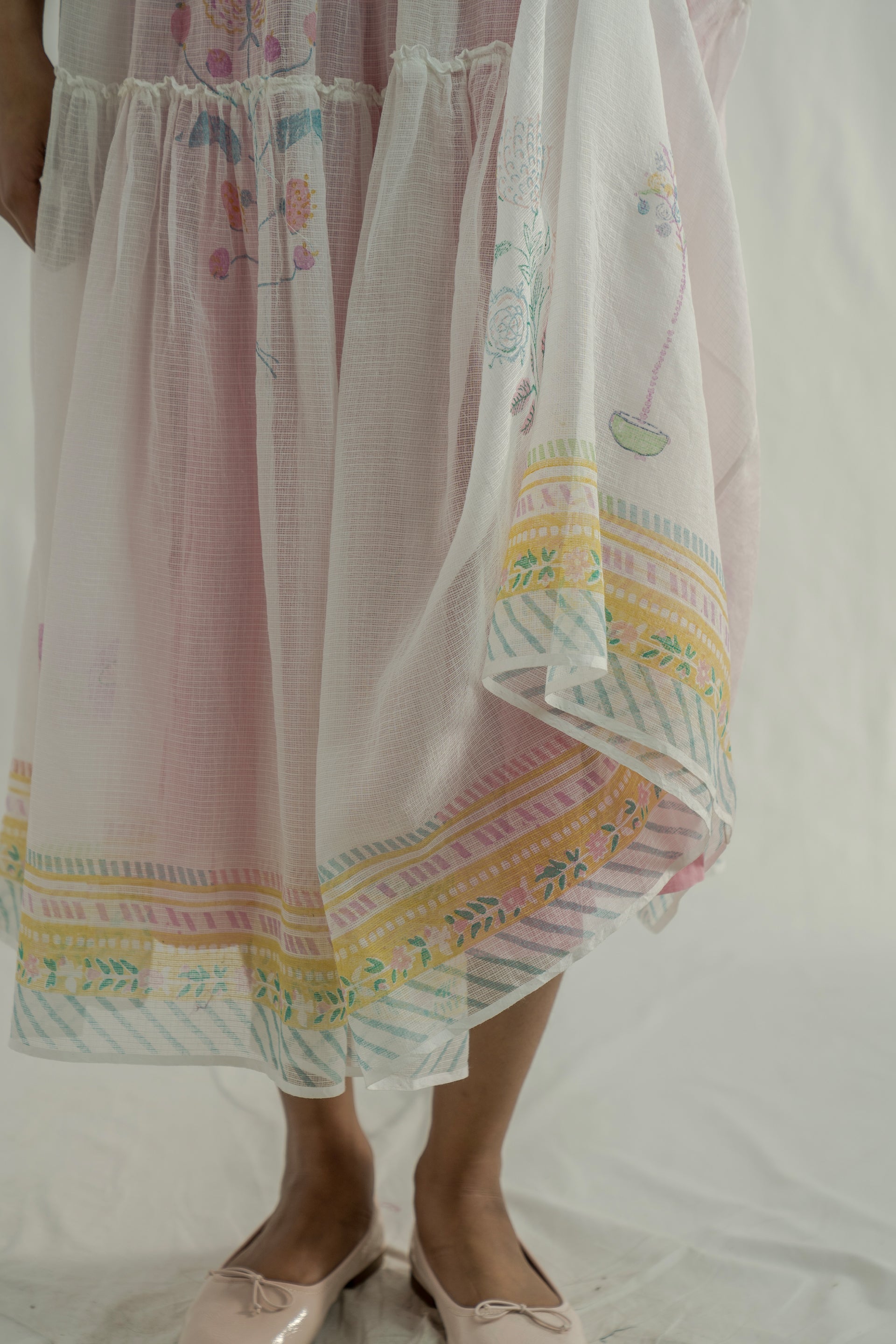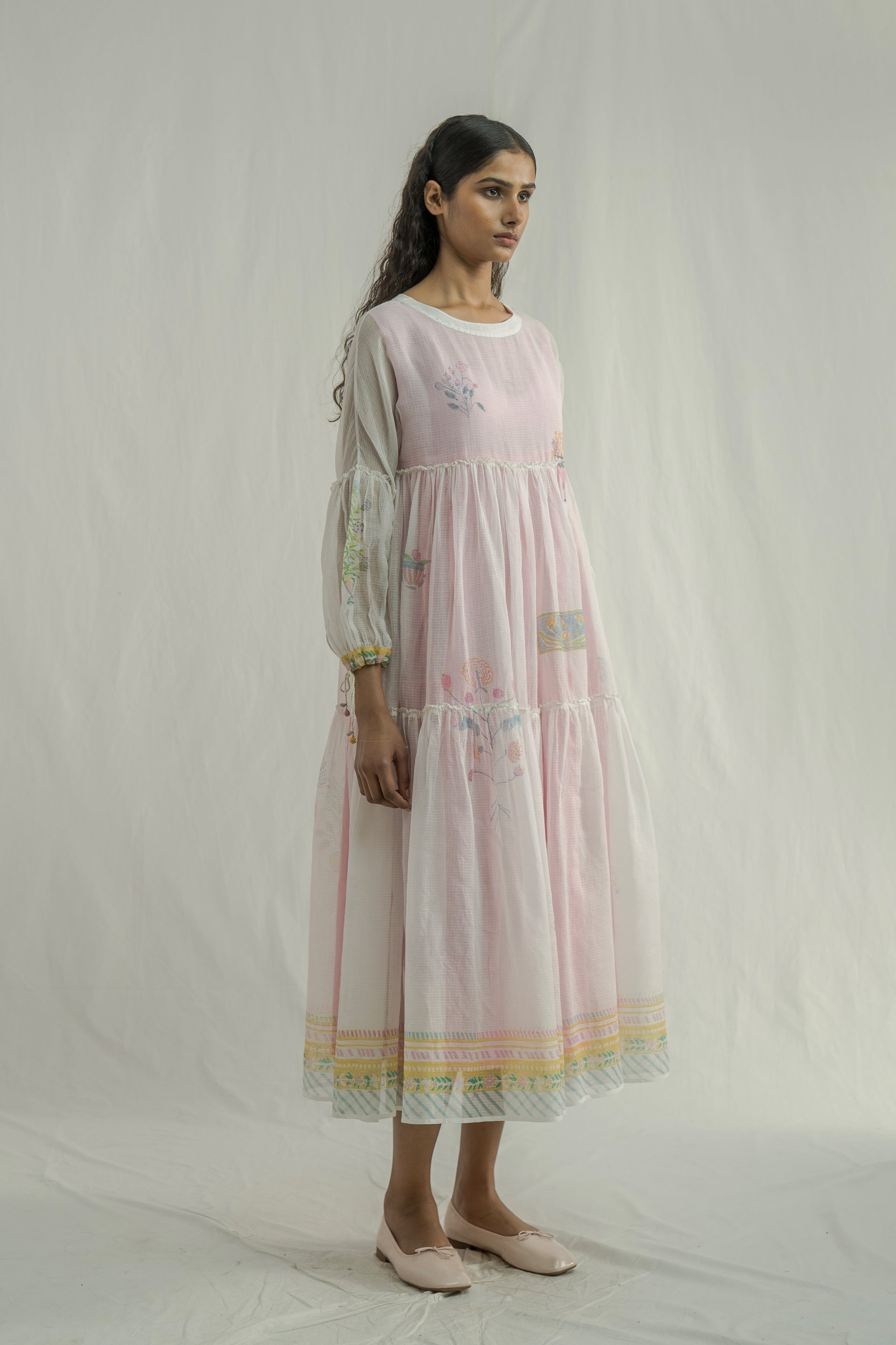 A gathered maxi dress featuring tie-up details on the sleeves, crafted from multicolor handblock-printed border and all-over placement print kota fabric. Comes with a separate handblock-printed striped cotton-silk lining.